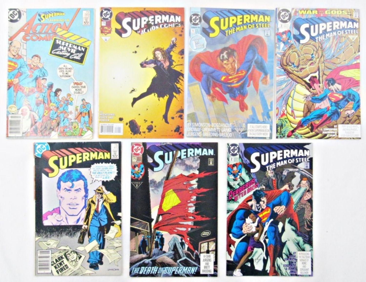 1991 #1 thru #3 SUPERMAN THE MAN OF STEEL, 1995 #710 SUPERMAN, 1993 #75 DEATH OF SUPERMAN, 1985 #410 SUPERMAN & 1985 #569 ACTION COMICS – ALL NICE CONDITION