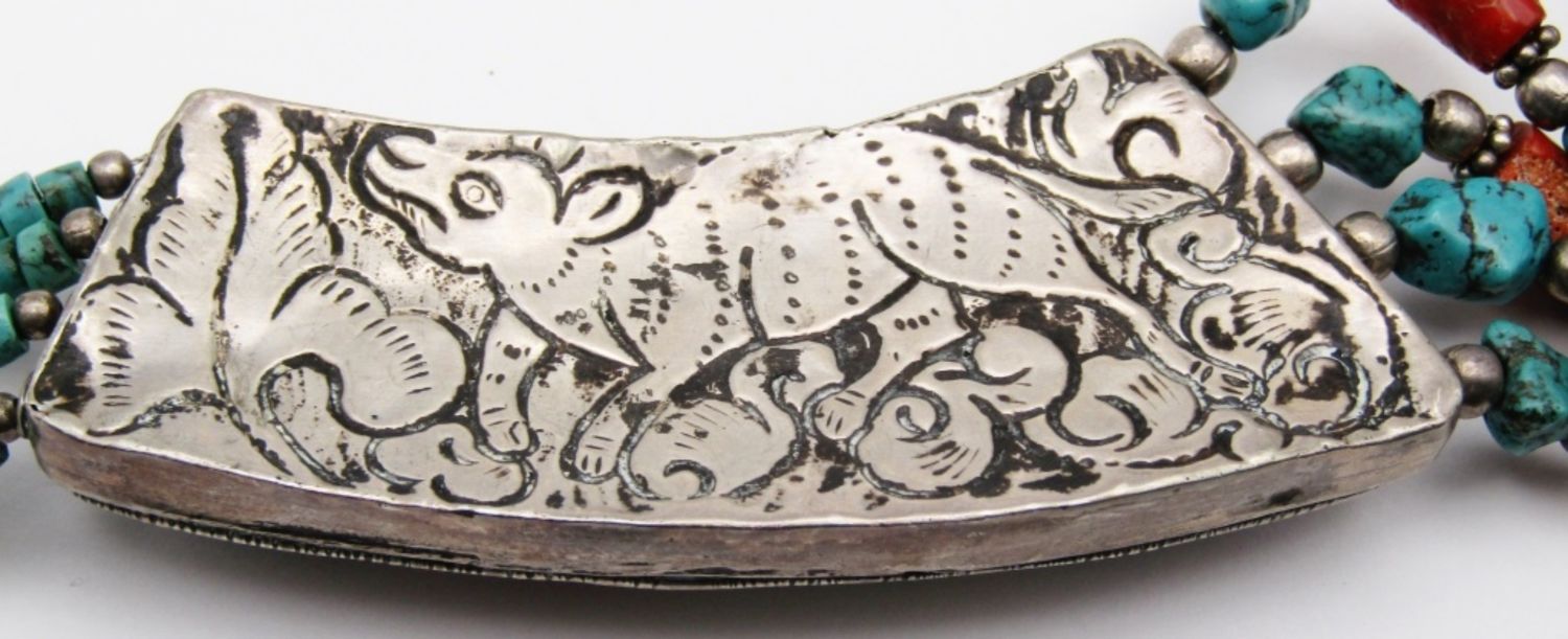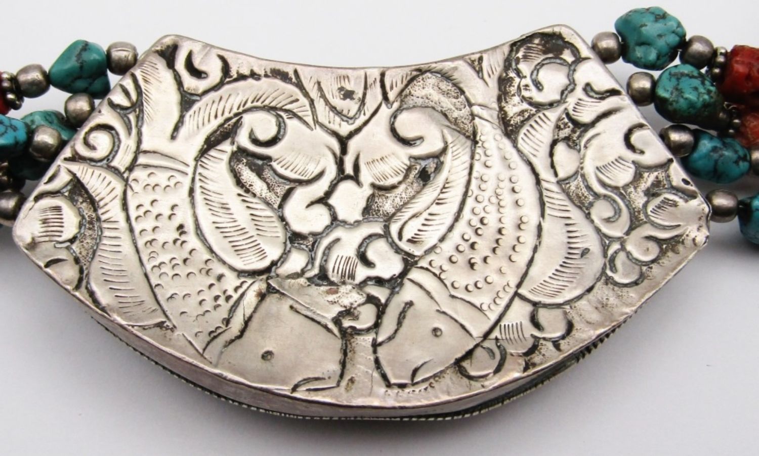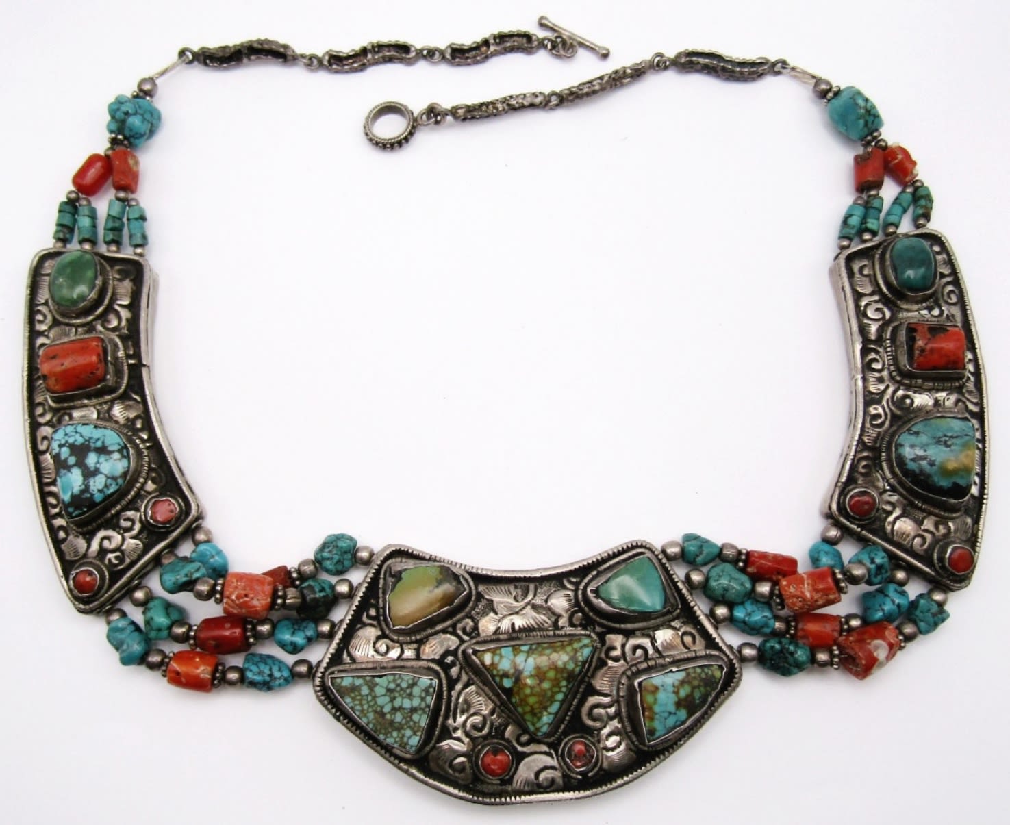 CORAL AND TURQUOISE BEADED STERLING NECKLACE-MEASURES 22.5 INCHES-TOTAL 120 DWT