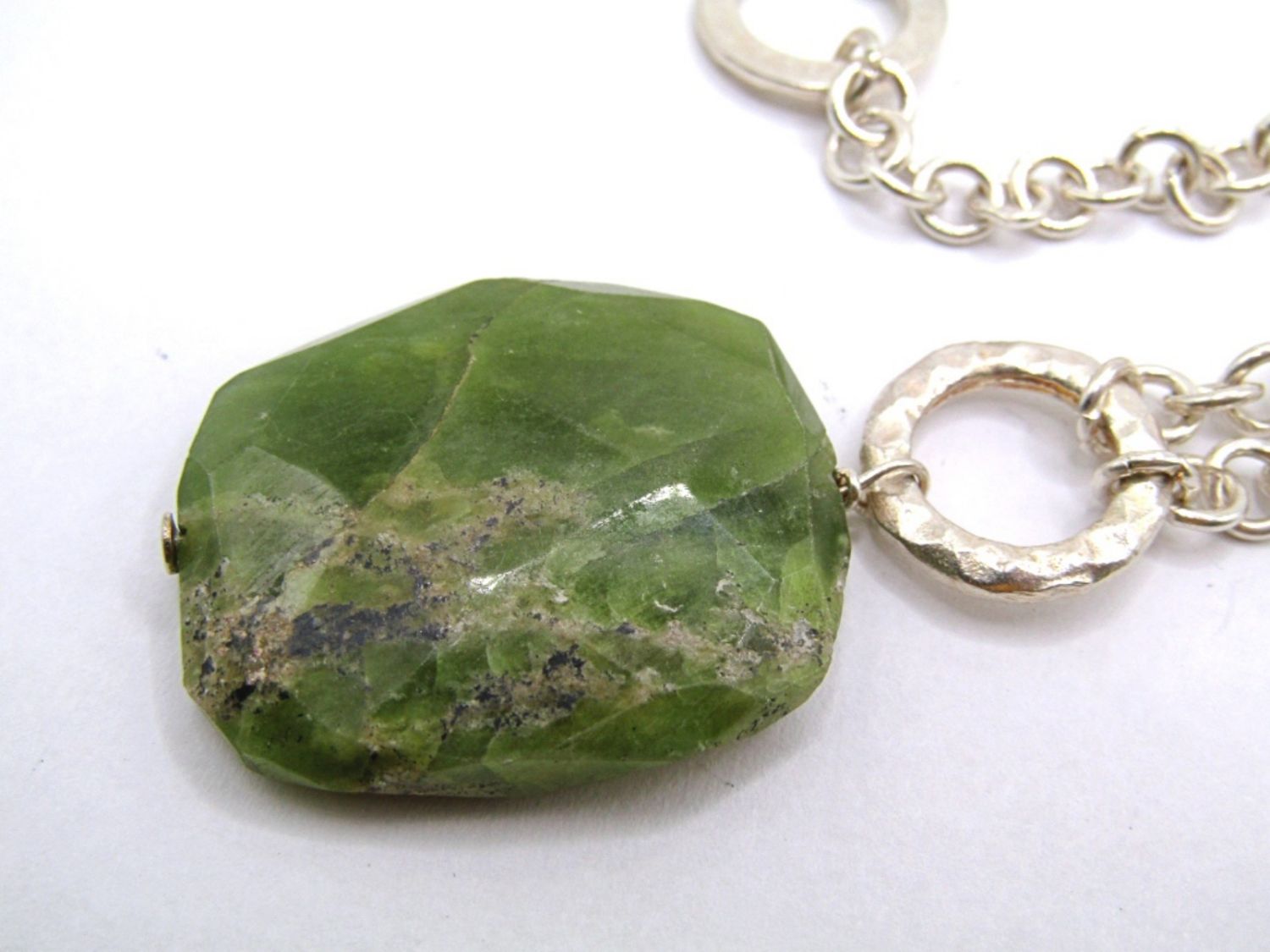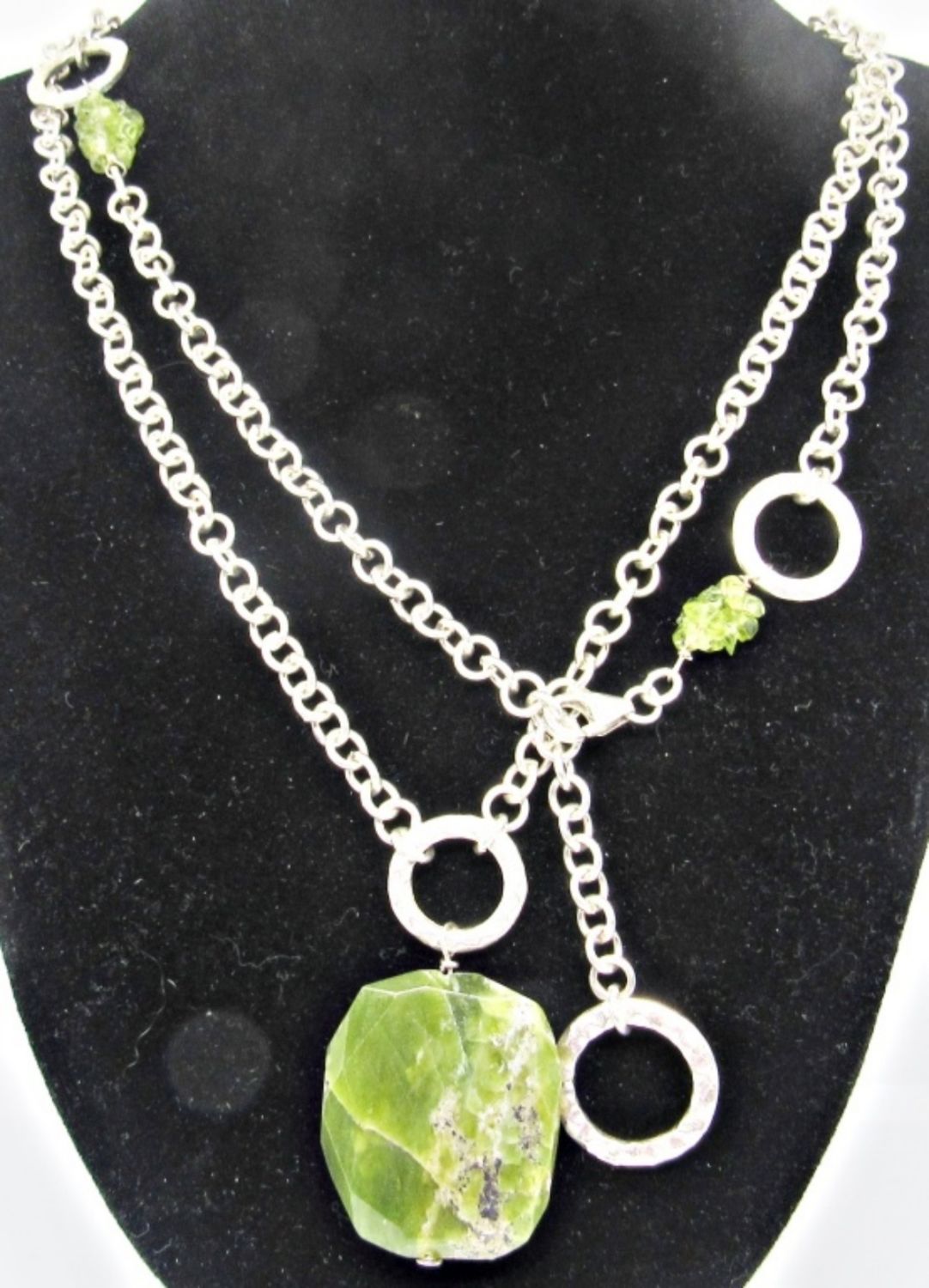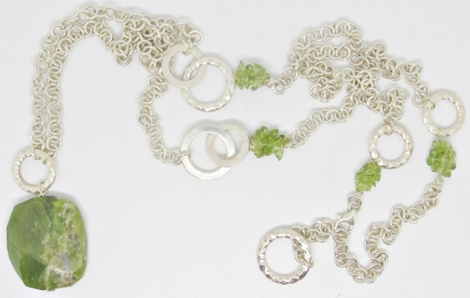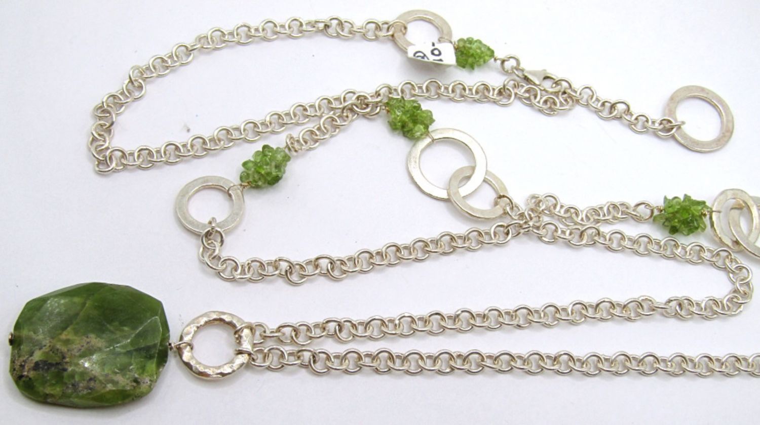 33 dwt, 33in in length, stamped 925 on clasp,Clear green stones are clustered around the necklace with a green pendant at the end