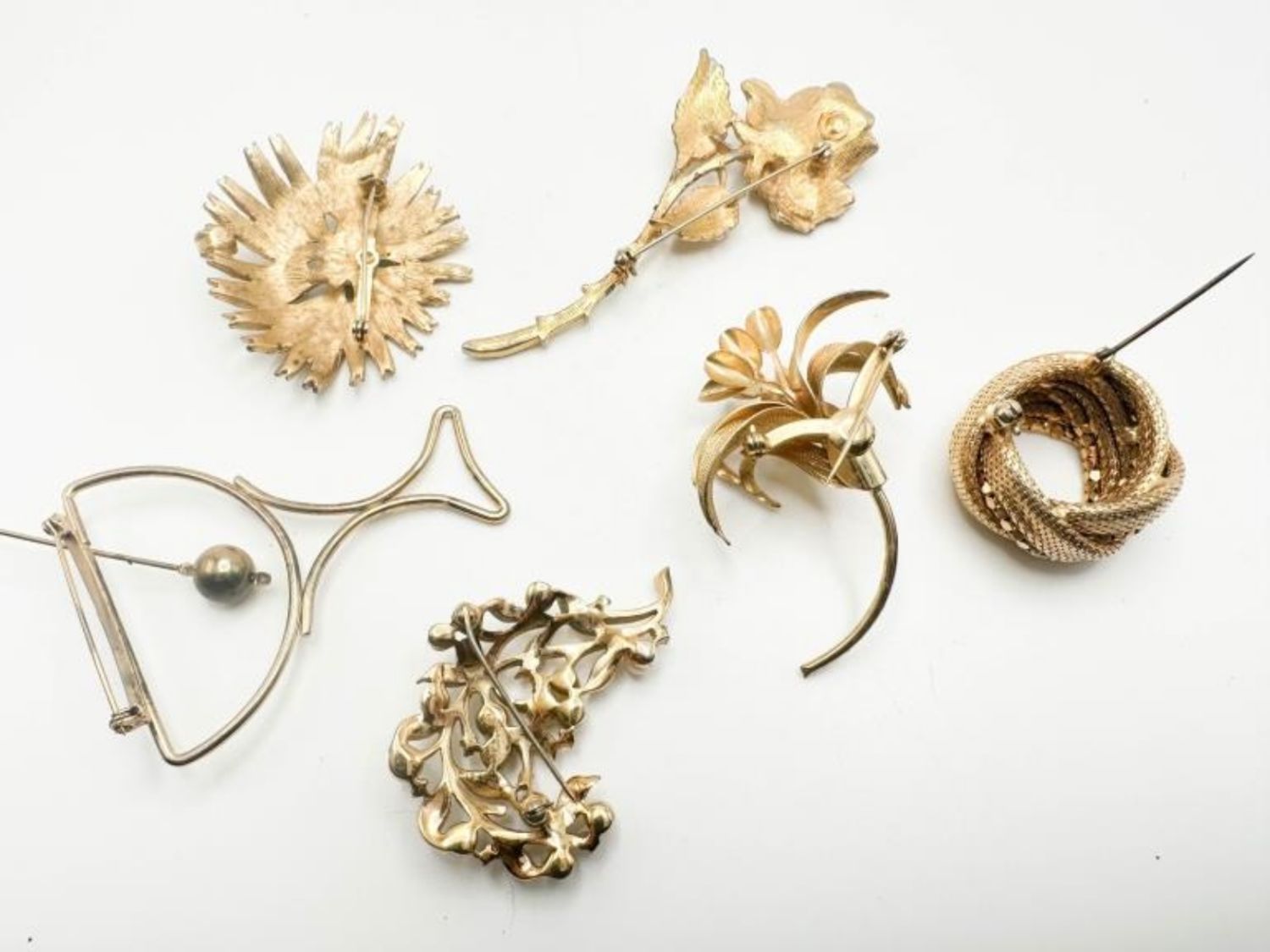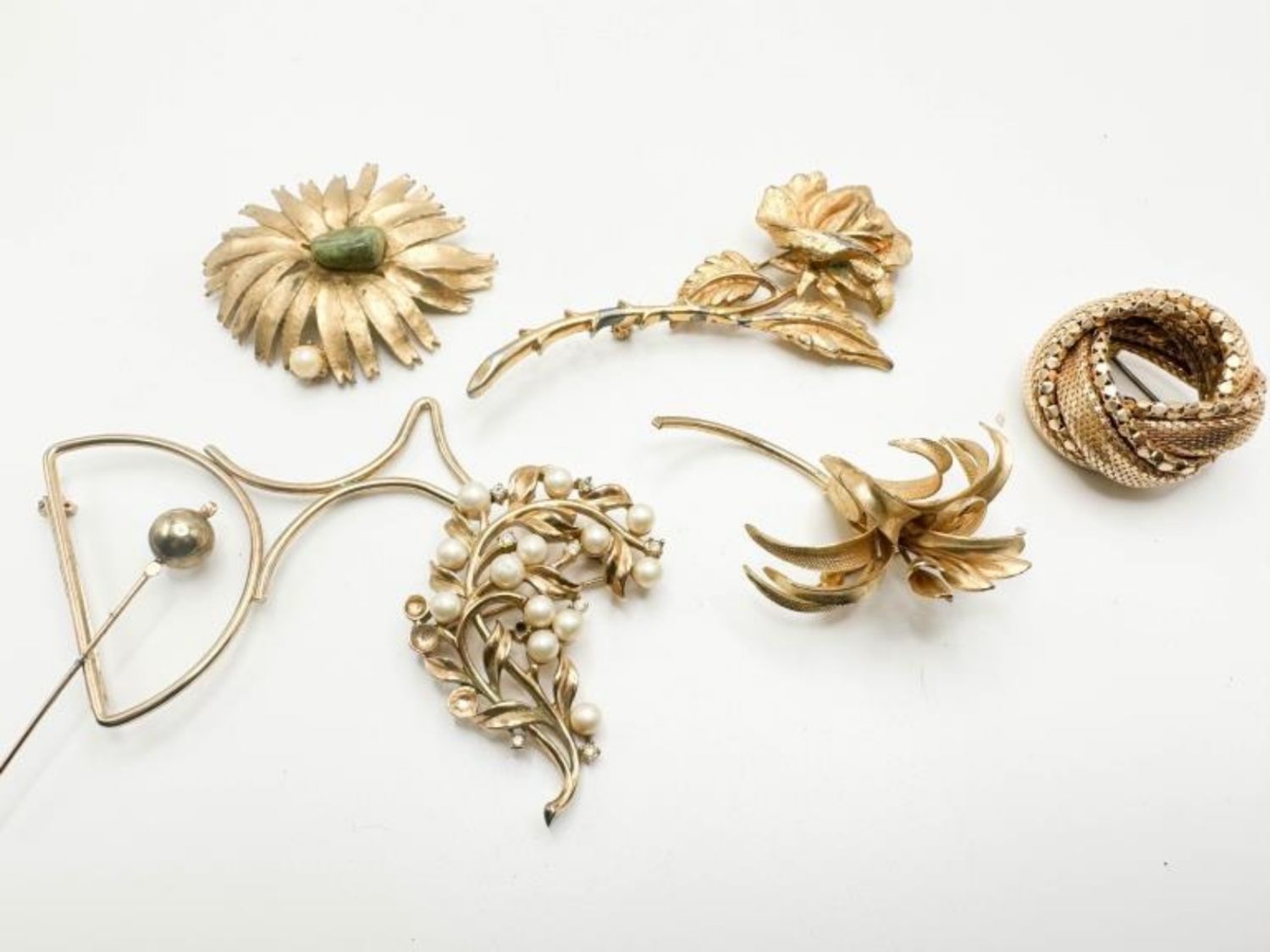 TRIFARI CROWN BROOCH , MISSING TWO PEARLS, OTHER BROOCHES