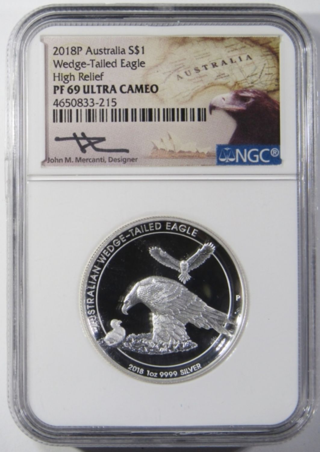 JOHN MERCANTI SIGNED, HIGH RELIEF AUSTRALIA 1oz .999 SILVER DOLLAR.