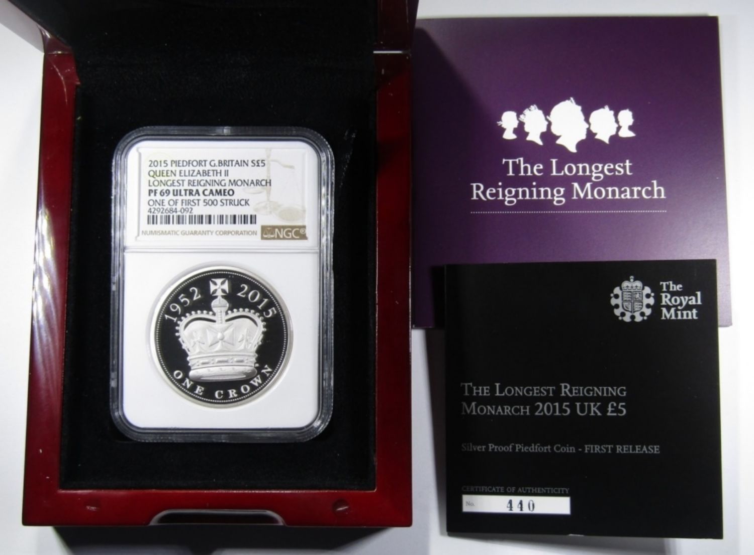 56.56 GRAMS .925 SILVER QUEEN ELIZABETH II LONGEST REIGNING MONARCH. ONE OF FIRST 500 STRUCK. IN DISPLAY BOX WITH COA.