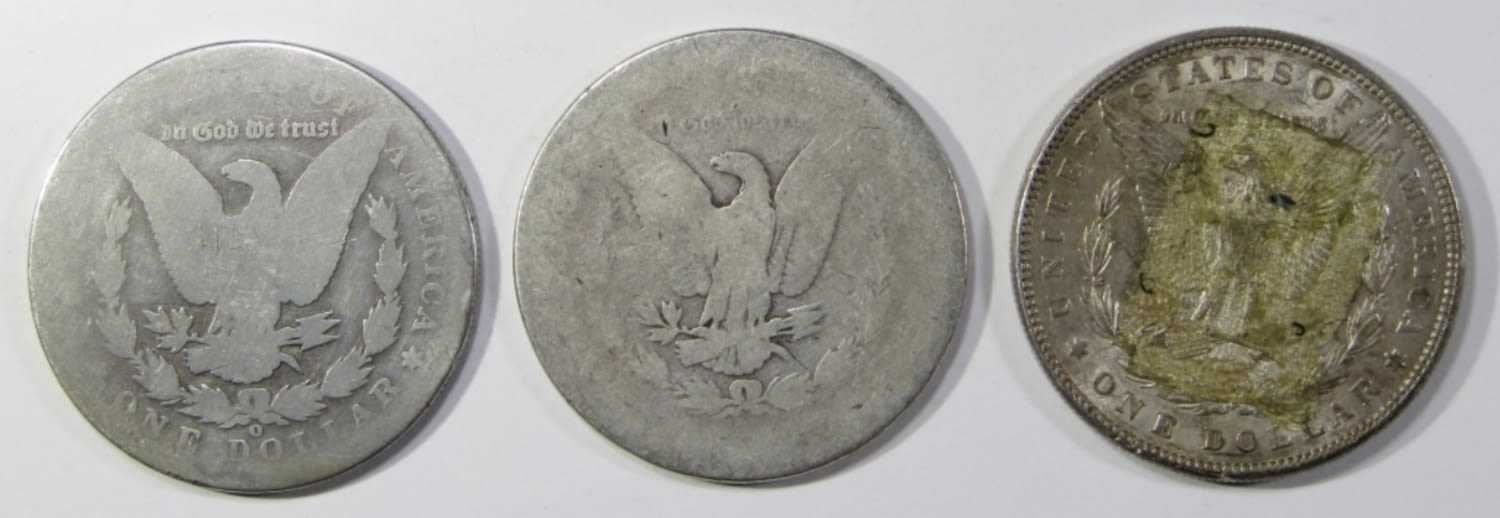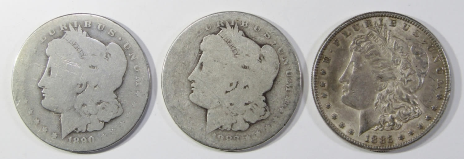 1883 CIRC, 1890-O CIRC, & 1885 XF W/ TAPE GLUE RESIDUE ON REVERSE.