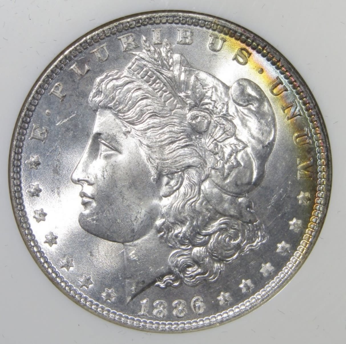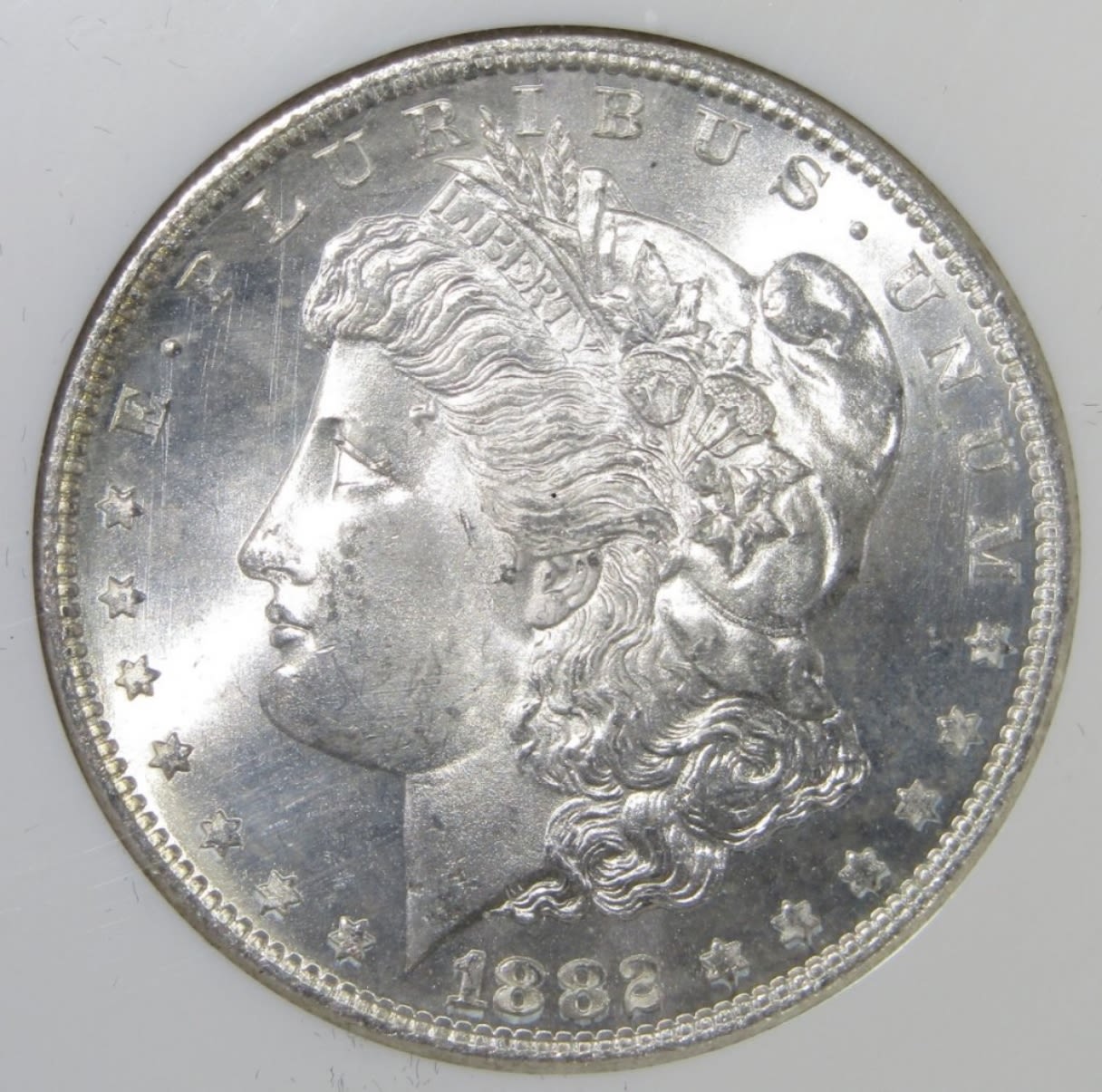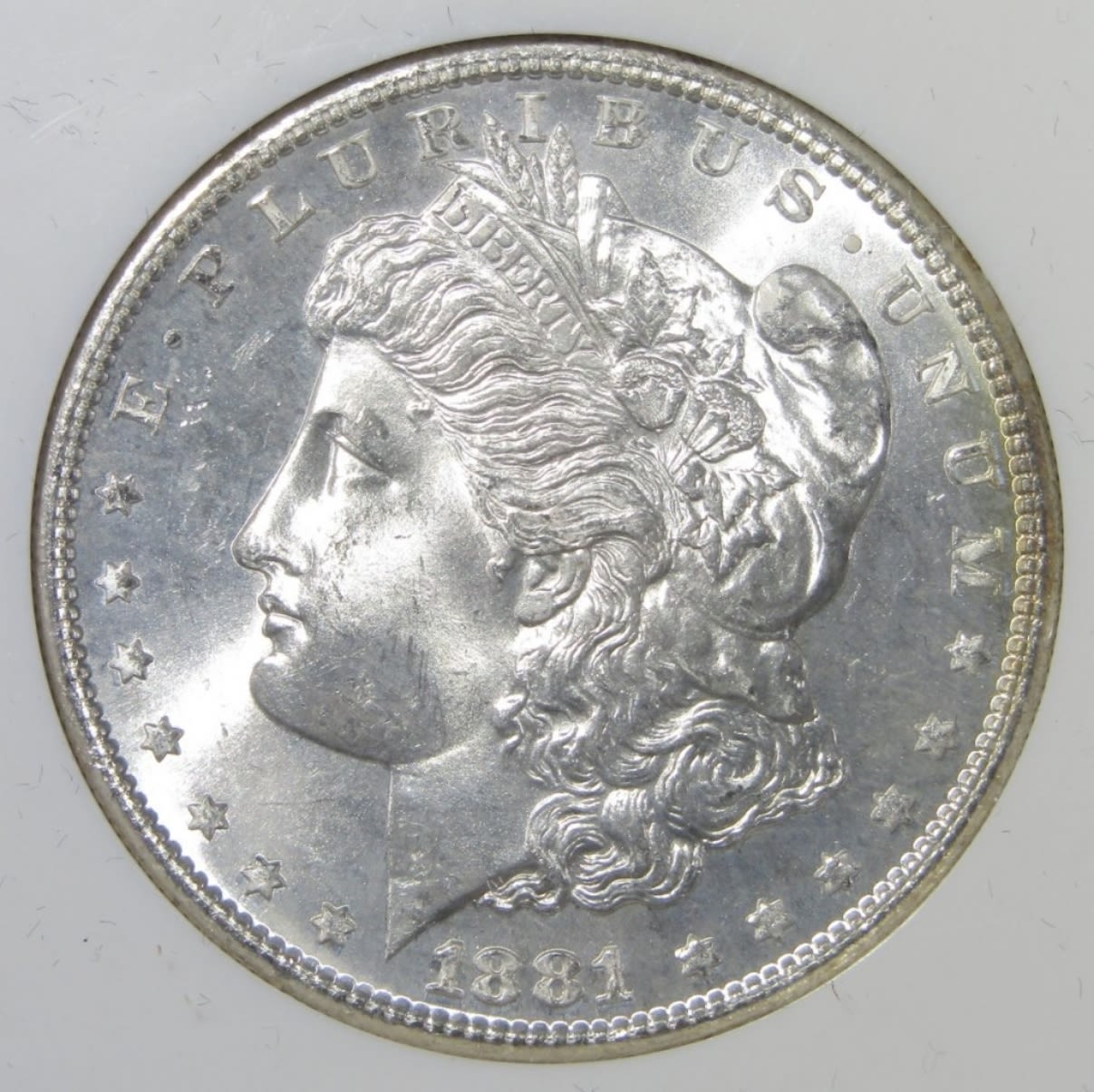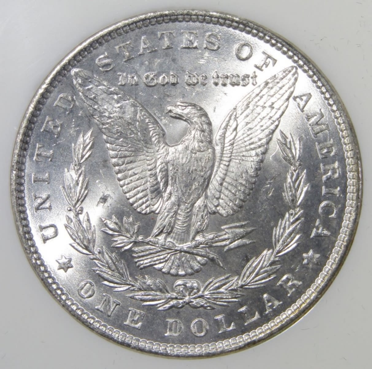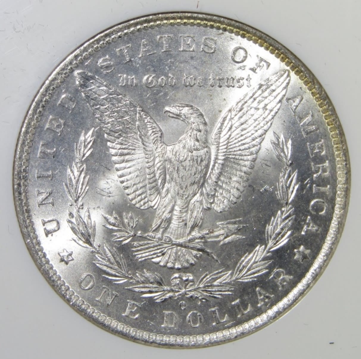 (6) NGC MS-65 MORGAN DOLLARS: 1879-S, 81-S, 82-S, 83-O, 84-O, & 86. PHILADELPHIA NATIONAL BANK HOARD MS-65 COLLECTION IN DISPLAY CASE W/ COA.