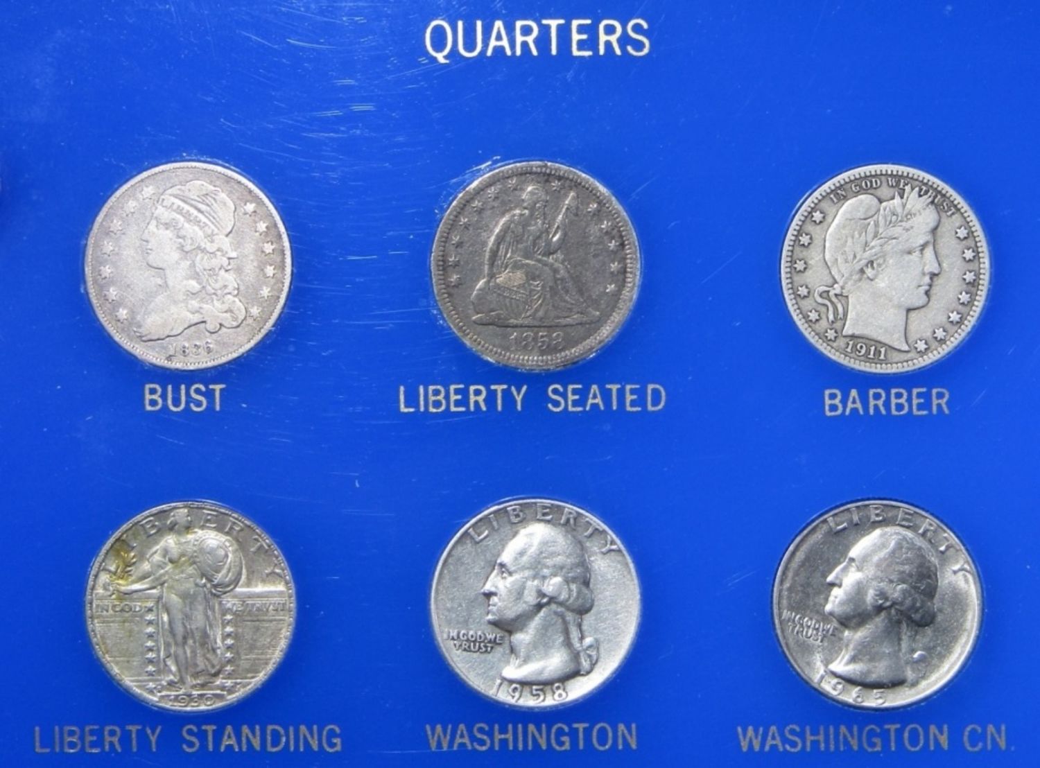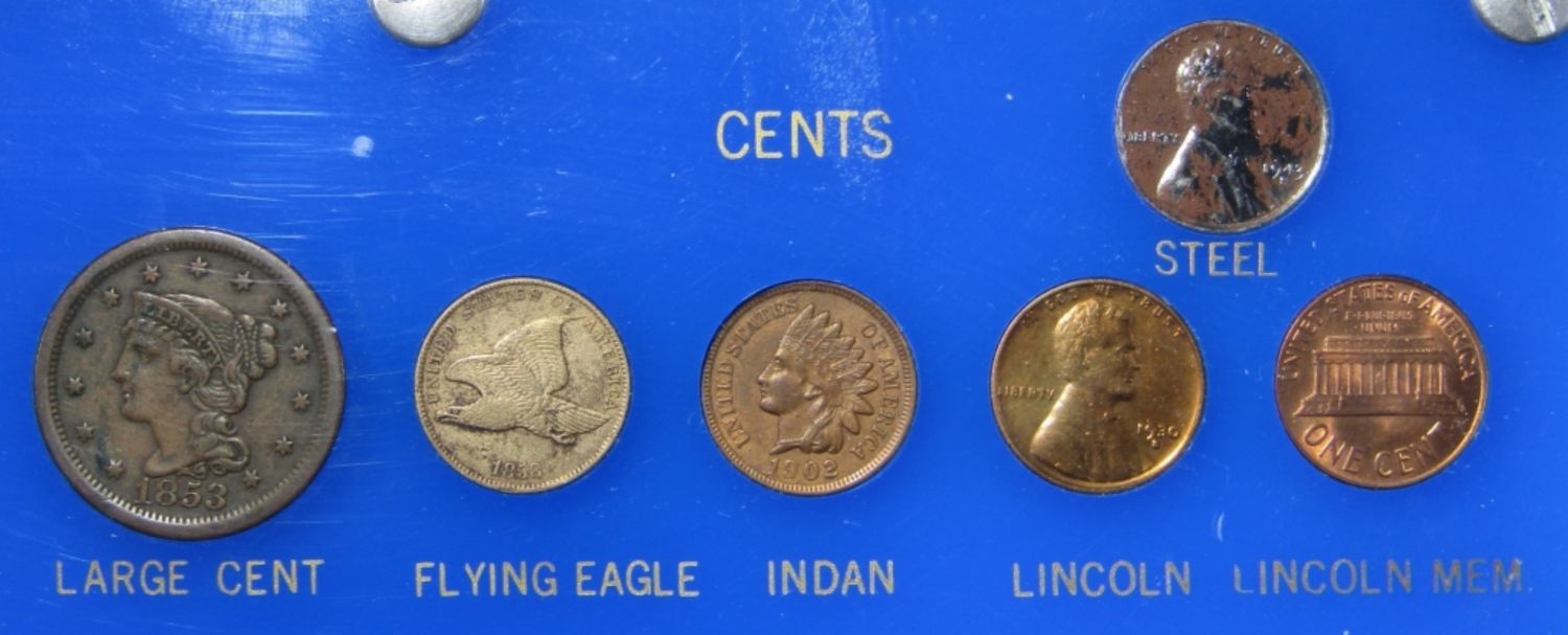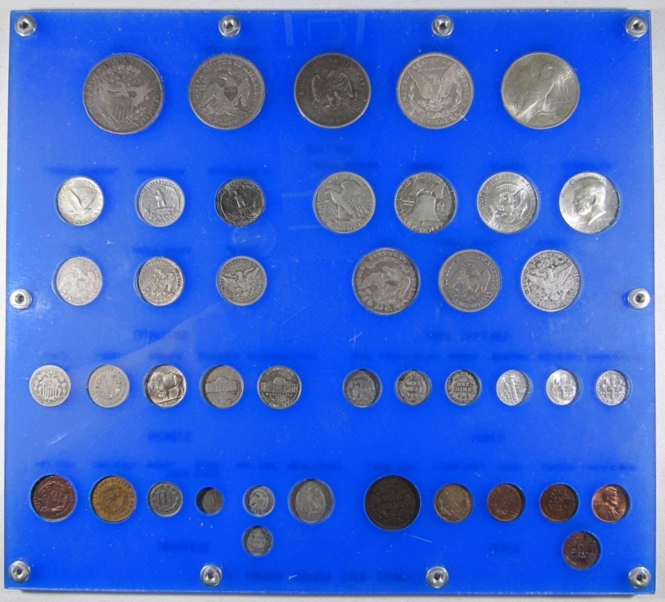 (42) DIFFERENT TYPE COINS FROM 1800-1965 IN PLASTIC DISPLAY HOLDER. INCLUDES SILVER ISSUE COINS. STUNNING COLLECTION! SEE PHOTOS.