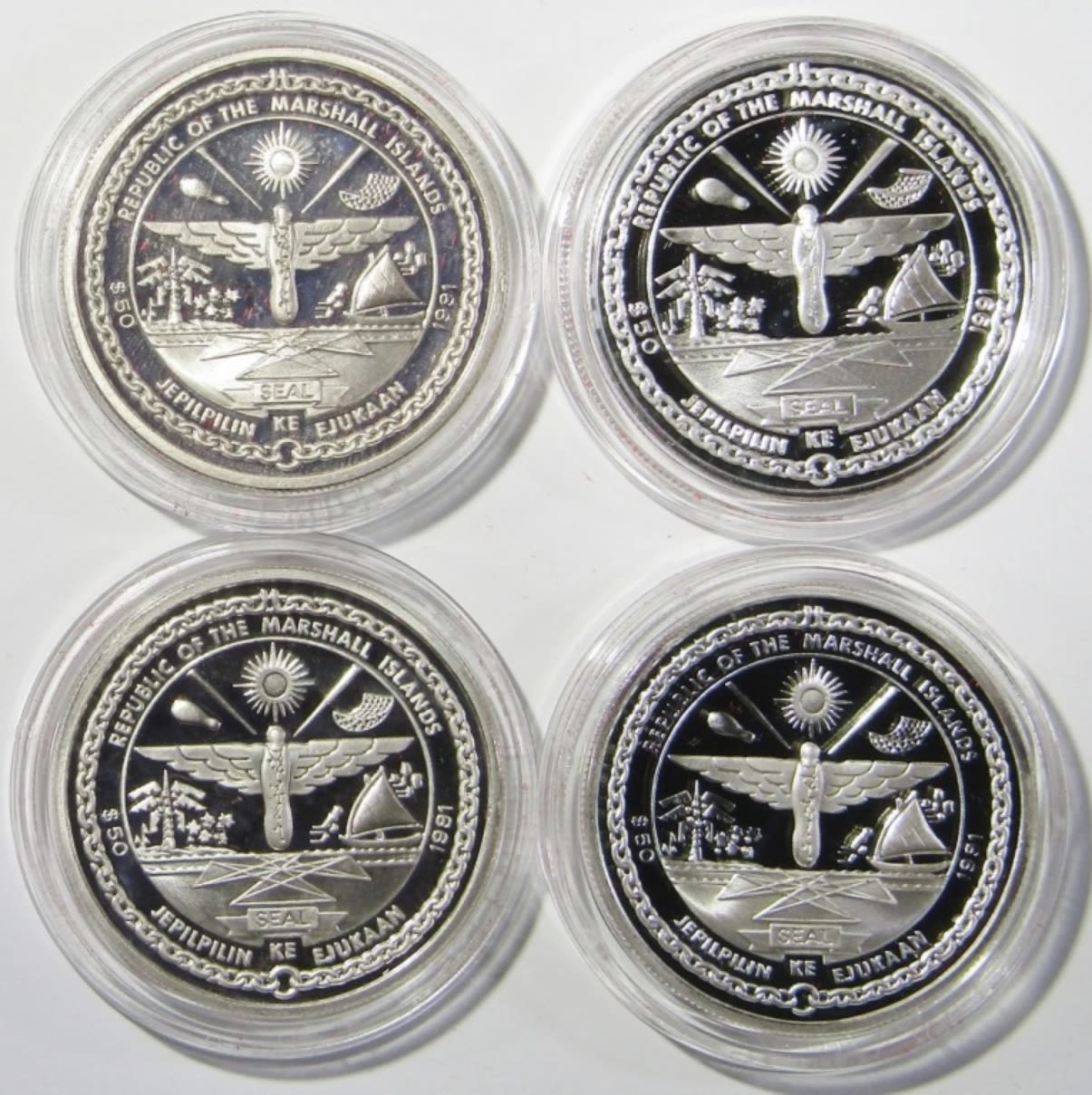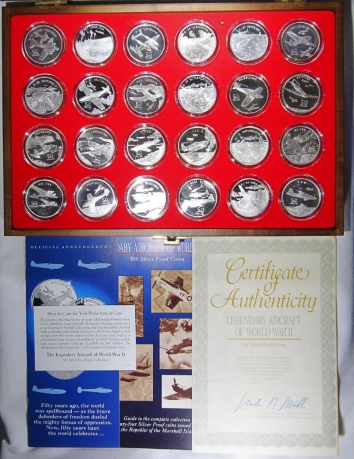 (24) 1oz .999 SILVER PROOF COINS. 1991 THE REPUBLIC OF MARSHALL $50 LEGENDARY AIRCRAFT OF WORLD WAR II LIMITED EDITION COLLECTOR SET. IN WOODEN DISPLAY BOX W/ COA.
