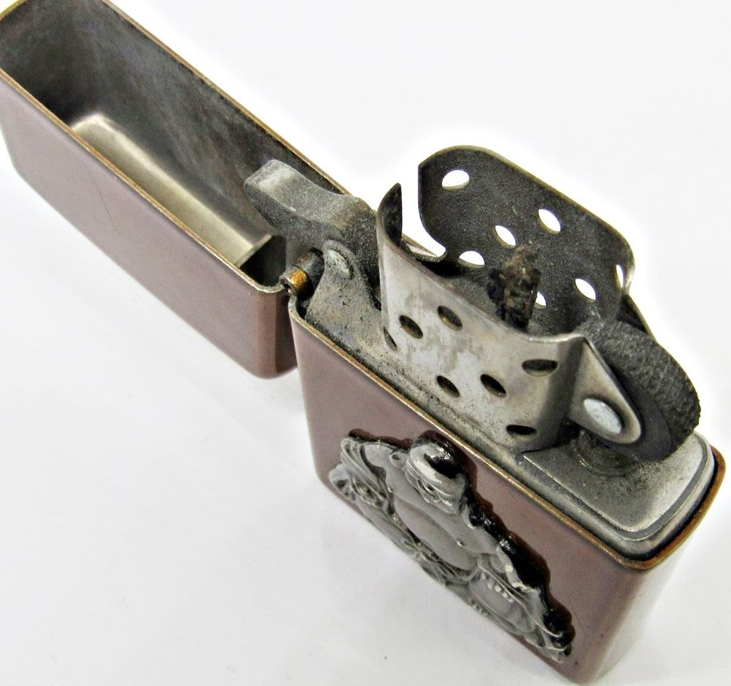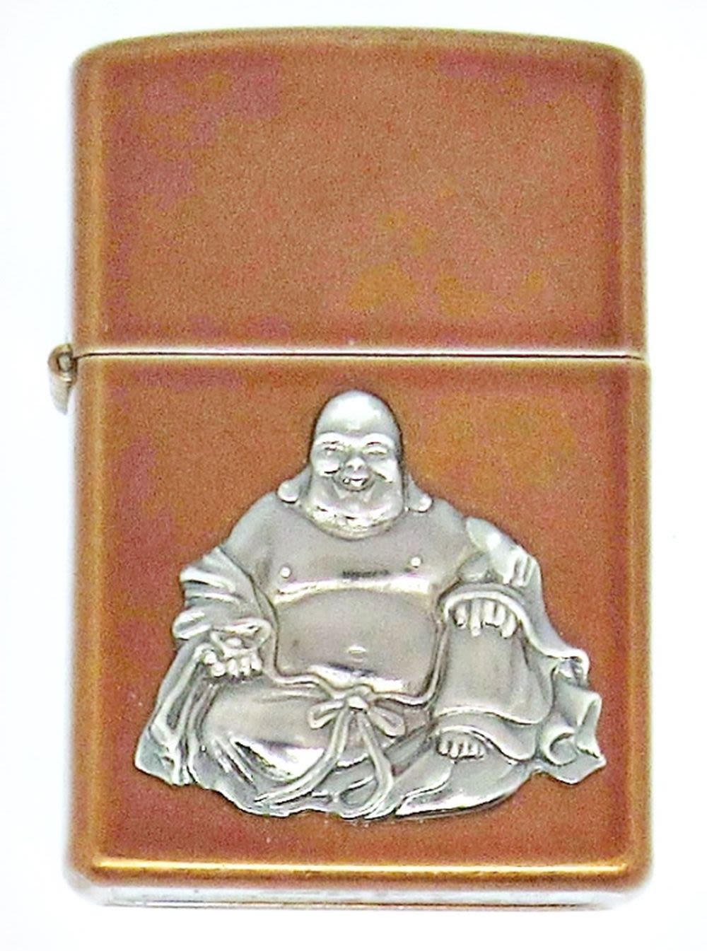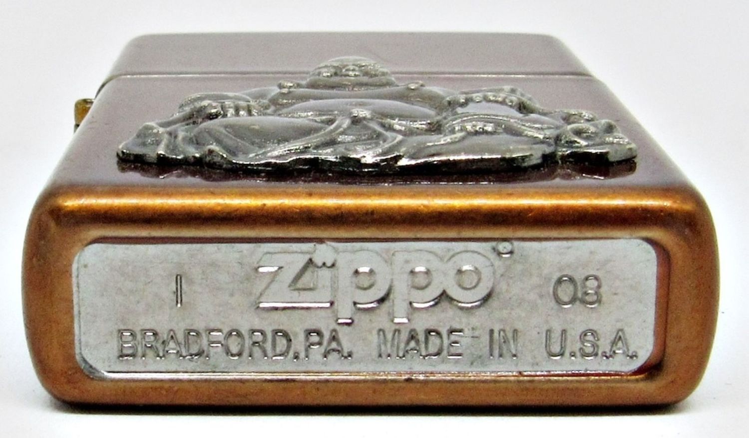 2008 ORANGE GOLD TONE ZIPPO WITH RAISED BUDDAH EMBLEM; USED CONDITION