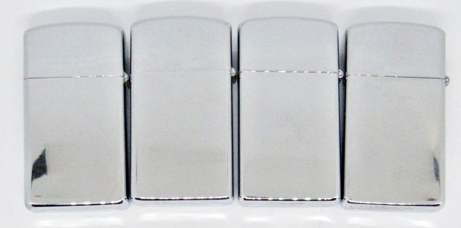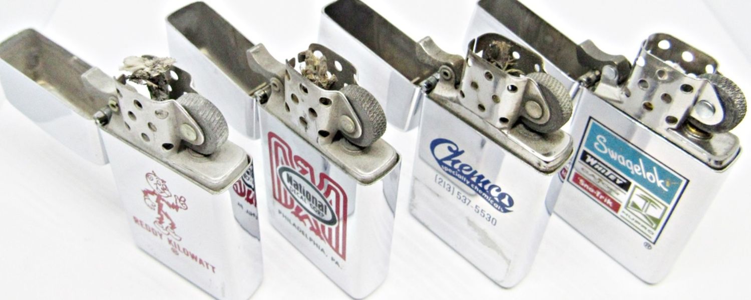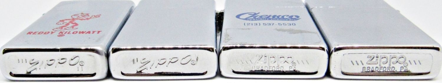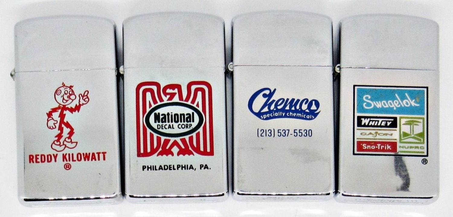 VINTAGE SILVER TONE ZIPPOS; SLIM STYLE; VARIOUS ENGRAVED LOGOS; ALL IN USED CONDITION