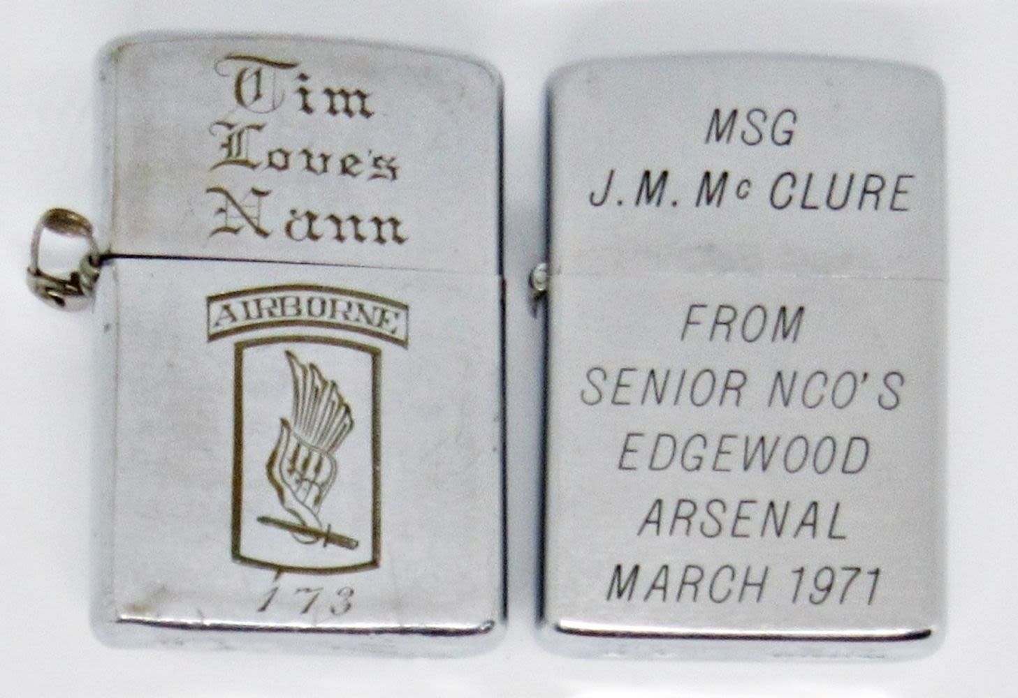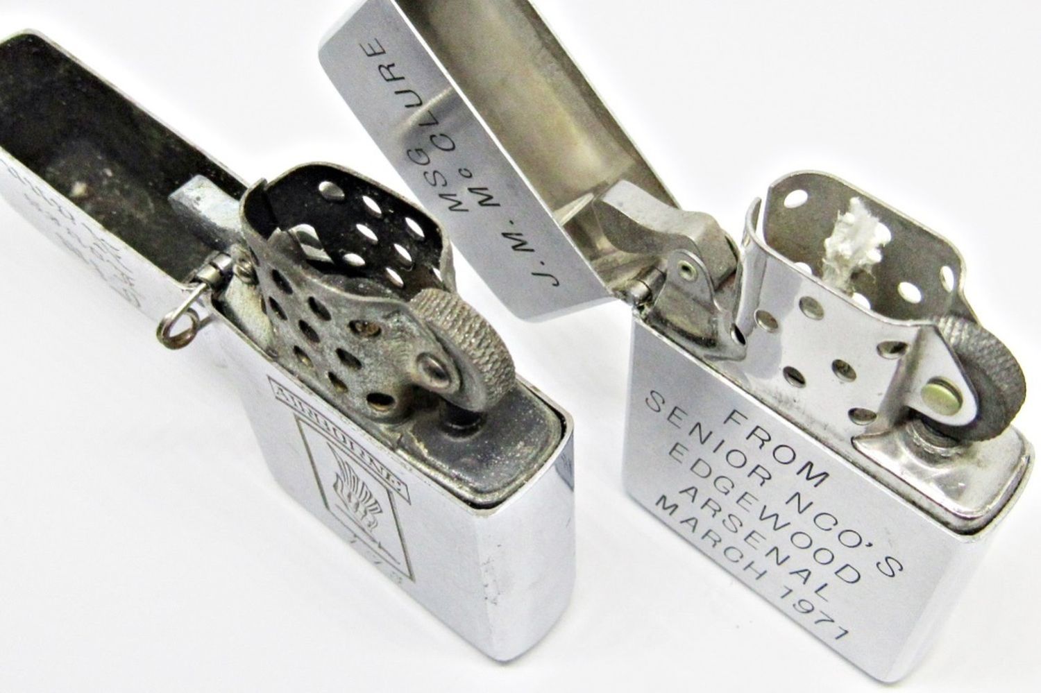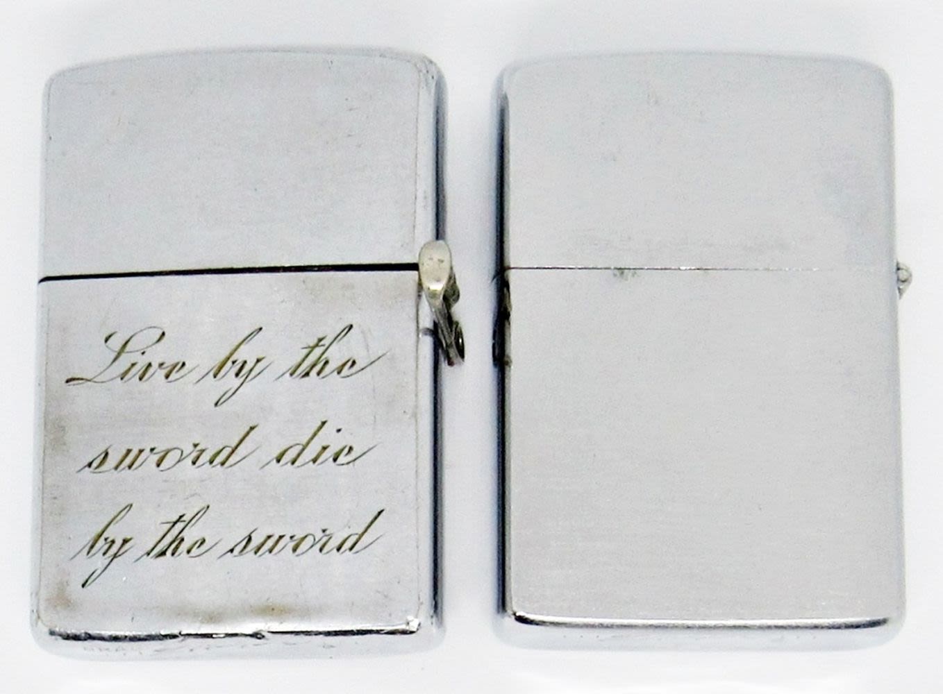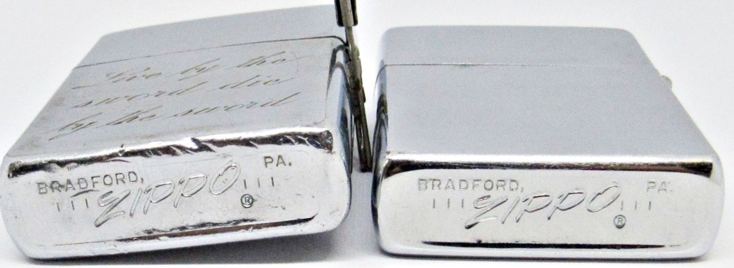 (2) 1968 CHROME ZIPPO LIGHTERS, BOTH ENGRAVED; 1 UNFIRED; 1 USED CONDITION