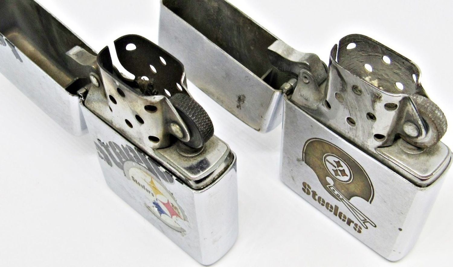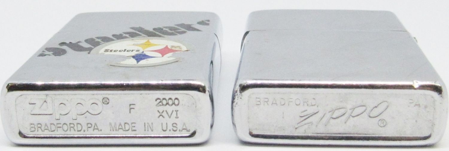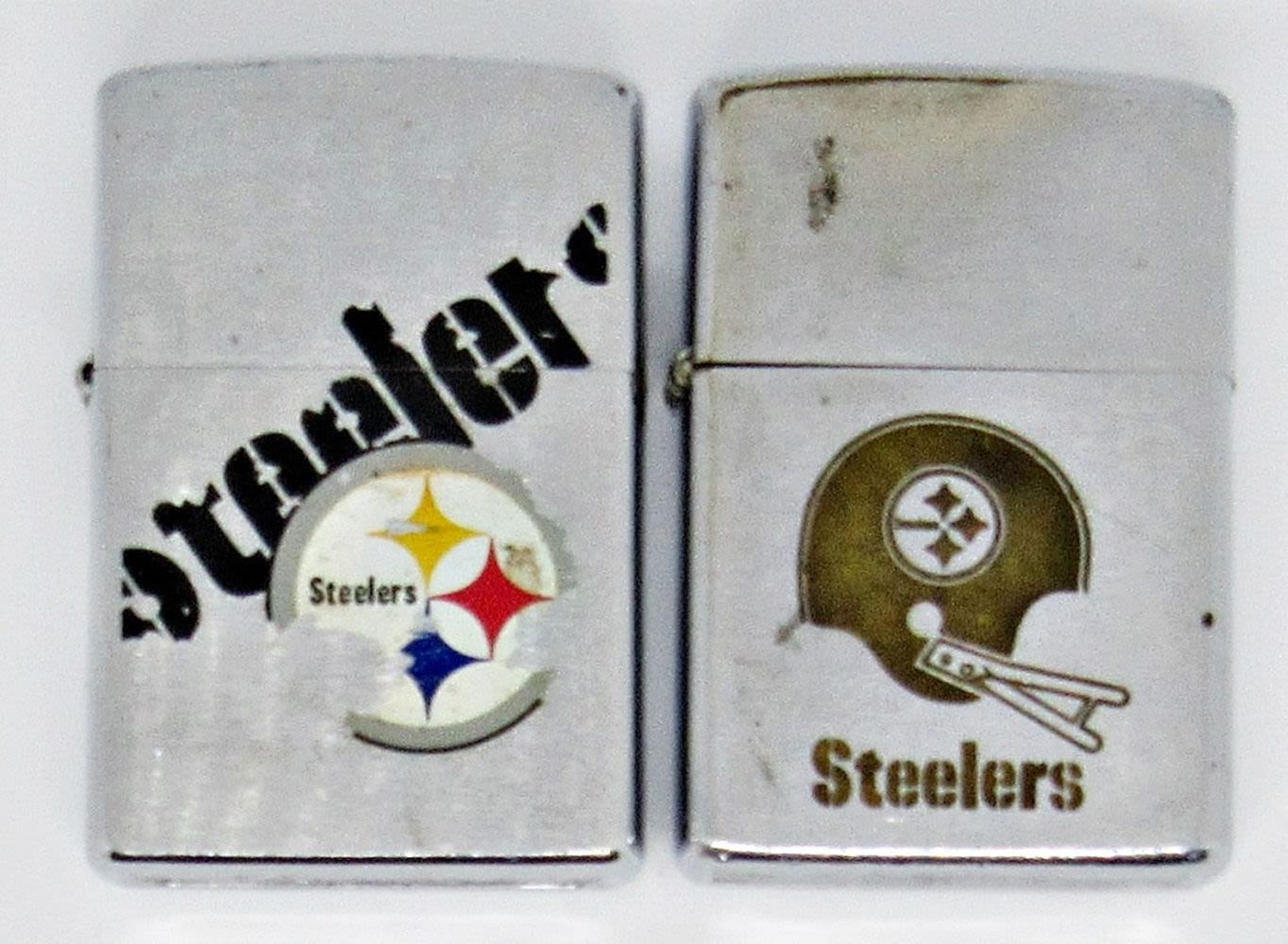 1973 & 2000 SILVER TONE ZIPPO LIGHTERS WITH STEELERS EMBLEMS; USED CONDITION