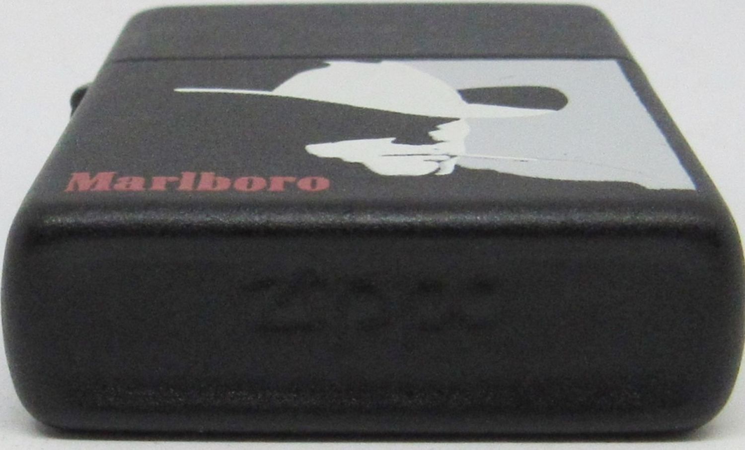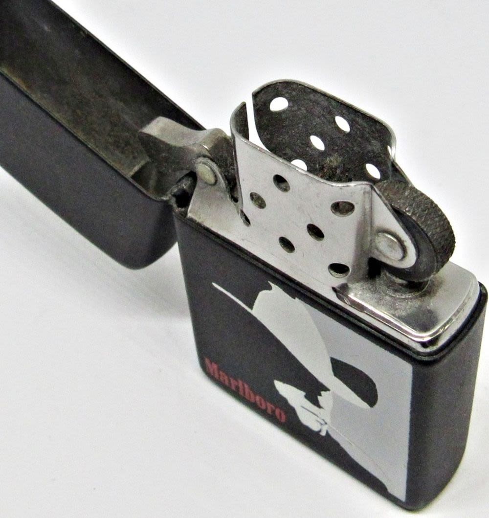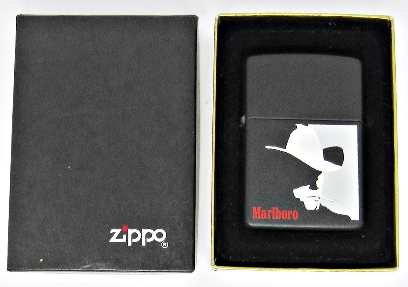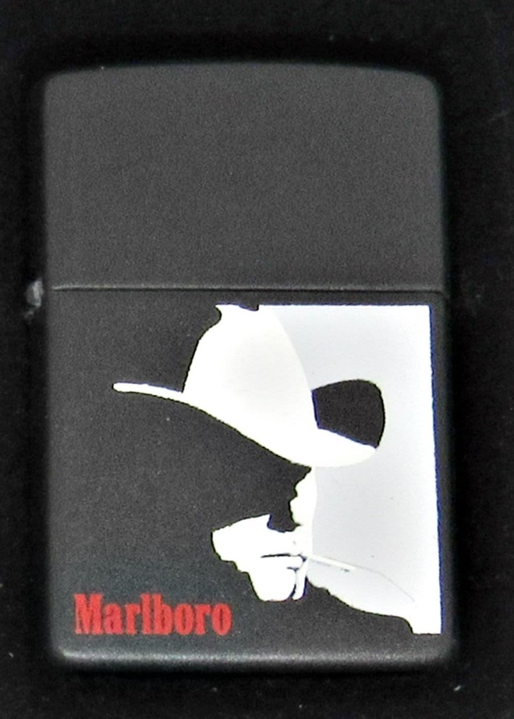 BLACK MATTE VINTAGE ZIPPO LIGHTER WITH MARLBORO MAN EMBLEM; USED CONDITION; IN ORIGINAL BOX