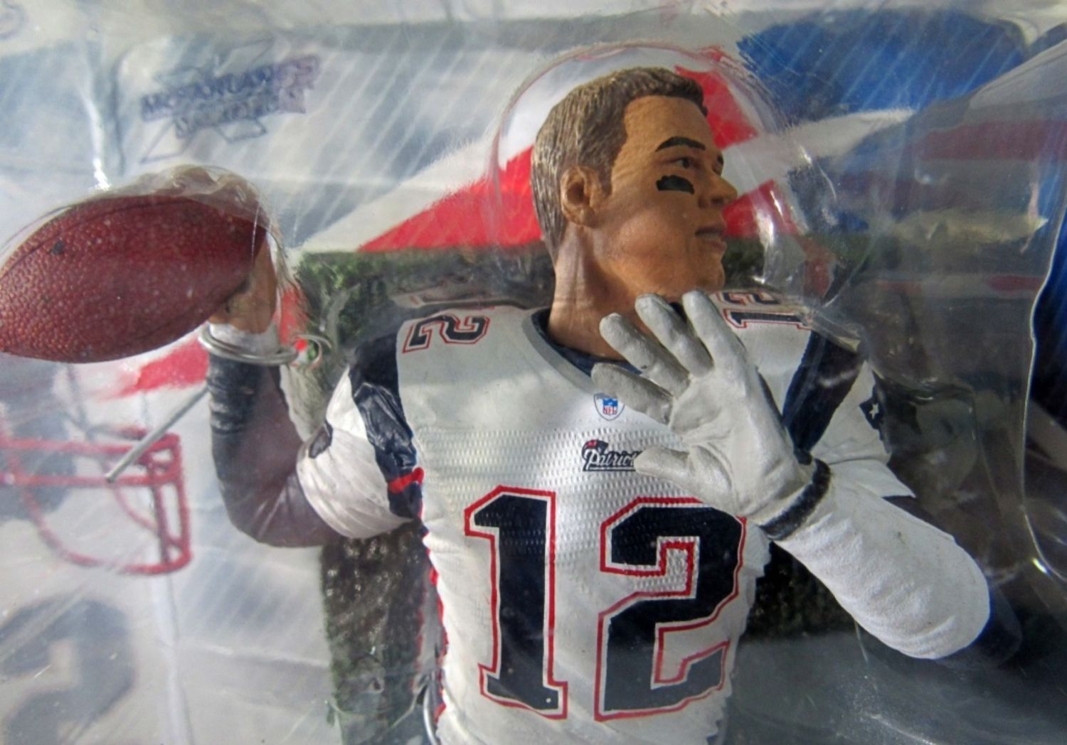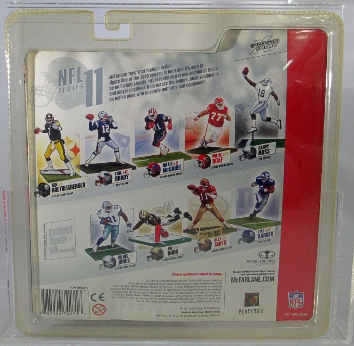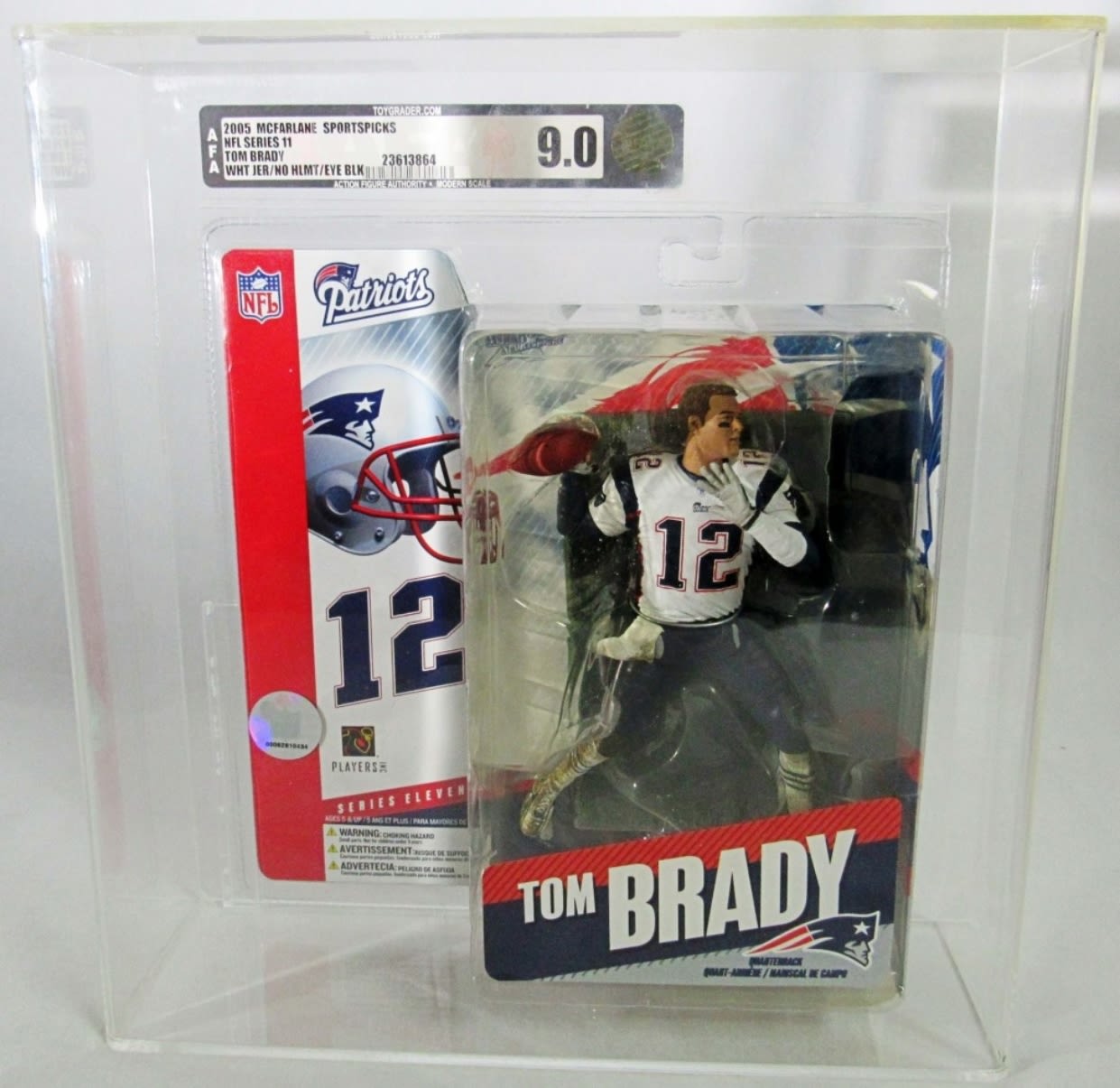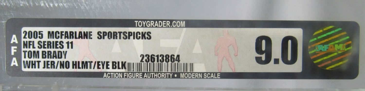 2005 MCFARLANE NFL SERIES 11 TOM BRADY WHITE JERSEY, NO HELMET,BLACK TAPE UNDER EYES, GRADED BY AFA IN A CLEAR BOX