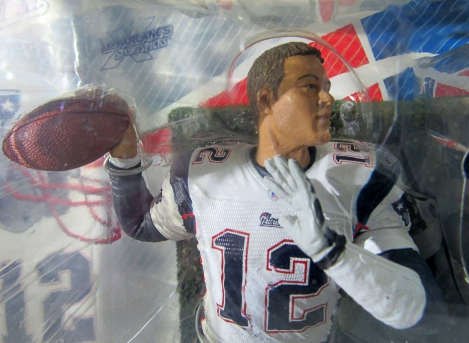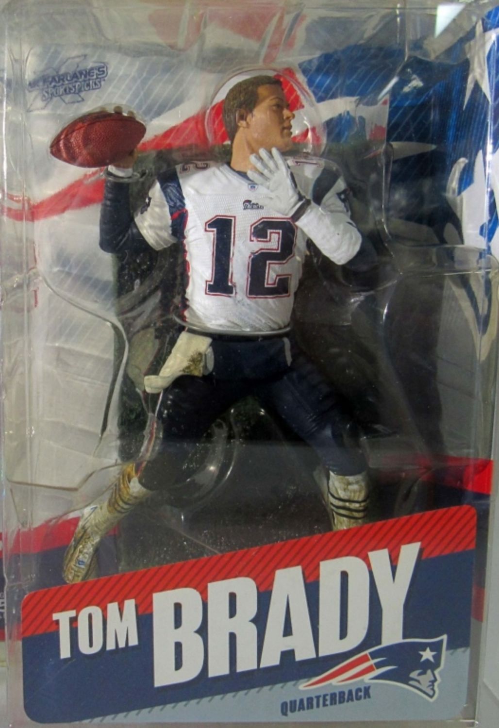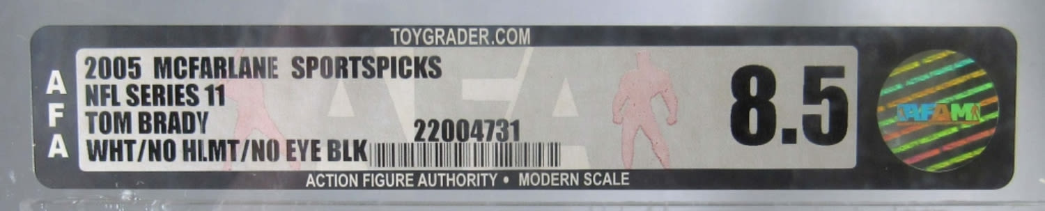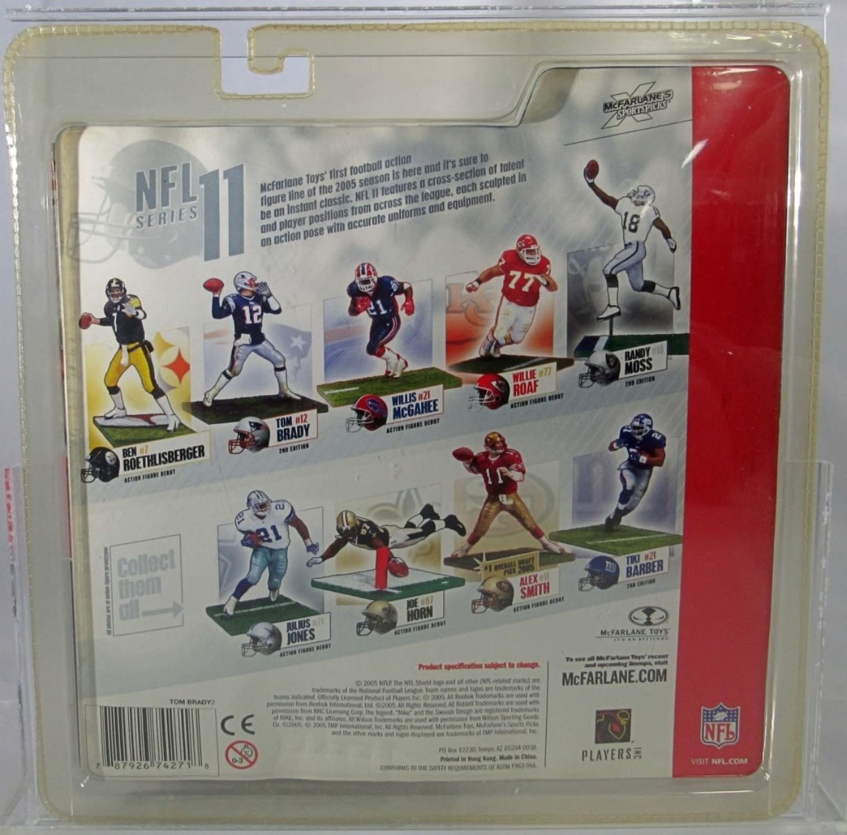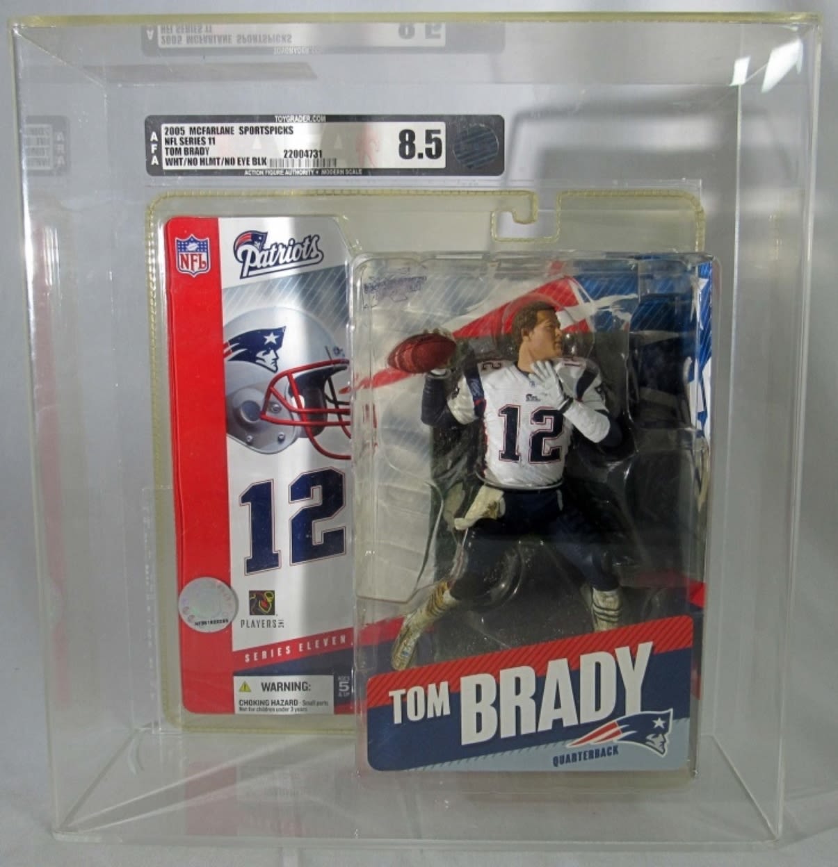 2005 MCFARLANE NFL SERIES 11 TOM BRADY W/ WHITE JERSEY, NO HELMET, NO BLACK TAPE UNDER EYES, GRADED 8.5 IN A CLEAR CASE