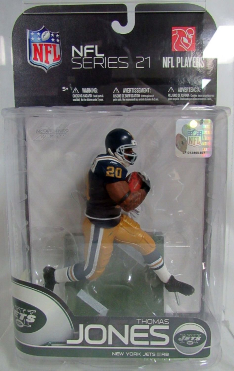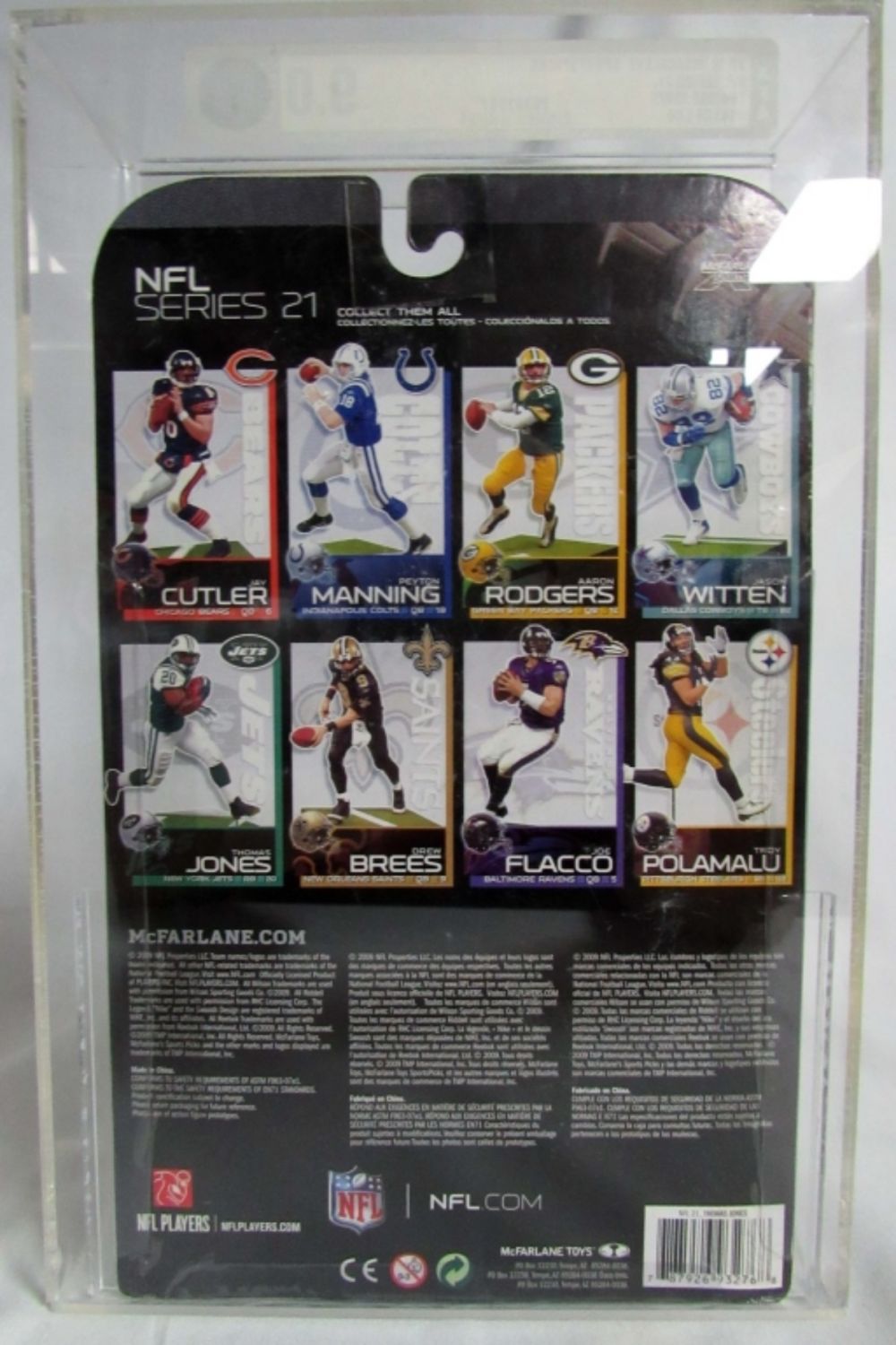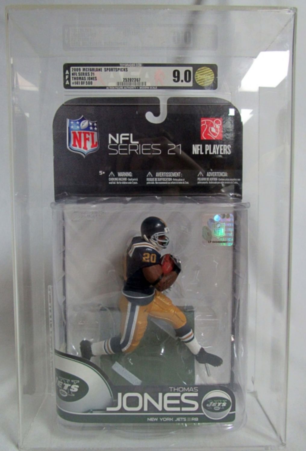 2009 MCFARLANE, NFL SERIES 21, THOMAS JONES NY JETS, #141 OF 500, GRADED 9.0, IN A DISPLAY CASE