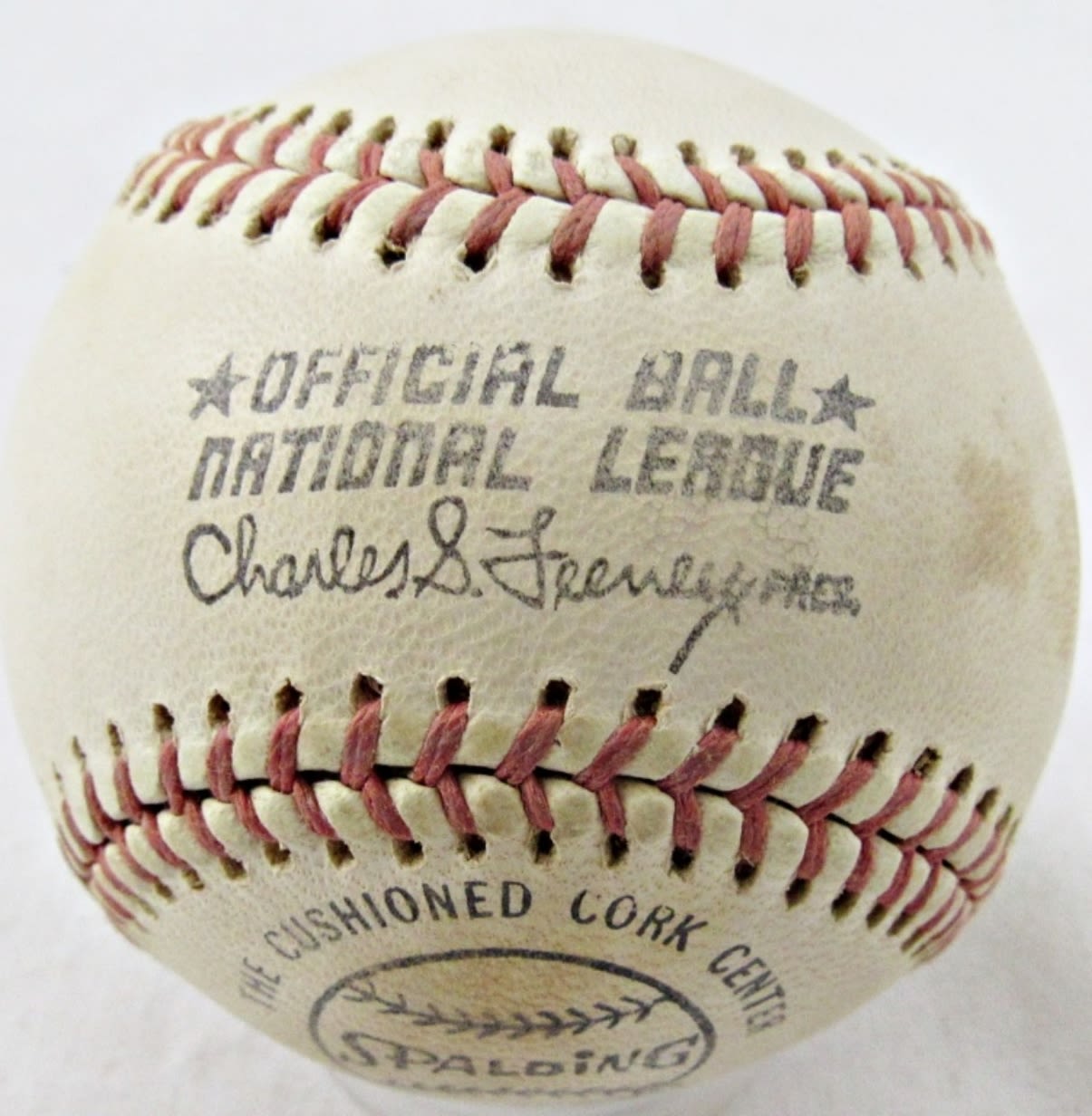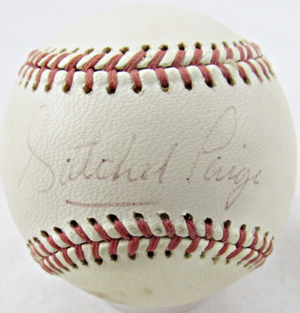 SATCHEL PAIGE AUTOGRAPHED NATIONAL LEAGUE BASEBALL IN HOLDER; NO COA