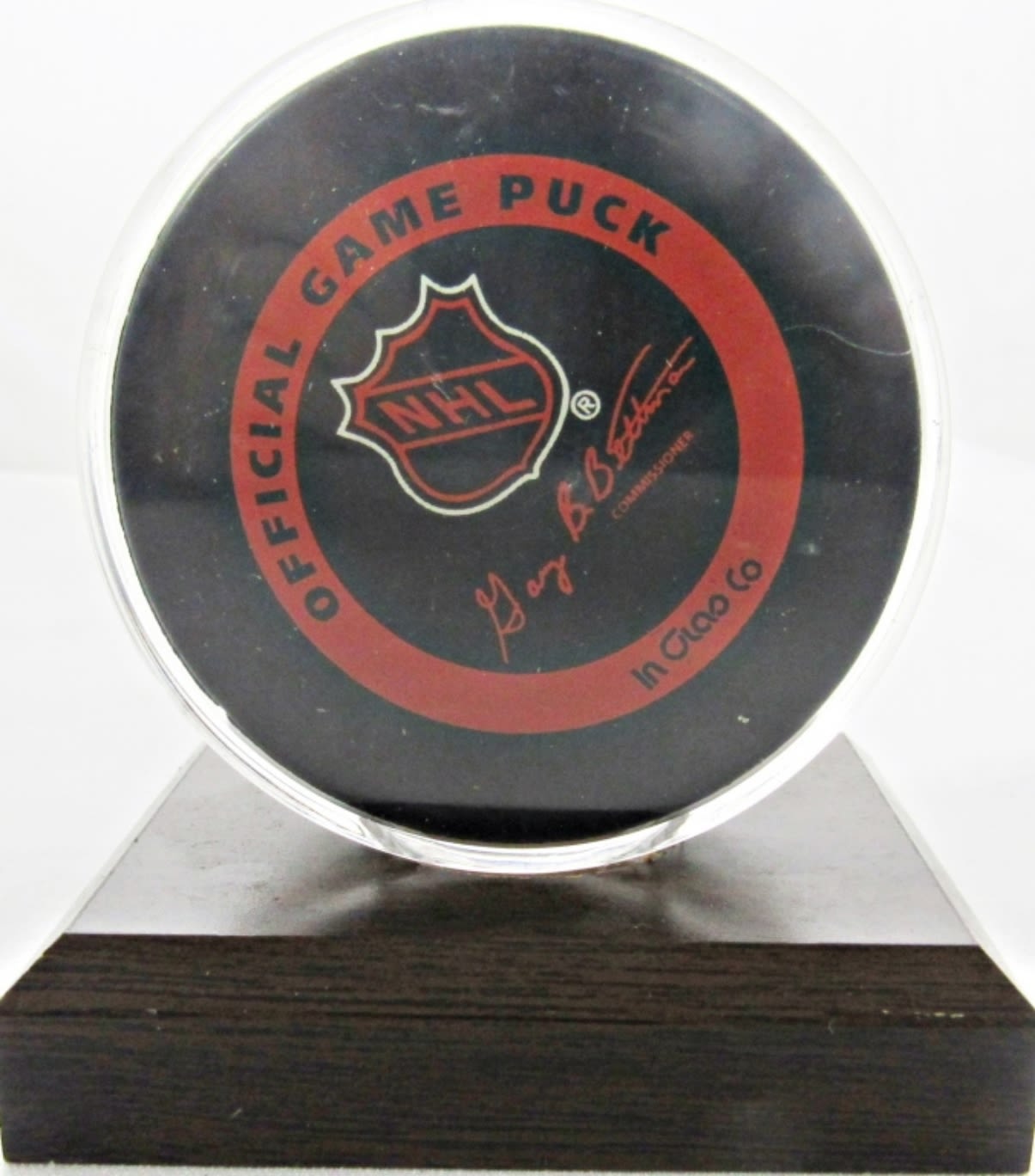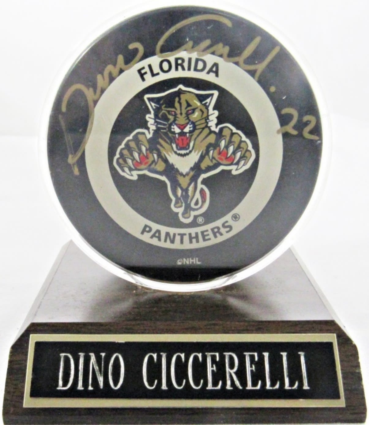 DINO CICCERELLI AUTOGRAPHED OFFICIAL VINTAGE HOCKEY PUCK IN DISPLAY, NO COA