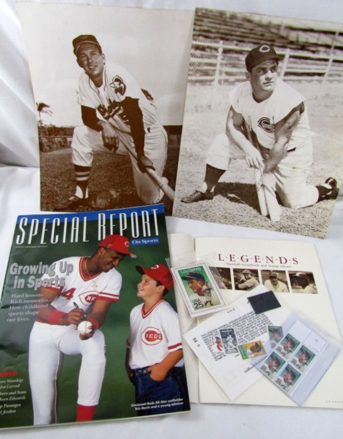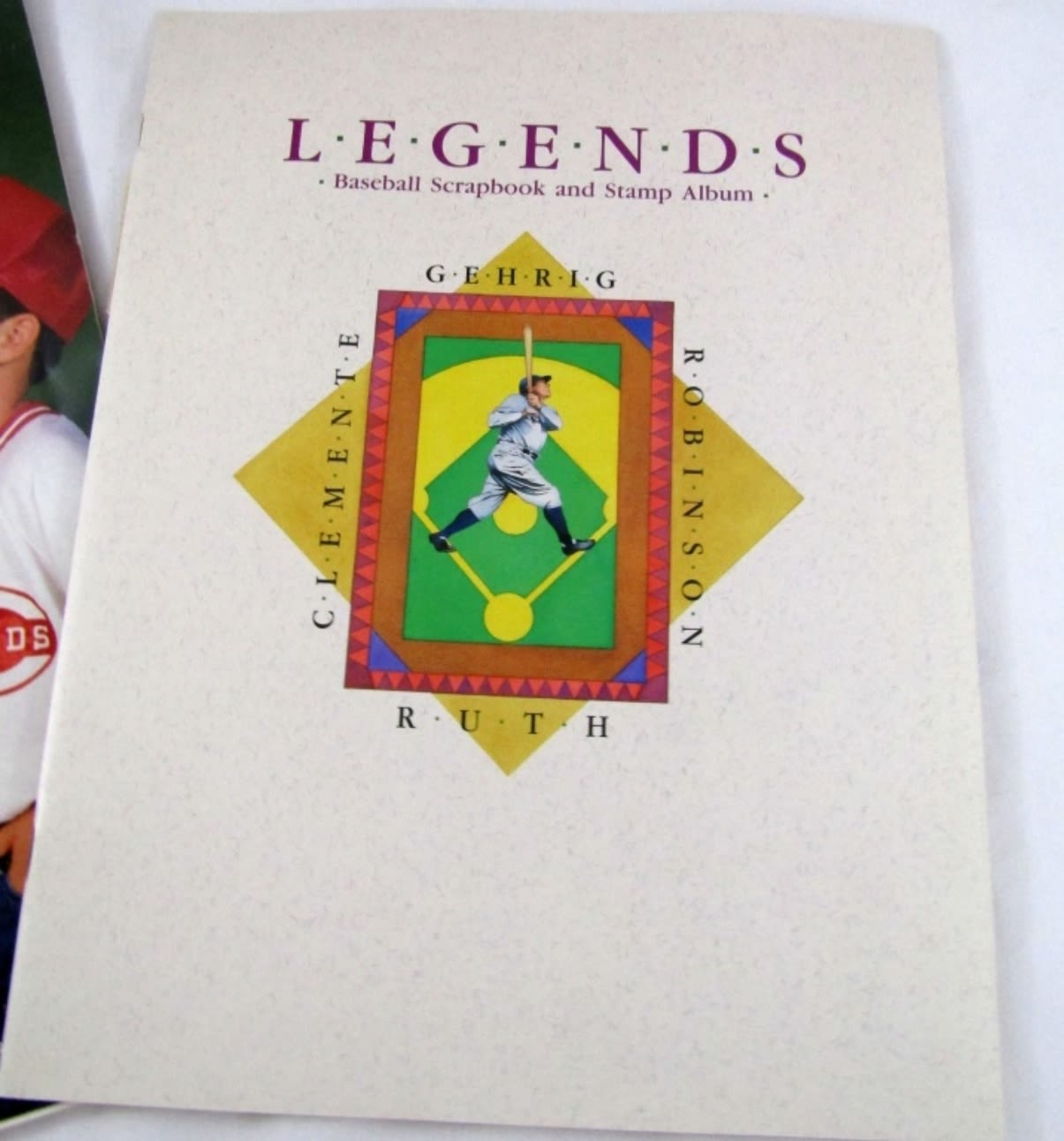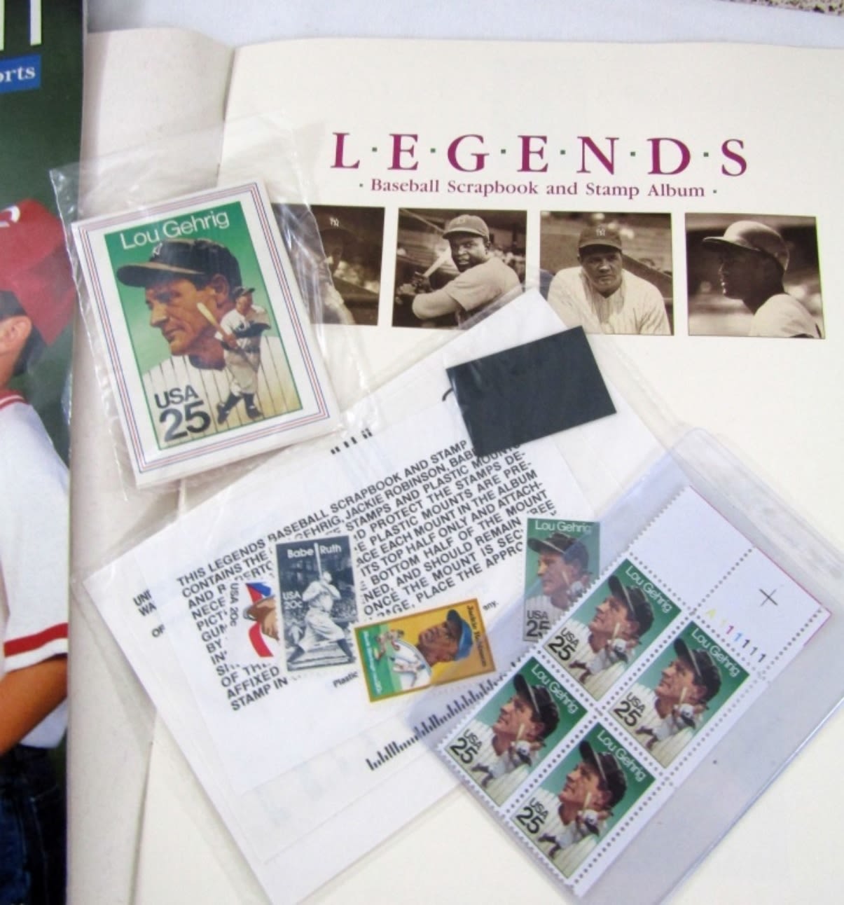 GEHRIG, CLEMENTE, ROBINSON & RUTH STAMPS & ALBUM plus (2) 11 x 14 SEPIA BASEBALL PHOTOS & 1989 SPECAIL REPORT OVERSIZED MAGAZINE