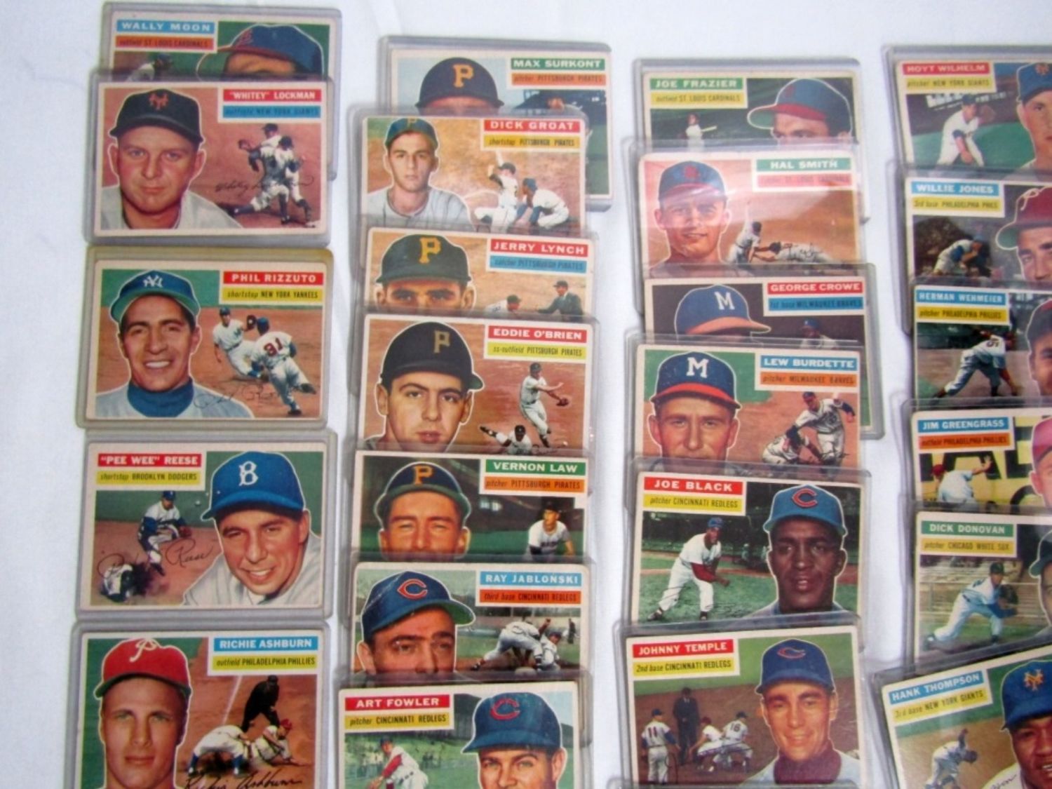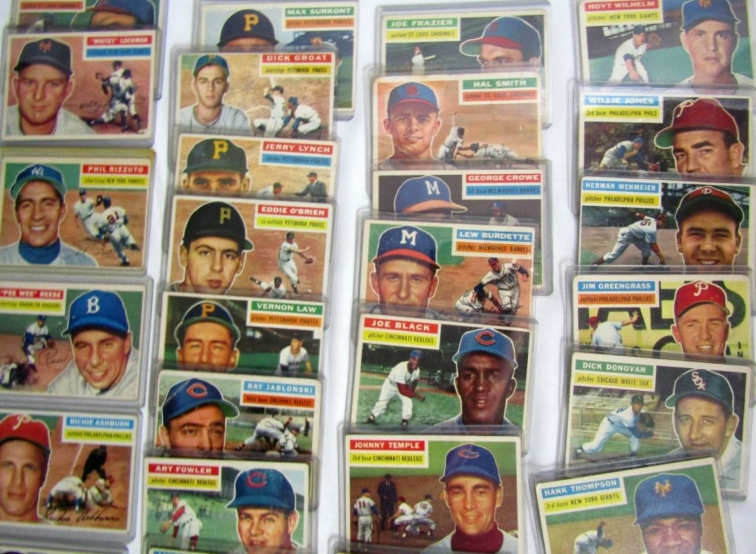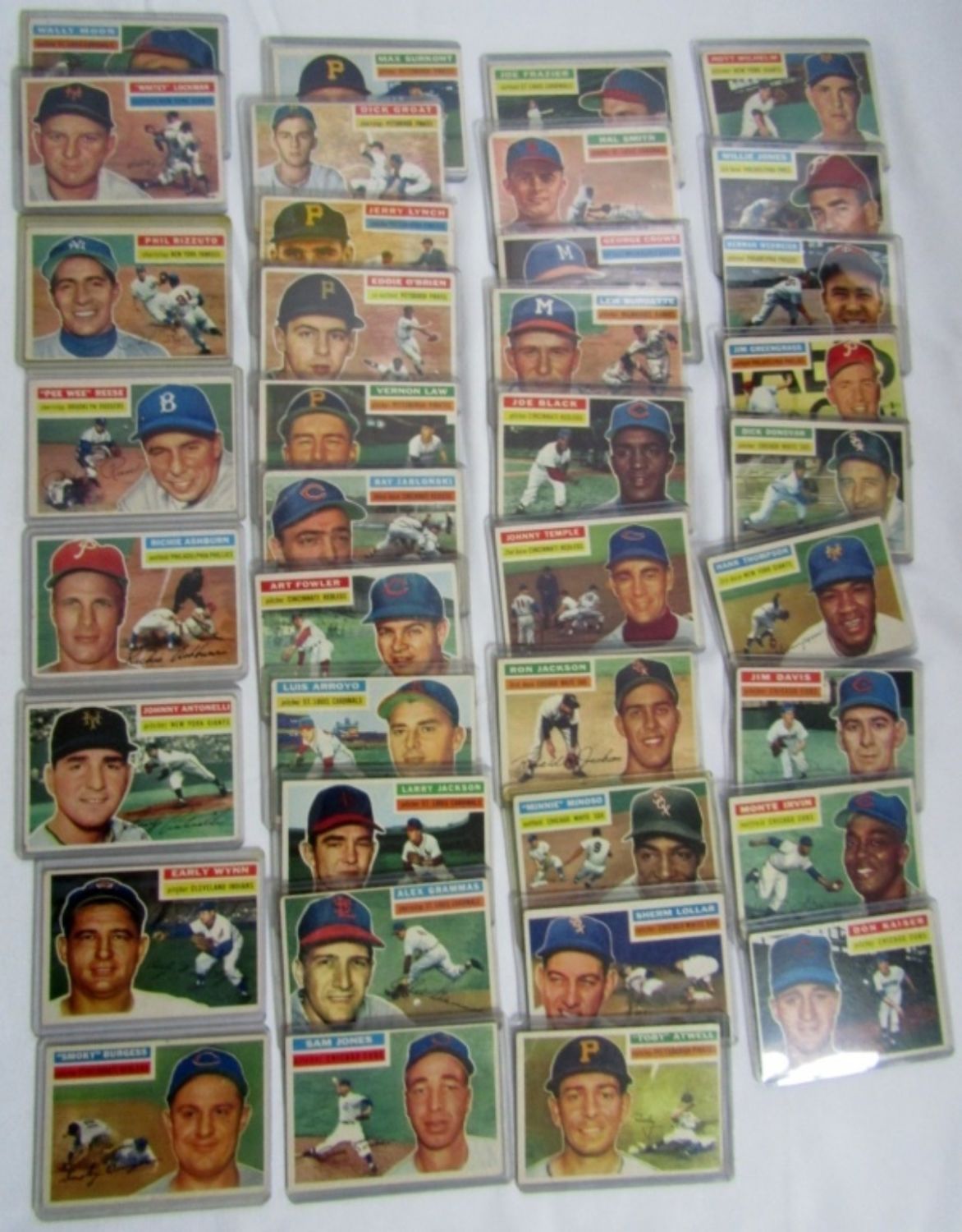 (38) includes #113 RIZZUTO VGEX, #260 PEE WEE REESE VGEX, #120 ASHBURN, #138 ANTONELLI, #187 WYNN, #192 BURGESS, #199 THOMPSON, #307 WILHELM plus 30 1956 TOPPS BASEBALL CARDS – AVG VGEX / VG some BETTER / LESSER – ALL