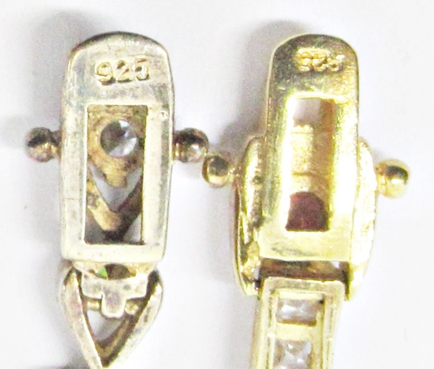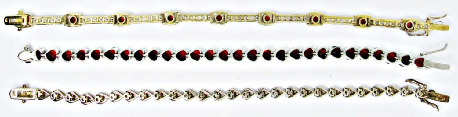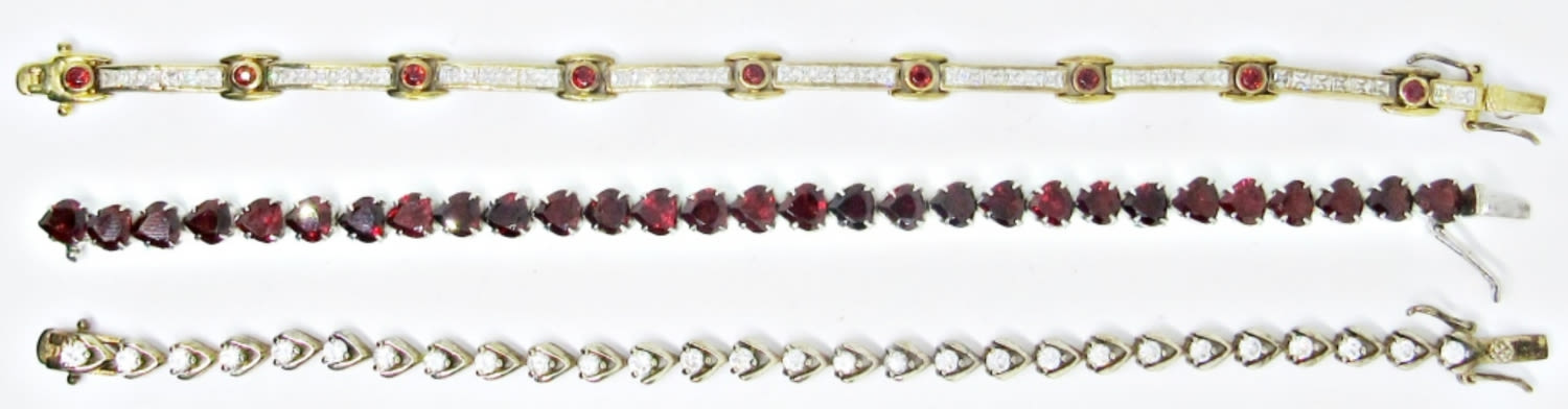 AMBER AND CLEAR RHINESTONE STERLING TENNIS BRACELETS; 8″ LONG (29 DWT)