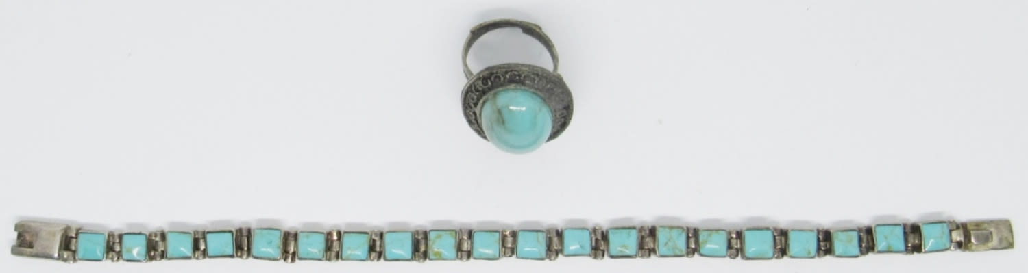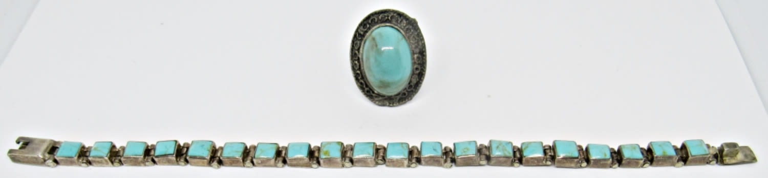 STERLING TURQUOISE RING, ADJUSTABLE SIZE; STERLING TURQUOISE BRACELET, 7.5″, STAMPED “MEXICO” TC-111 (17 DWT)