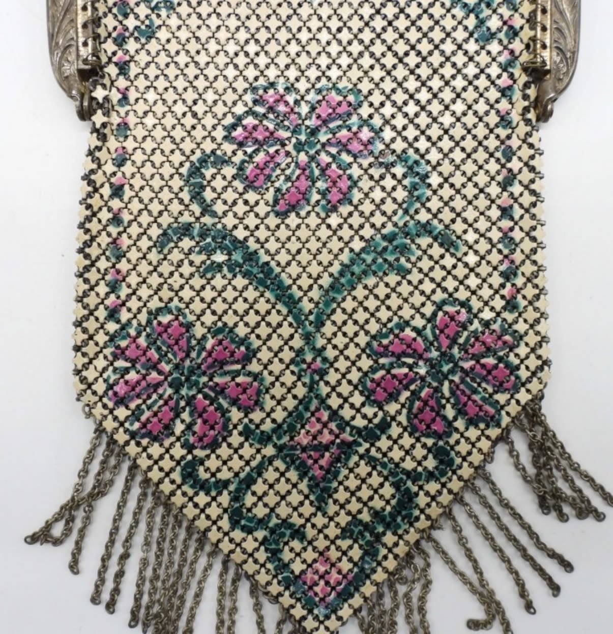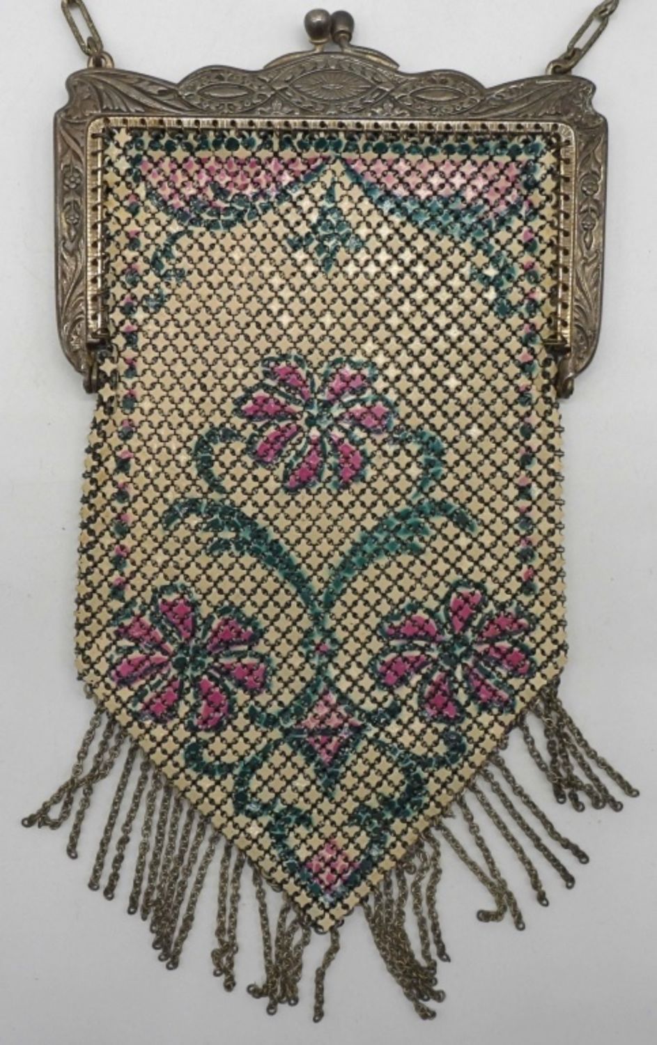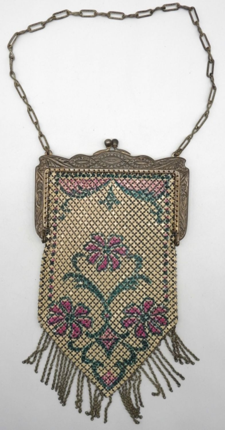 73DWT, STAMPED WITH MANDALIAN MFG CO U.S.A., STUNNING BAG WITH GREEN AND PINK, DESIGN ALONG CLASP