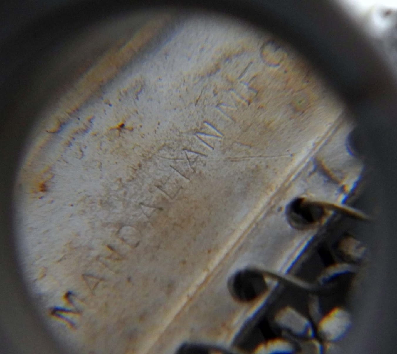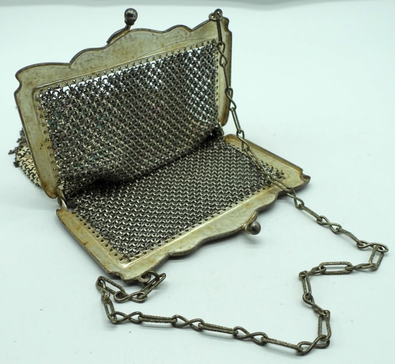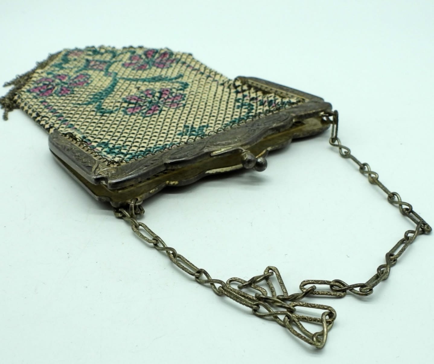 73DWT, STAMPED WITH MANDALIAN MFG CO U.S.A., STUNNING BAG WITH GREEN AND PINK, DESIGN ALONG CLASP