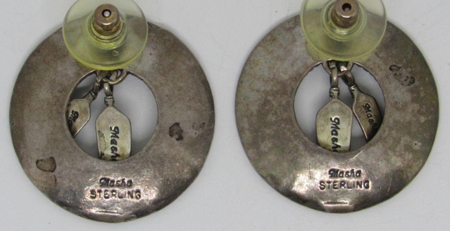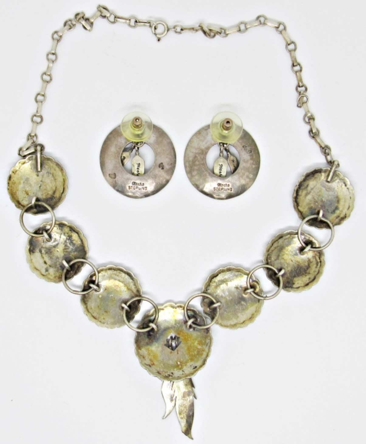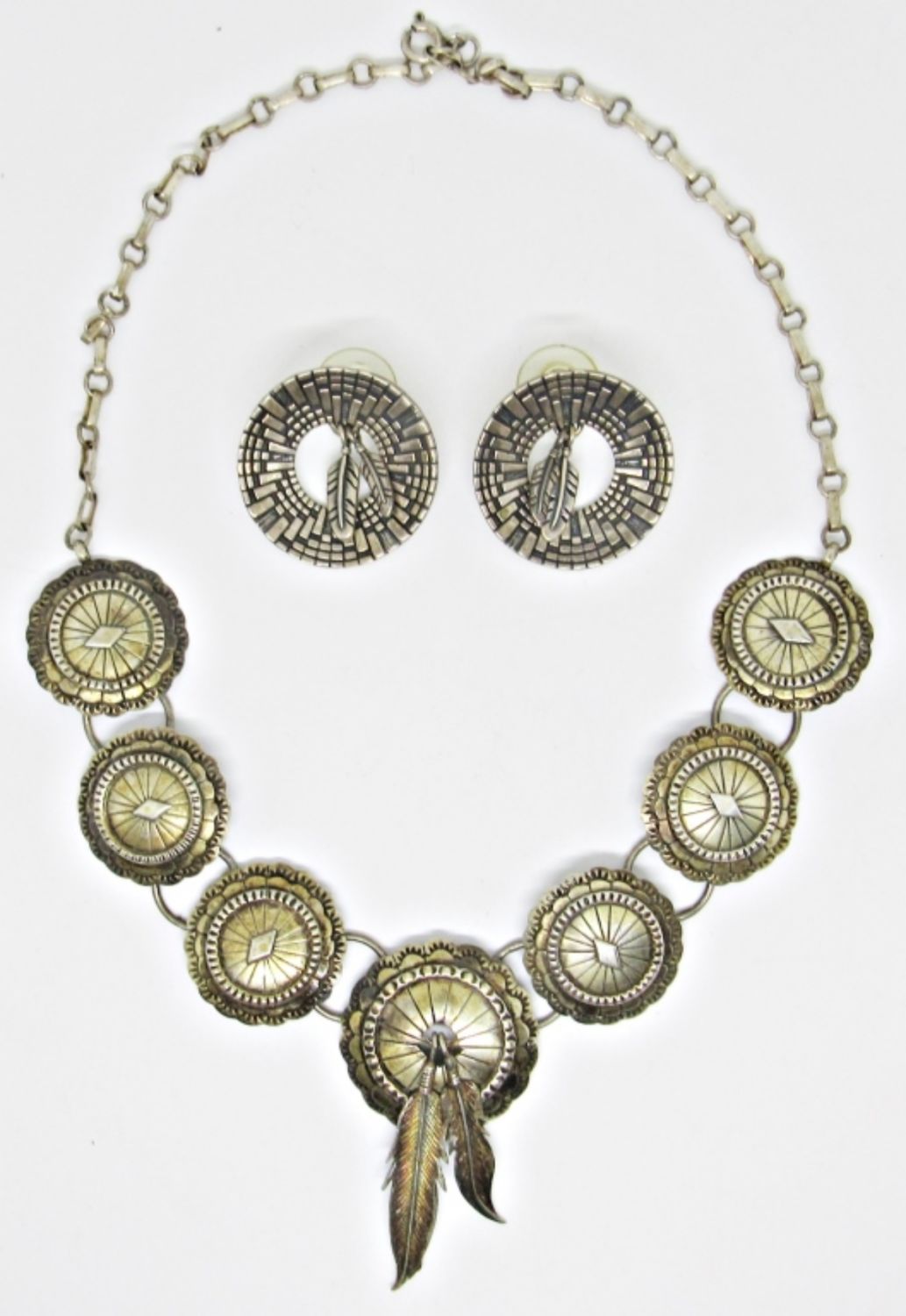 STERLING SILVER SOUTHWEST NECKLACE & EARRINGS WITH FEATHER CONCHO DESIGN STAMPED STERLING – EARRING STAMPS MASHA – NECKLACE 17″ LONG (34 DWT)