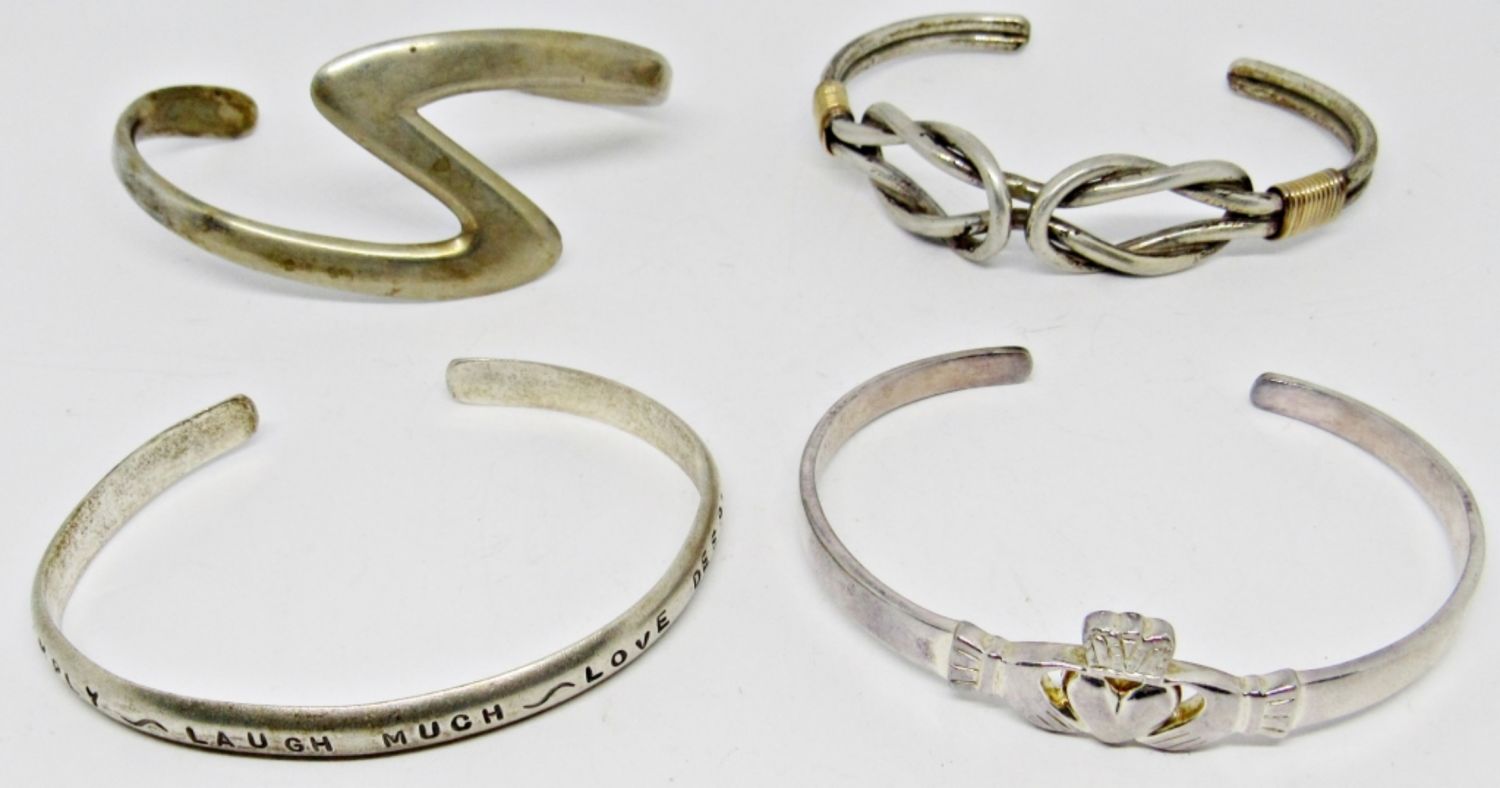 STERLING CUFF STYLE BRACELETS; (1) CLADDAUGH IRELAND MARKED – VARIOUS DESIGNS; MARKED STERLING (46 DWT)