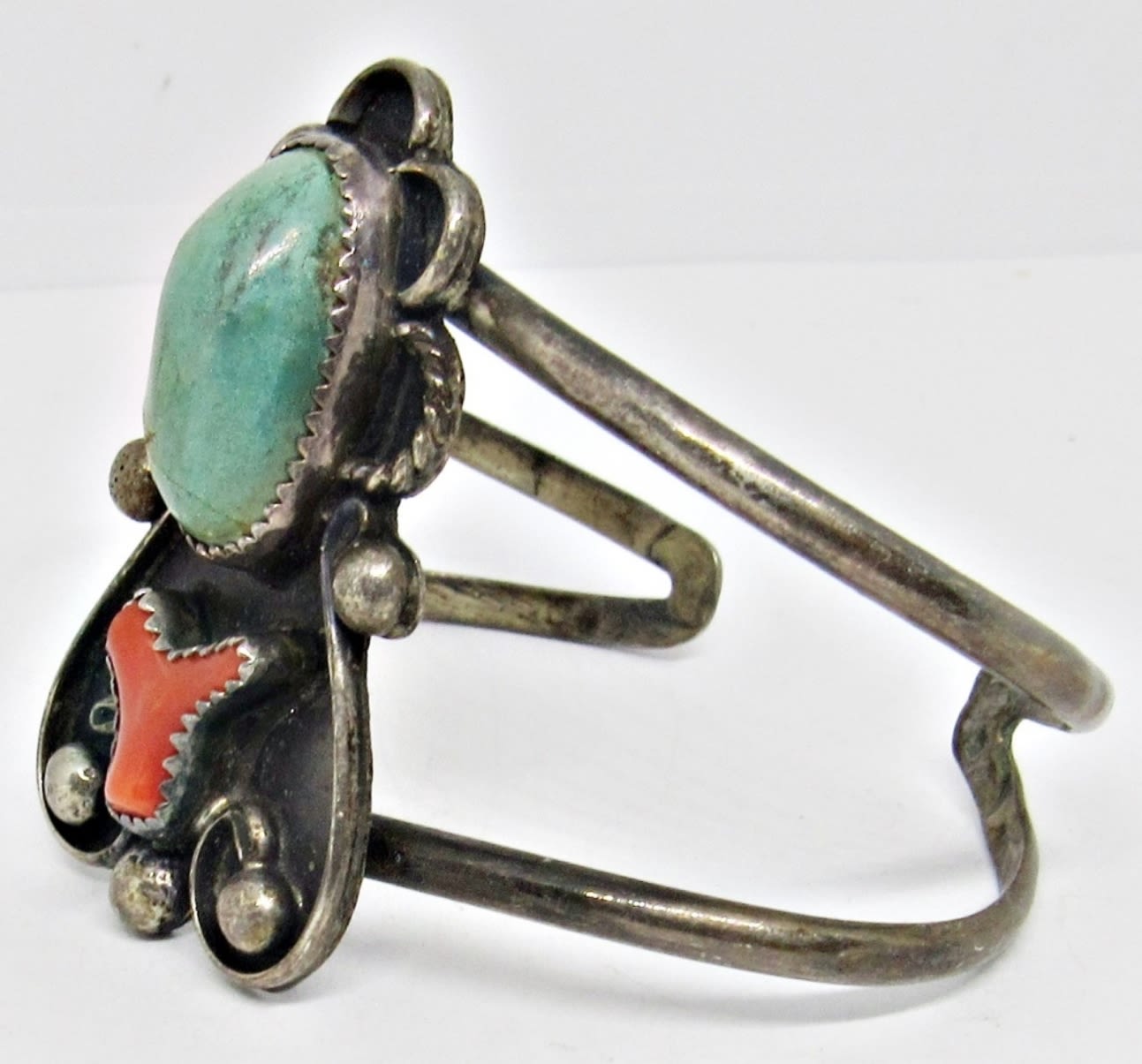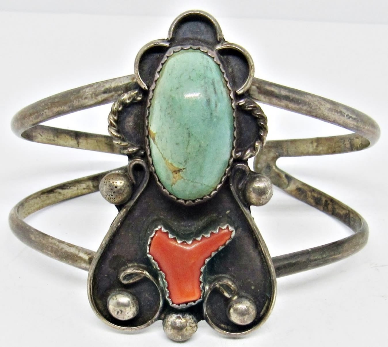 STERLING SILVER CUFF STYLE SOUTHWEST DESIGN BRACELET – LARGE TURQUIOSE AND COARL STONES 6 1/2″ (16 DWT)