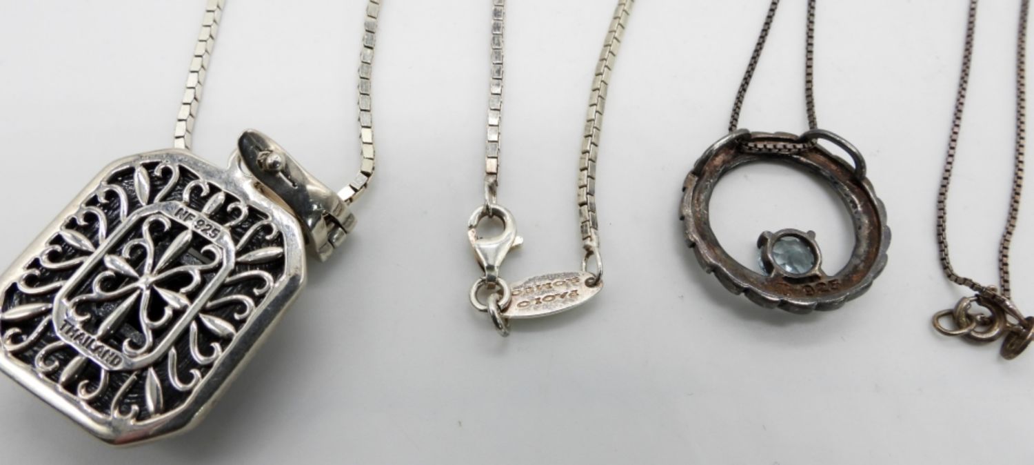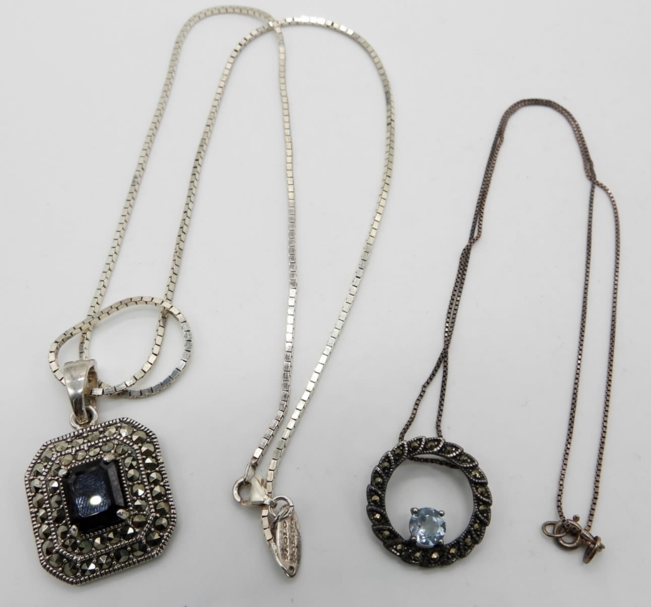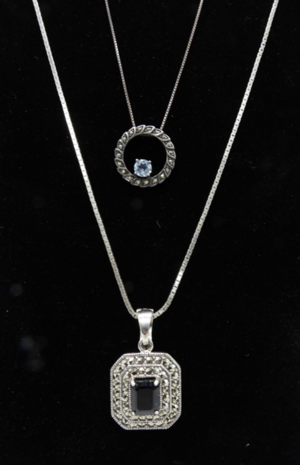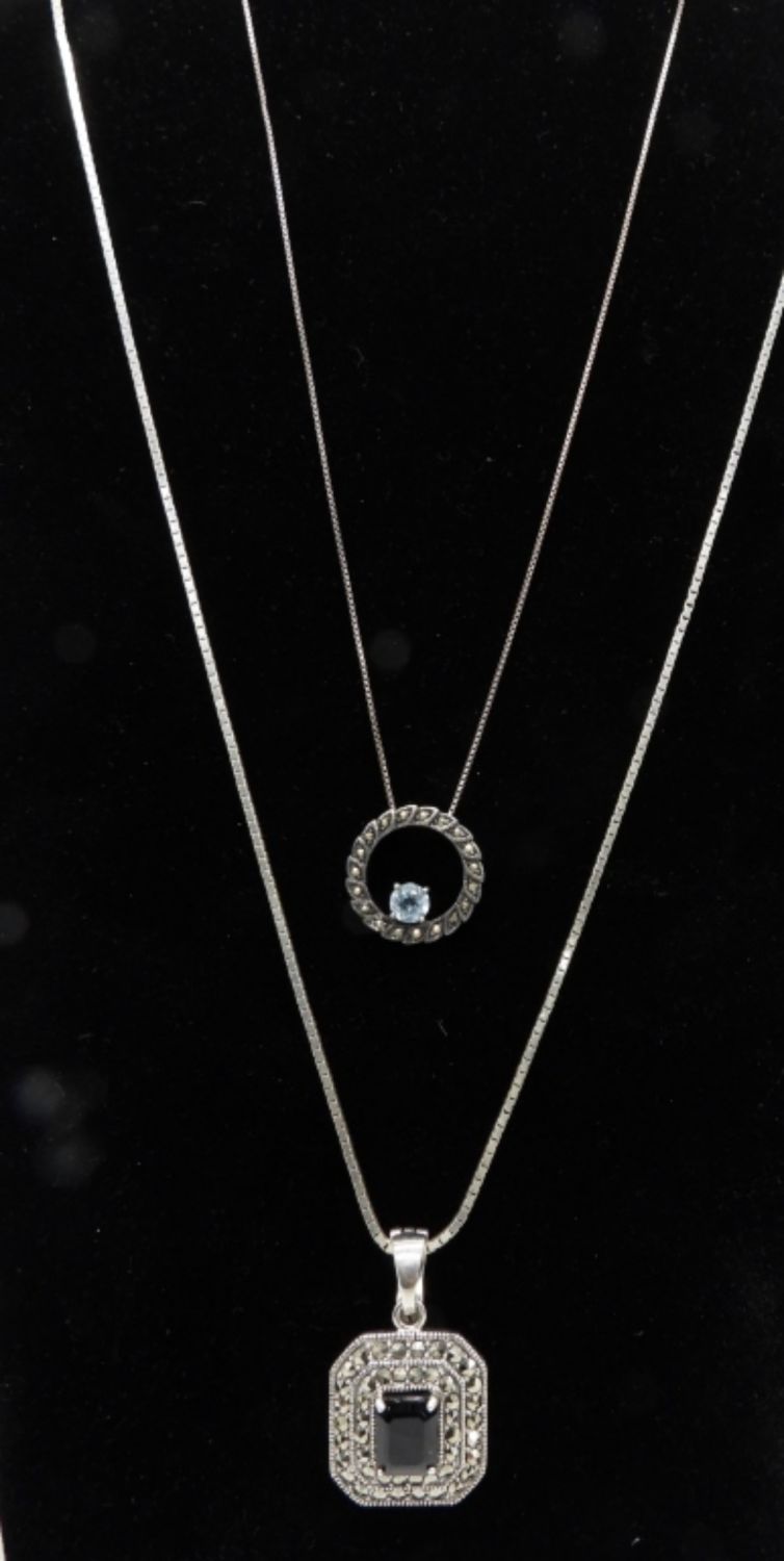 NF 925 MARCASITE STERLING PENDANT on BOX CHAIN 24″ LONG & 925 CIRCLE MARCASITE TOPAZ STONE NECKLACE 16″ ( 16 DWT)