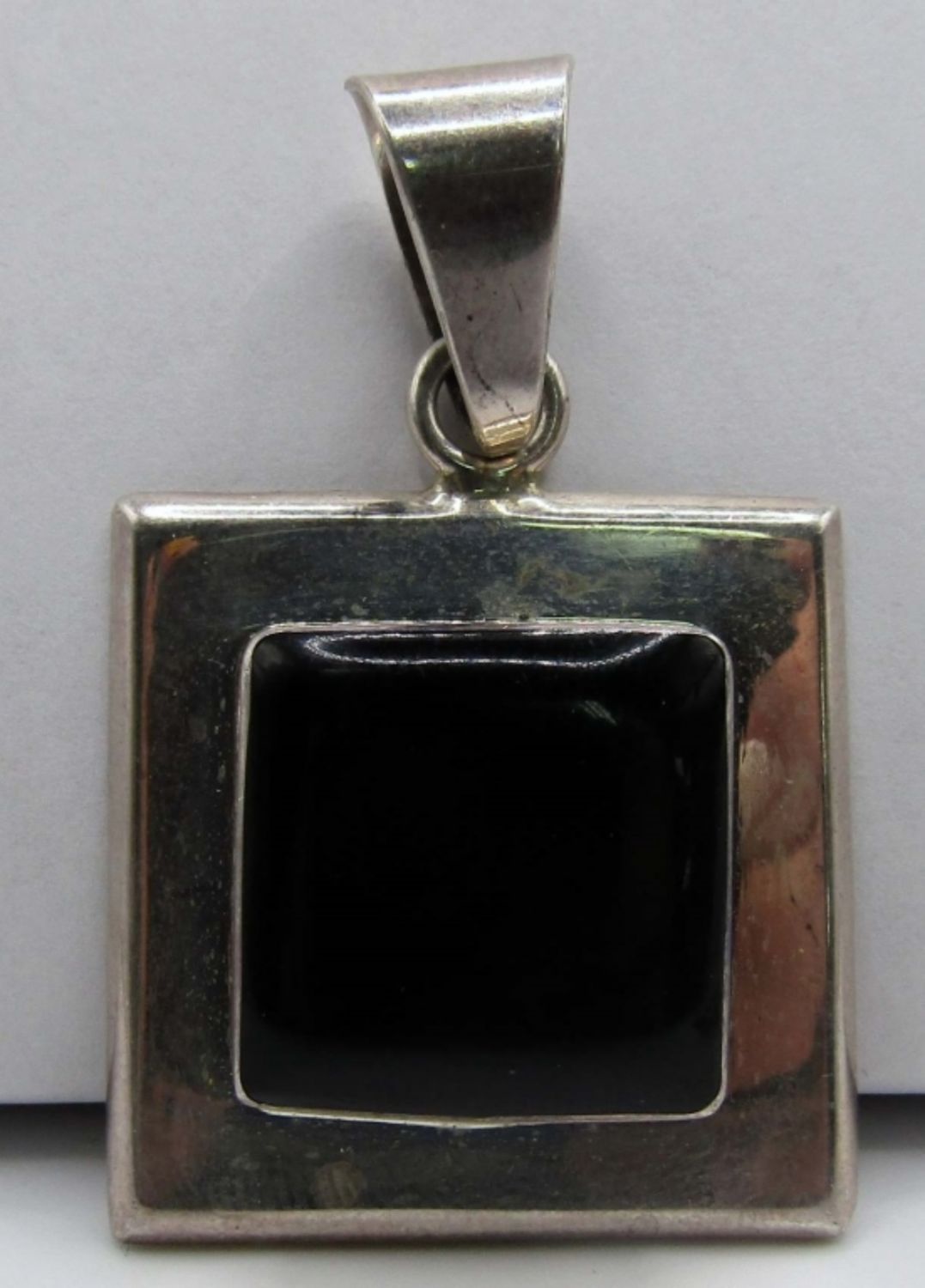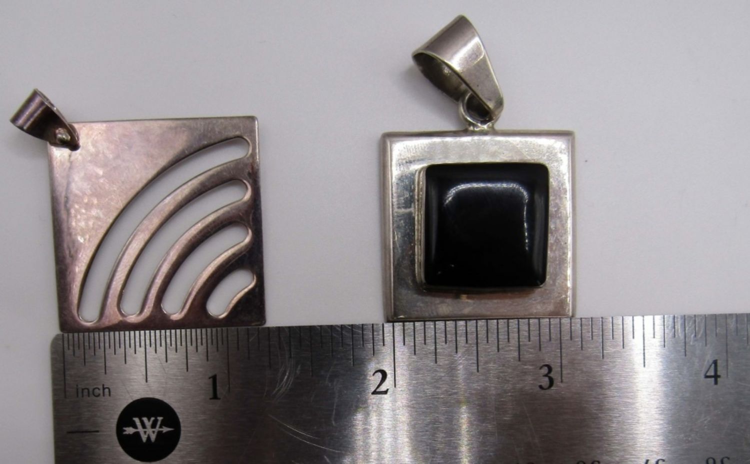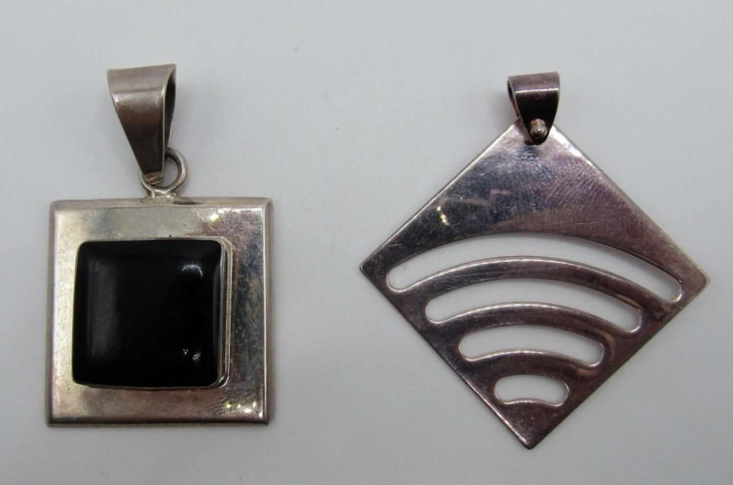 Pendant one has a Square black onyx stone with sterling framing it, Marked Mexico and 925 on back, Second one square with design marked with 925, 16DWT