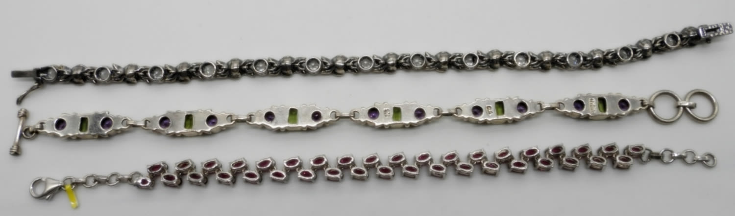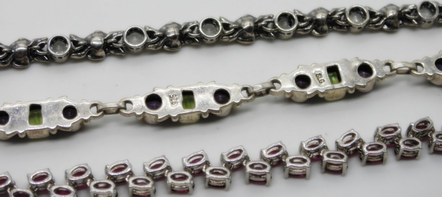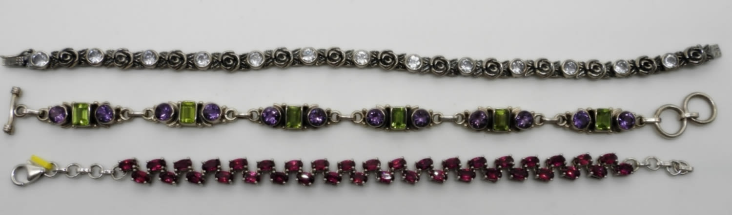 (1) STAMPED SLG INDIA with TOGGLE LATCH 7 1/2″, (1) 925 PZ ISRAEL ROSE TENNIS BRACELET 7 1/2″ (1) DARK PINK TOPAZ TENNIS BRACELET 7 1/4″