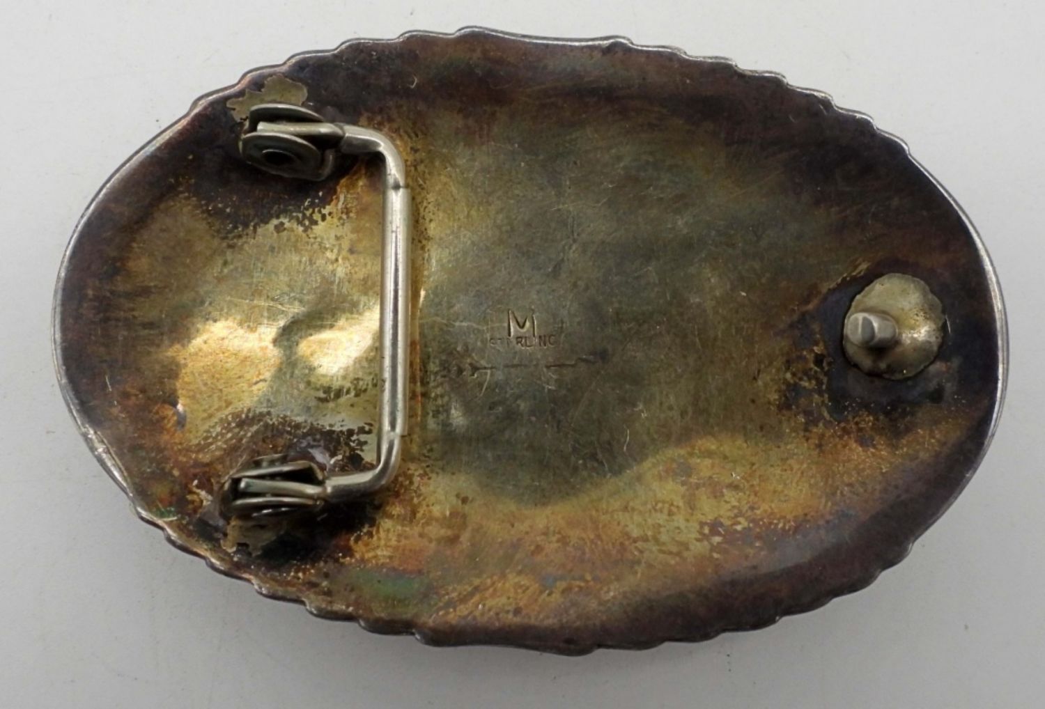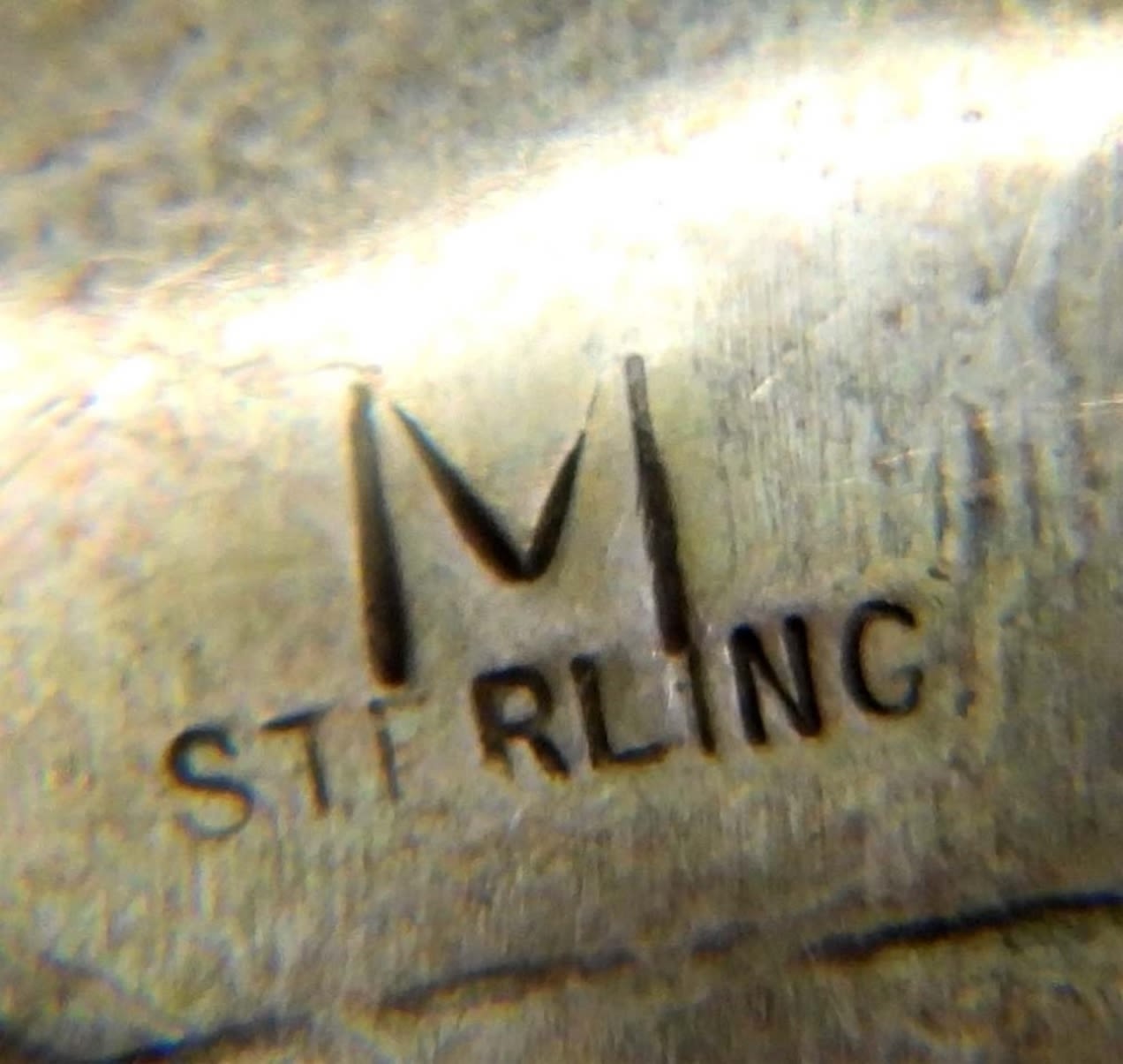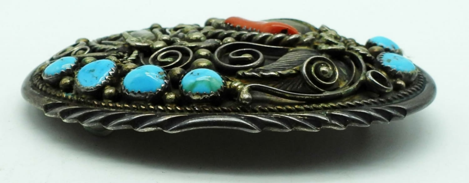 24DWT, LITTLE OVER 3IN LENGTH, STAMPED “M” STERLING MAKER PETE MORGAN, STUNNING DESIGN WITH TURQUOISE AND CORAL STONES
