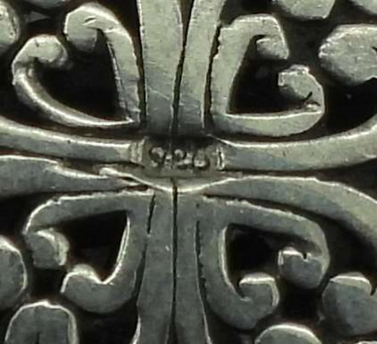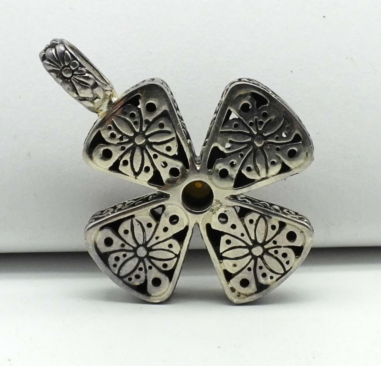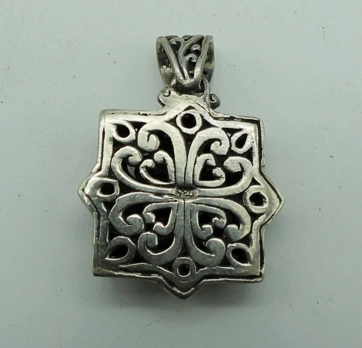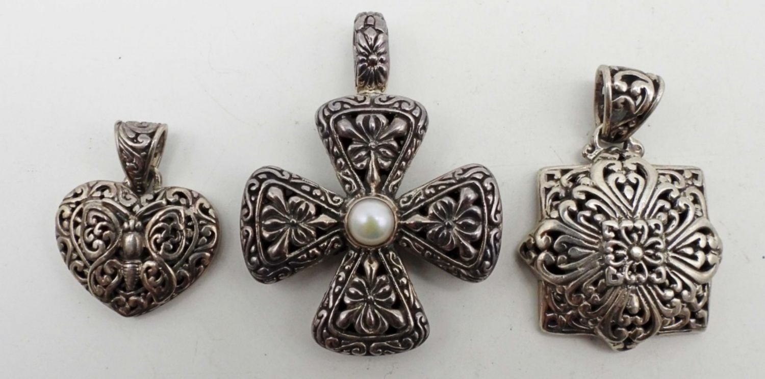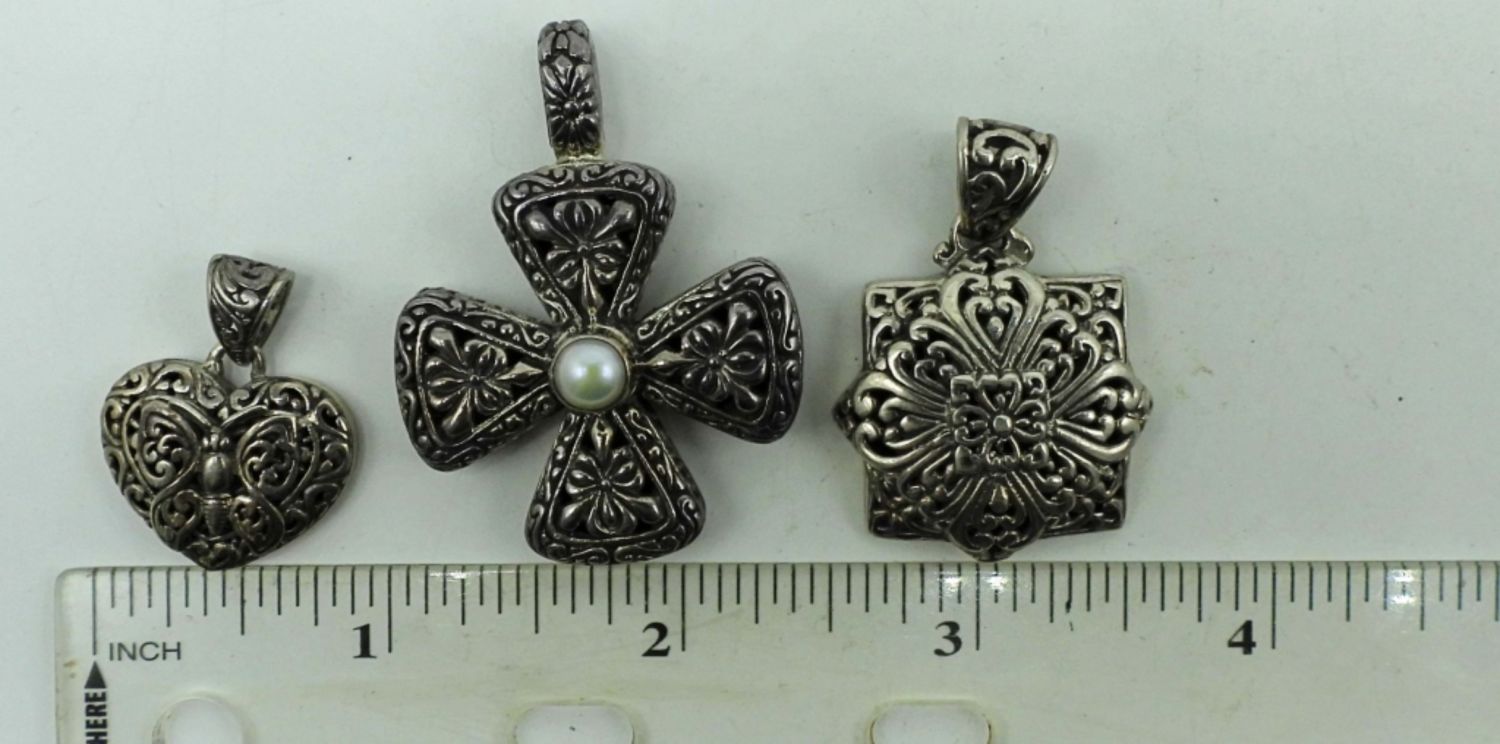 21DWT, 1-CROSS WITH A FAUX PEARL IN THE MIDDLE FLOWER DESIGN, 2IN LENGTH, 1- HEART WITH A BUTTERFLY IN THE MIDDLE, UNDER 1IN LENGTH, SQUARE DESIGN ABOUT 1 1/2IN LENGTH, ALL STAMPED ON THE BACK 925
