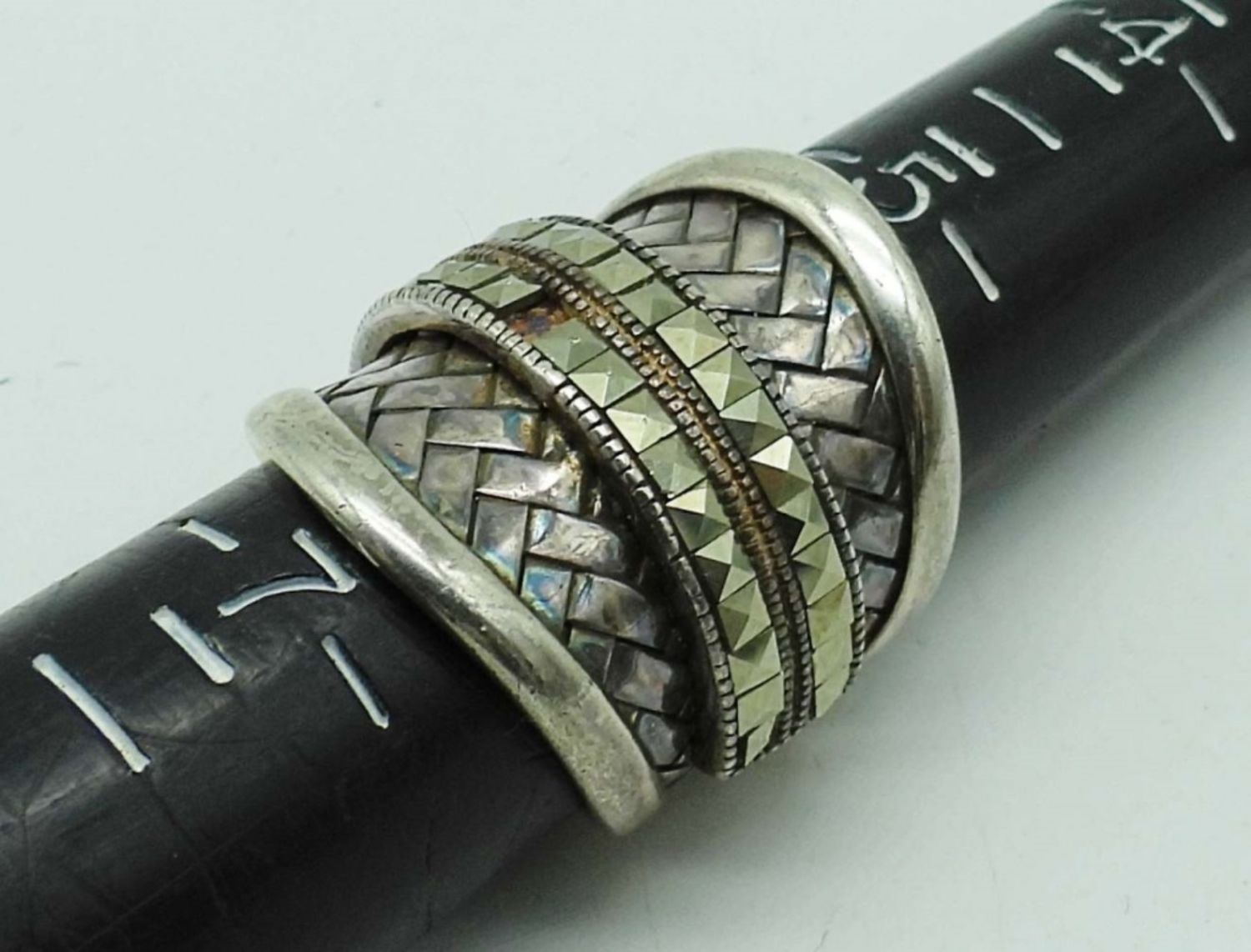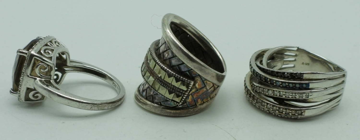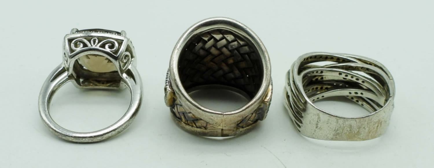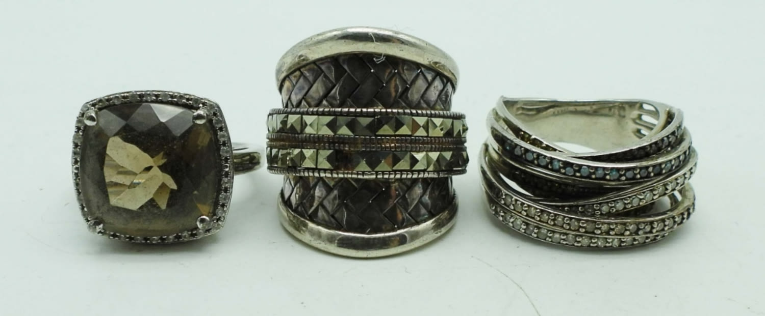 (1) BROWN QUARTZ SIZE 7, (2) UNIQUE STYLE RINGS SIZES 6 & 7 with (1) MARCASITE missing on the tall ring – (17 DWT)