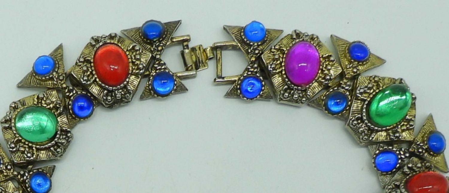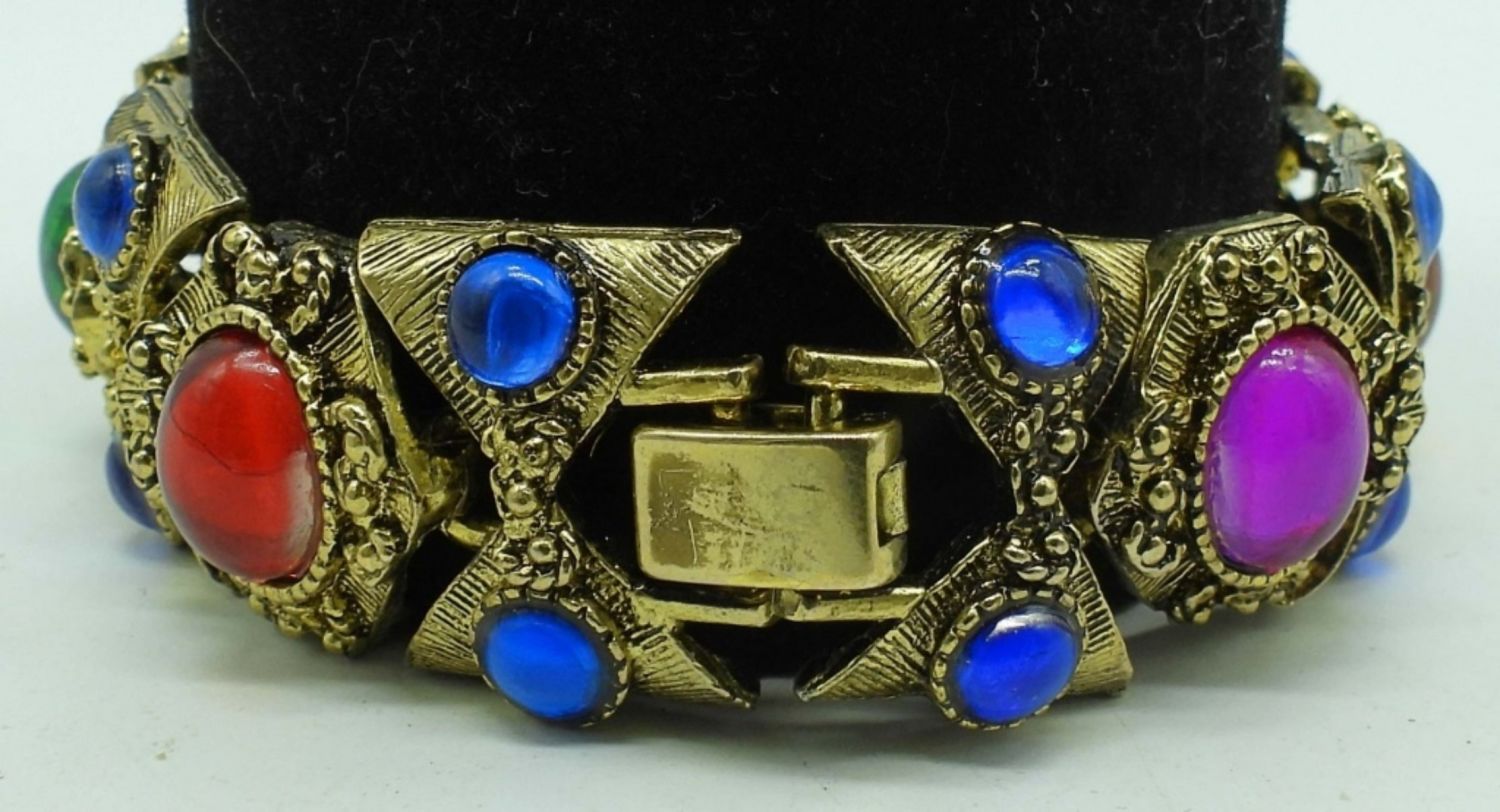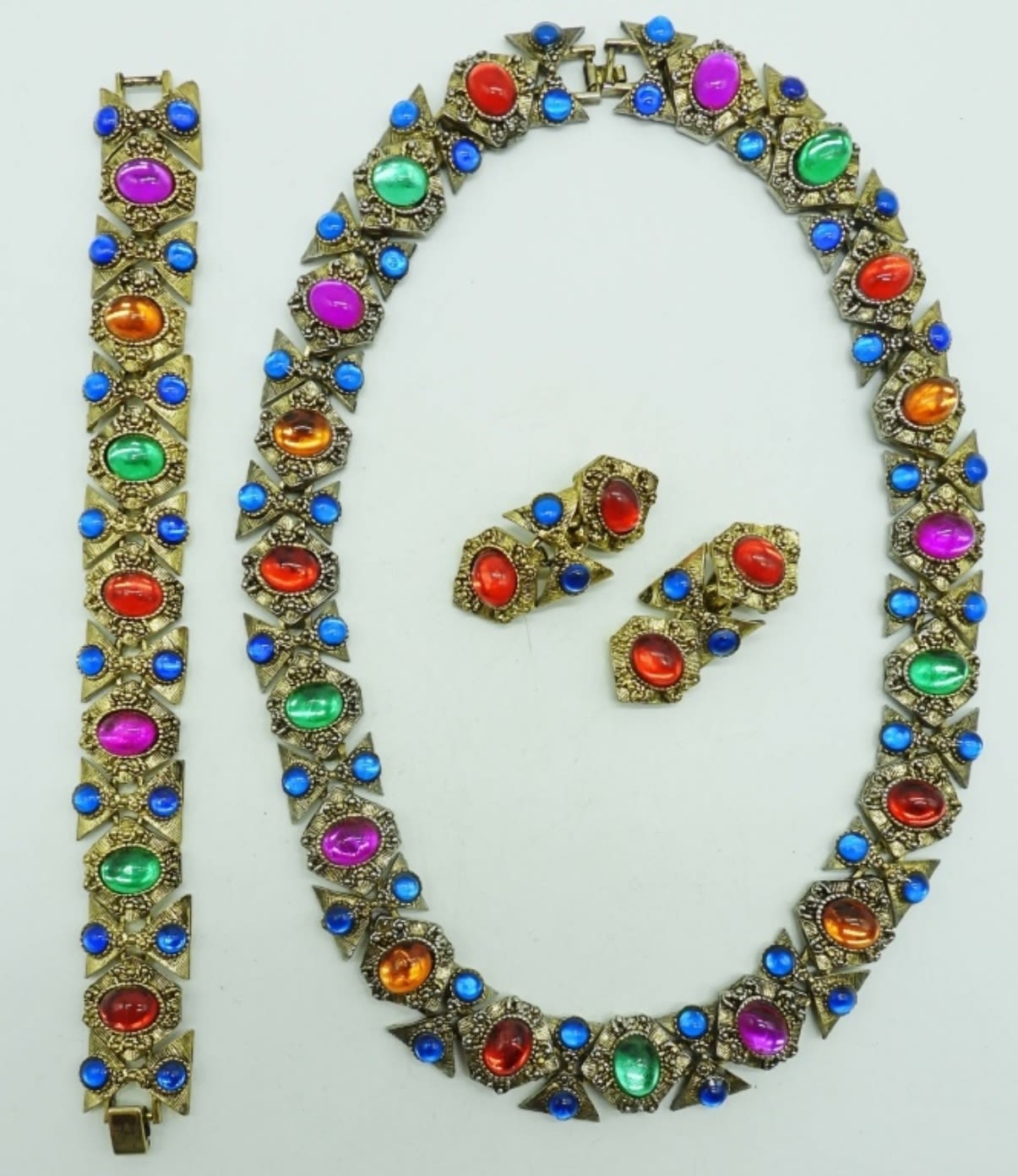 GOLDTONE SET WITH BLUE, ORANGE, PINK, RED GEMS, NECKLACE 18IN LENGTH ( CLASP WILL NEED LIGHT REPAIR), 7IN BRACELET, CLIP-ON EARRINGS
