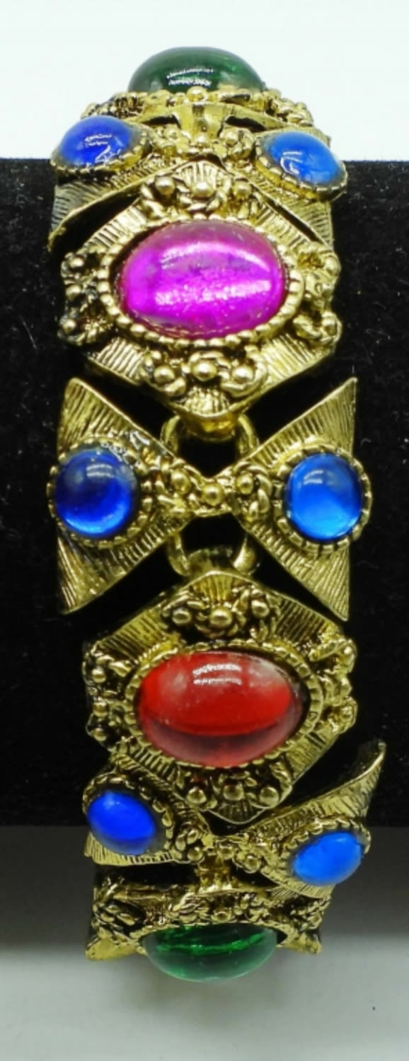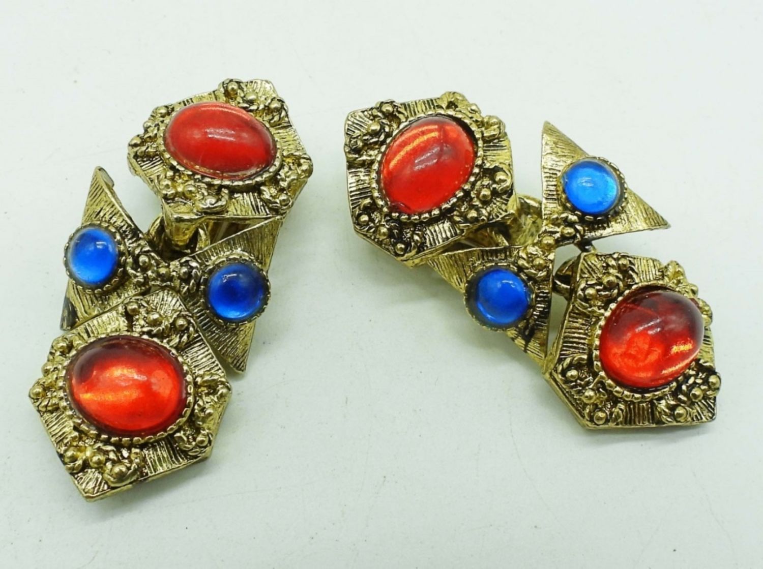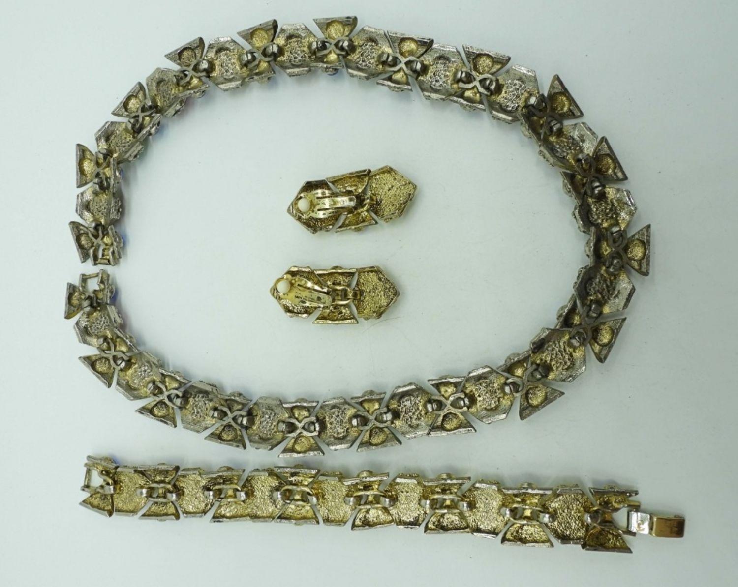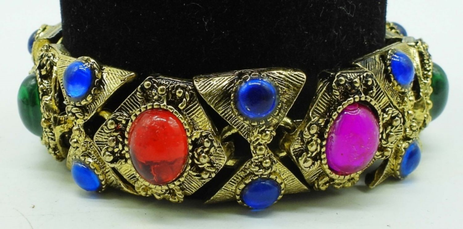 GOLDTONE SET WITH BLUE, ORANGE, PINK, RED GEMS, NECKLACE 18IN LENGTH ( CLASP WILL NEED LIGHT REPAIR), 7IN BRACELET, CLIP-ON EARRINGS