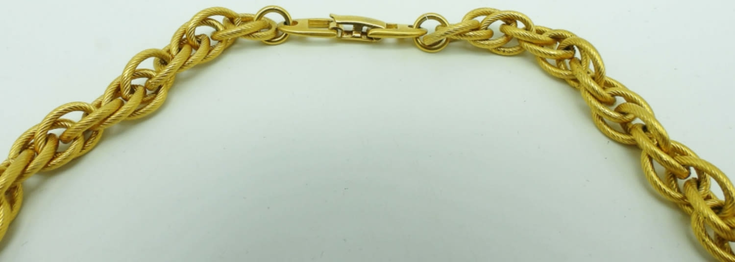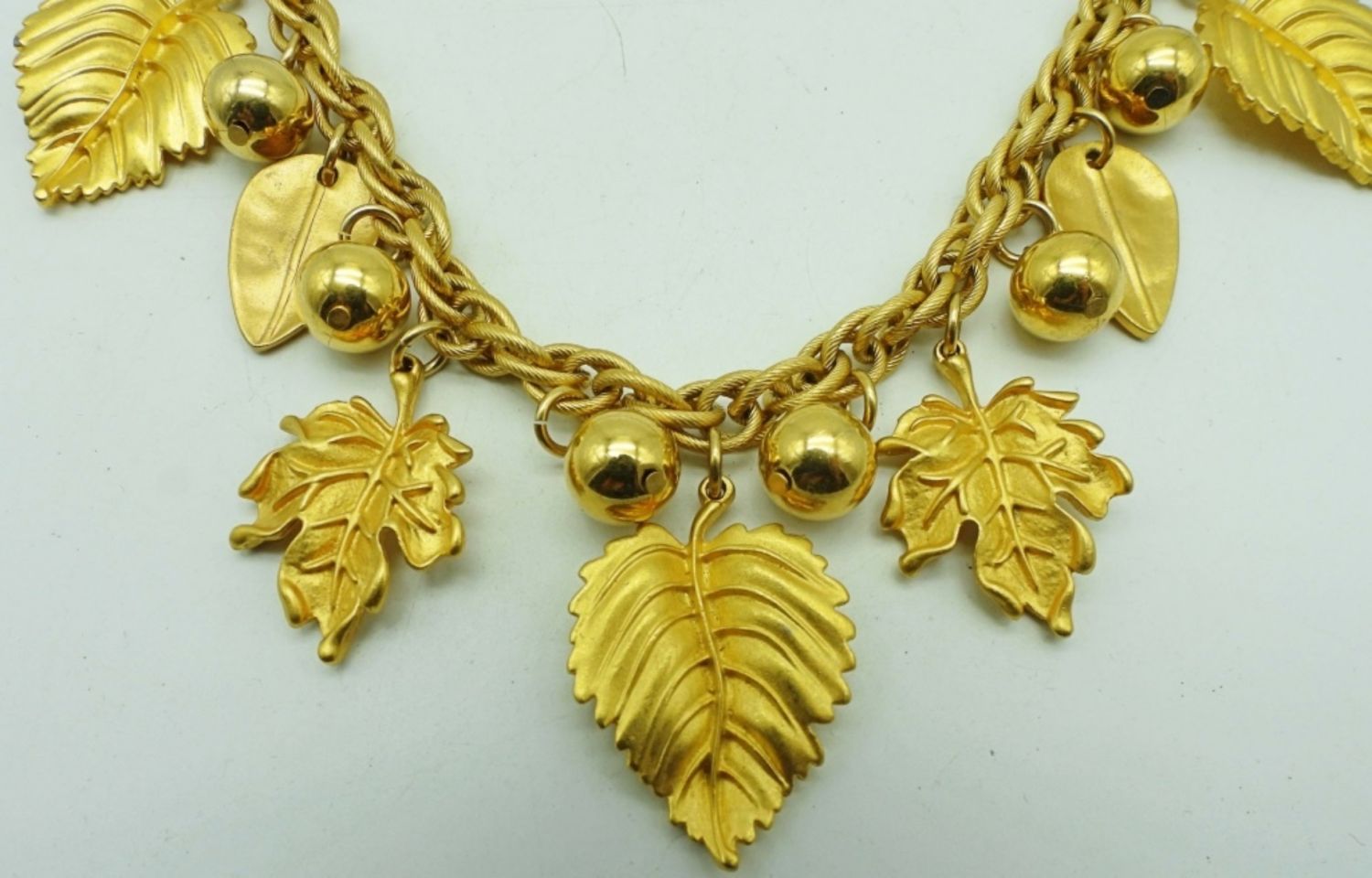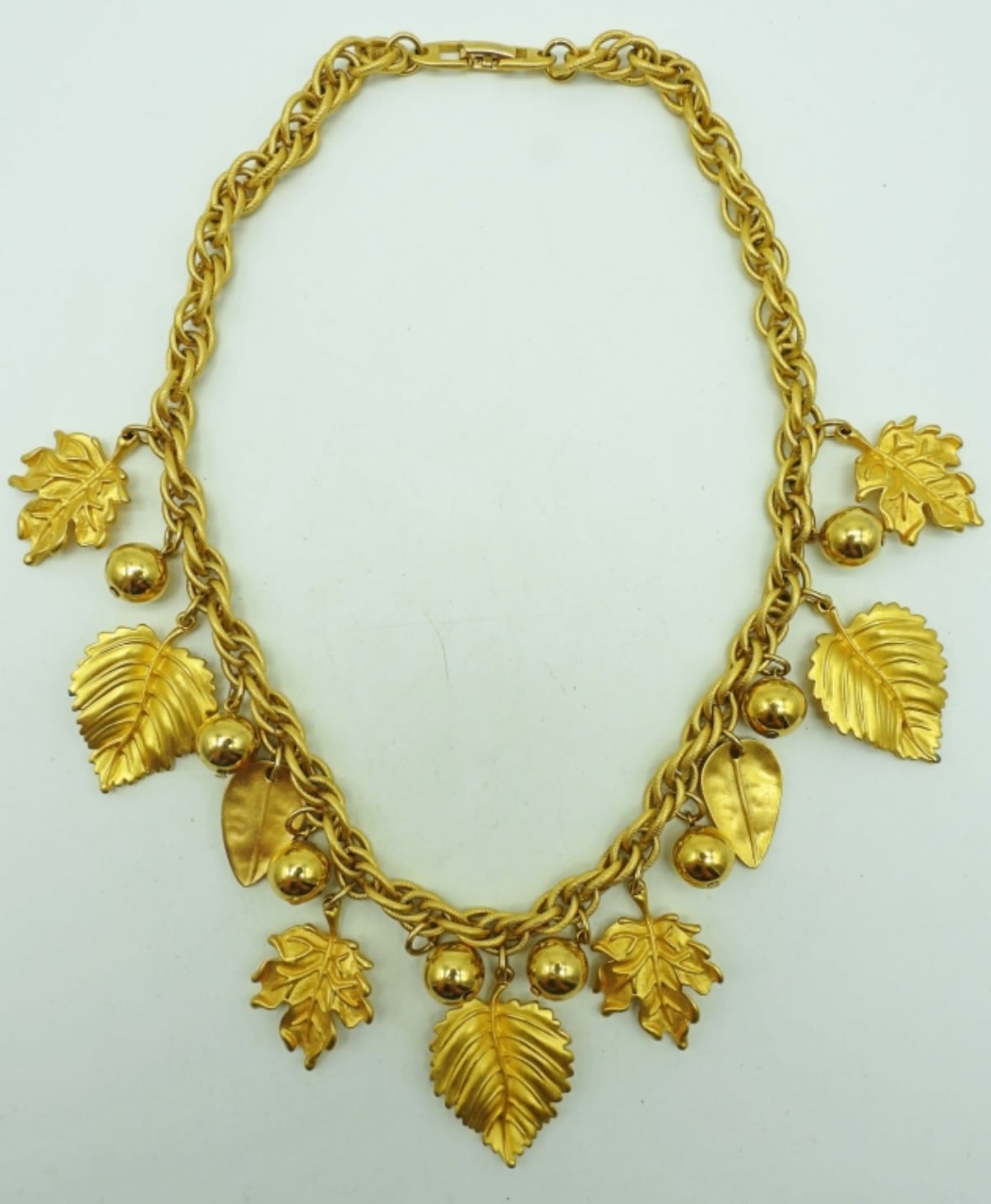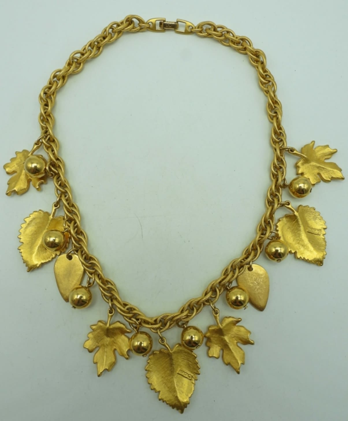 18IN LENGTH, LEAVES AND BALLS MAKE THE NECKLACE WITH AN OPEN BOX CLASP AND STAMP OF MAKER