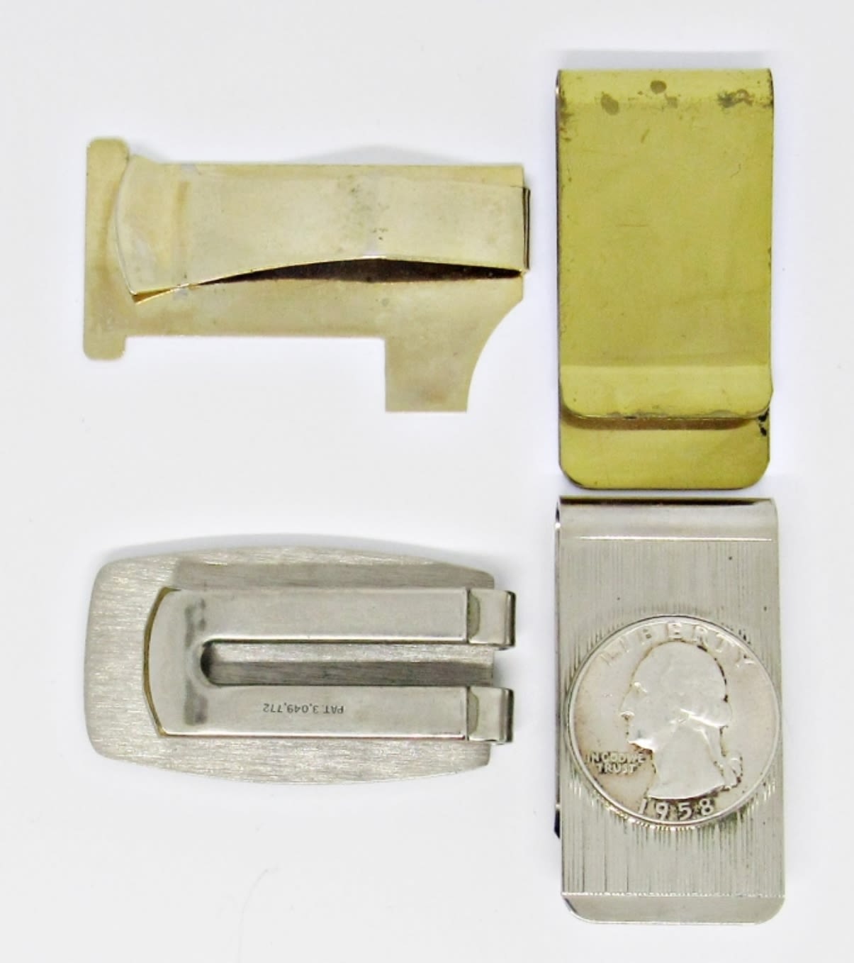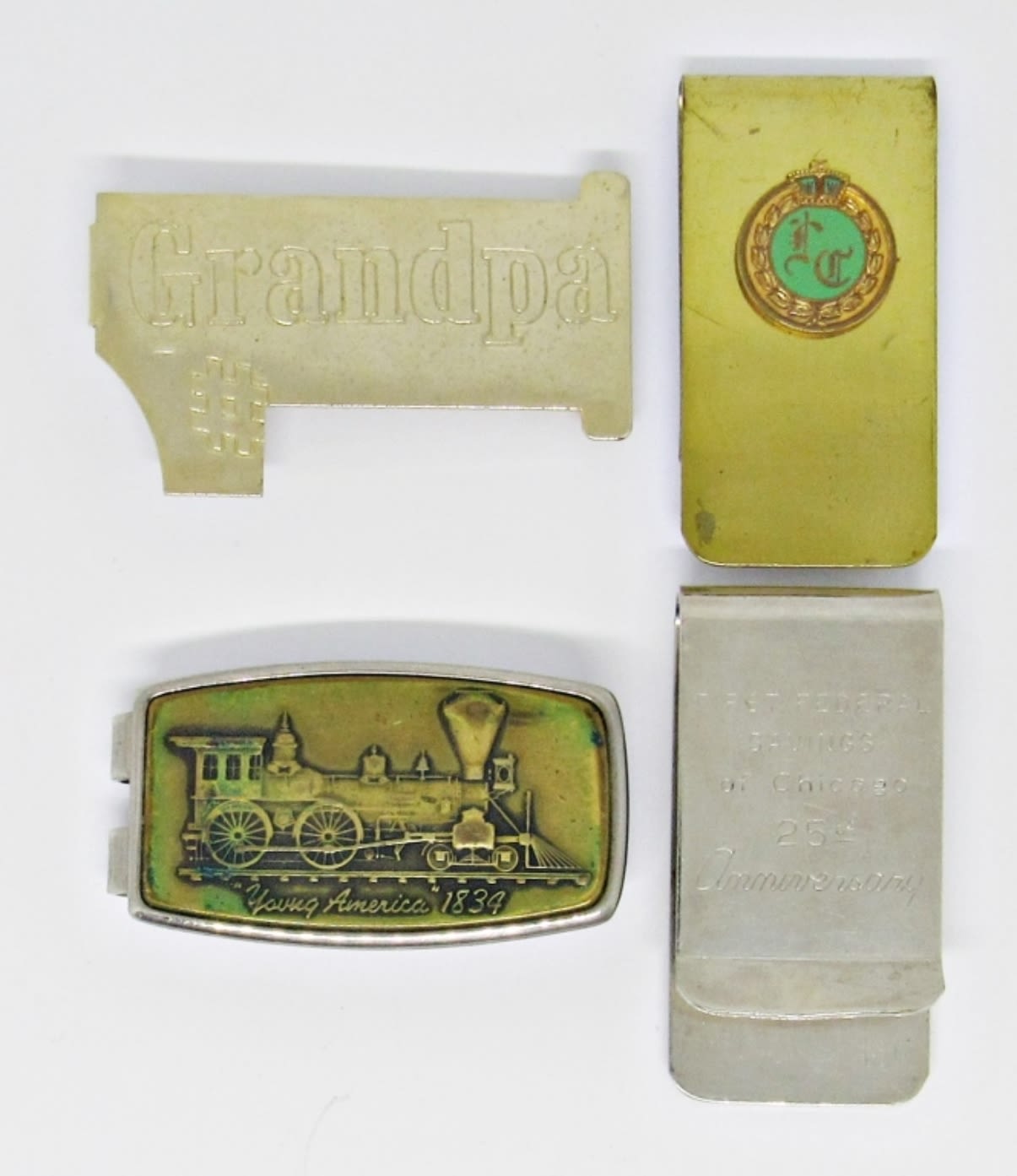 LITTLE OVER 2IN IN LENGTH, 1-QUARTER WITH ENGRAVING ON BACK, 1- TRAIN CLIP, 1- #1 GRANDPA, 1- GOLD TONE