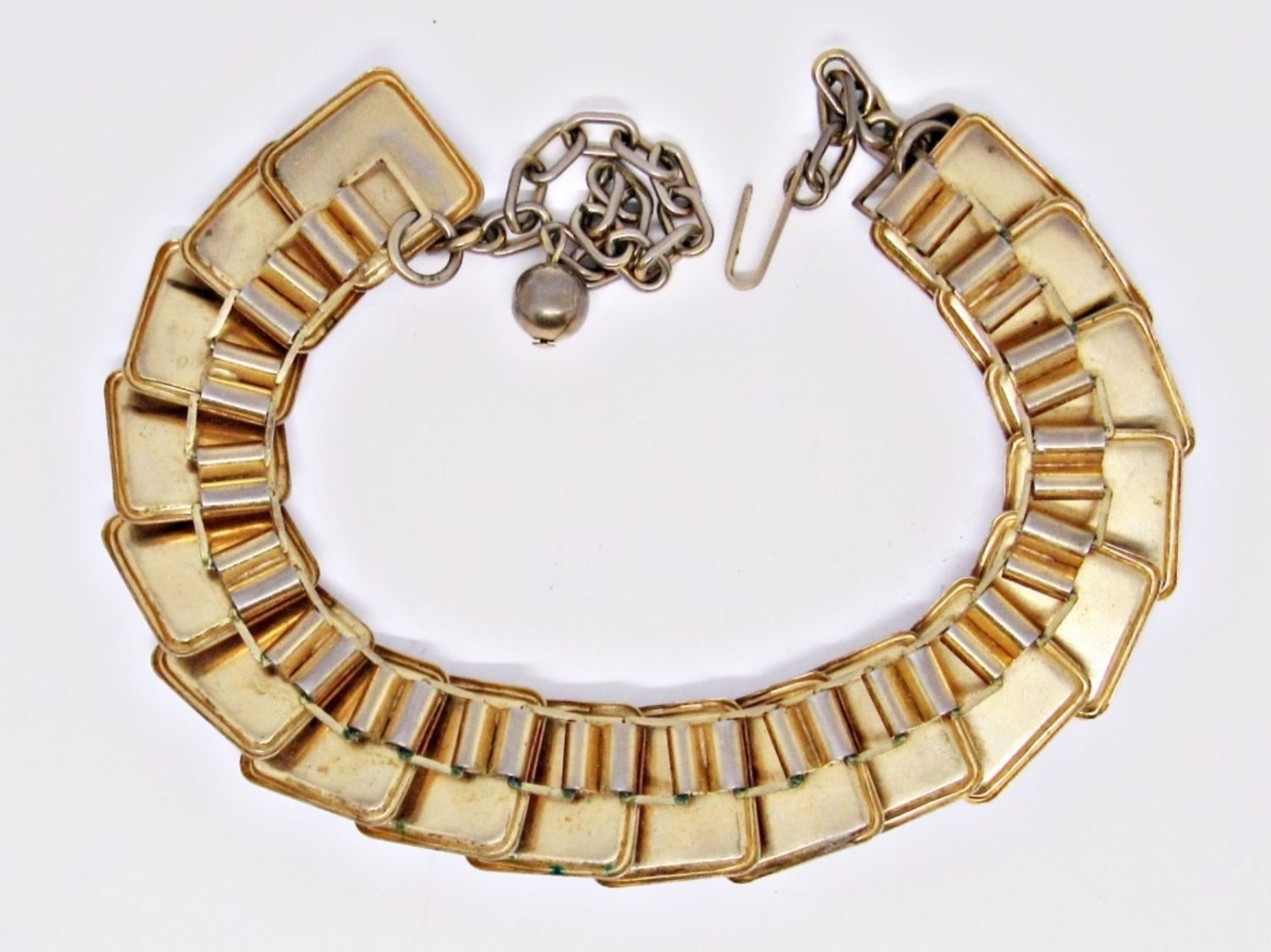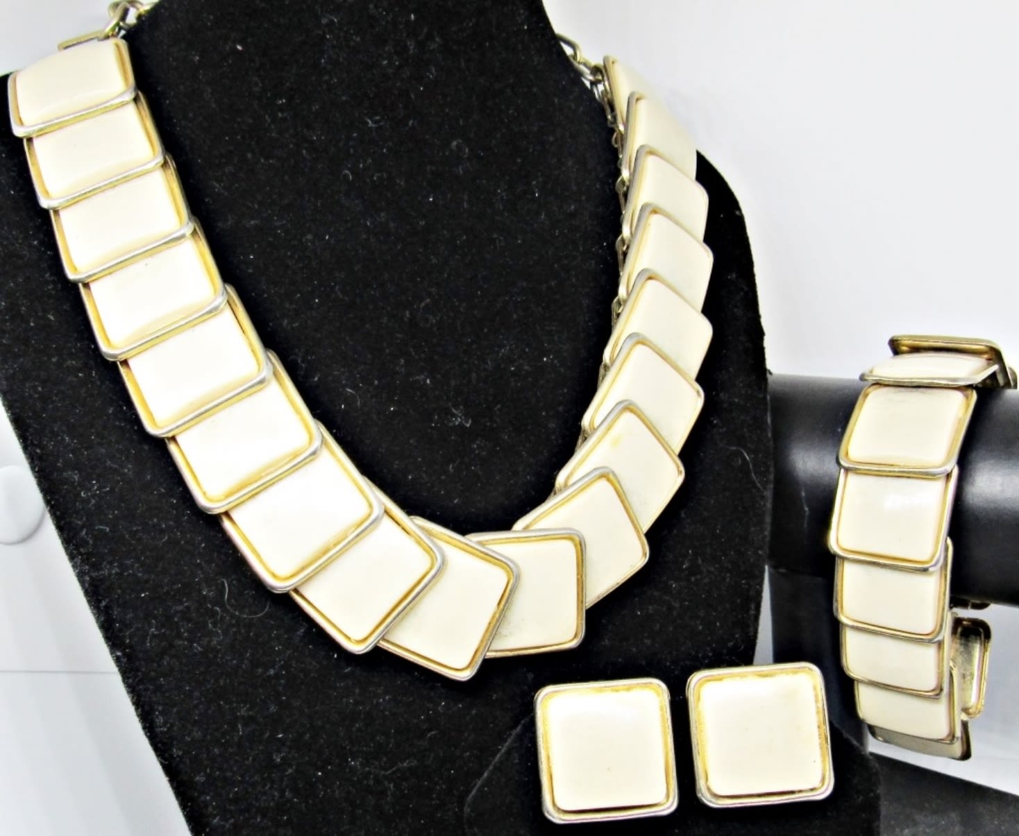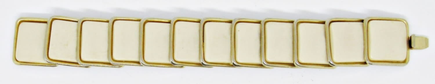17 1/2IN LENGTH, HOOK CLASP, ADJUSTABLE, CREAM OFF-WHITE SQUARES MAKE UP THE PIECES, BRACELET IS 7IN LENGTH, OPEN BOX CLASP