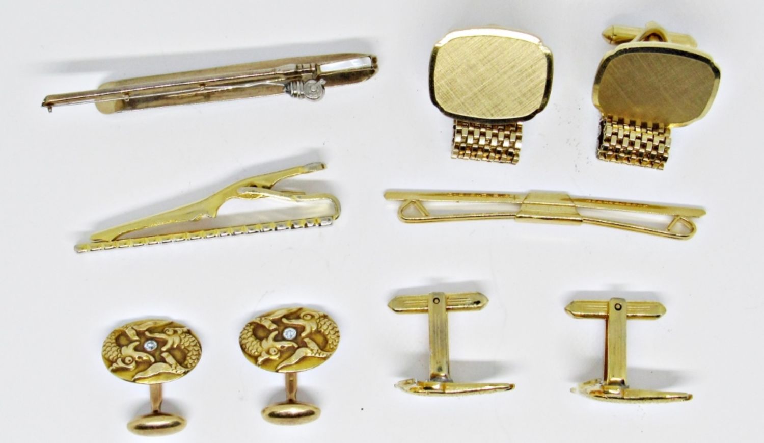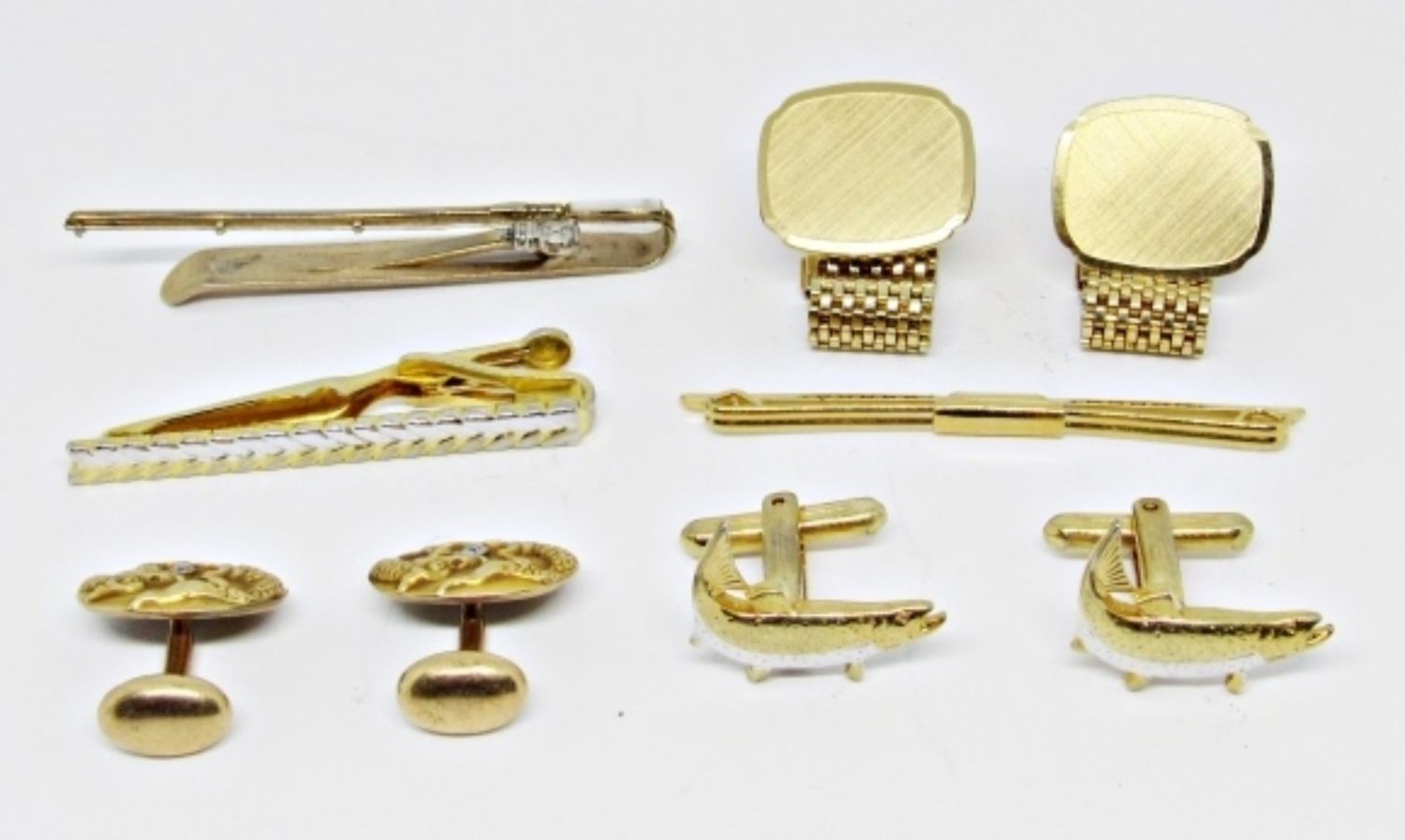 CUFFLINKS- 1 ALL GOLDTONE, 2 – FISH CUFFLINKS, TIE CLIPS-1 TWO TONE,1 FISHING POLE, AND 1 GOLD TONE