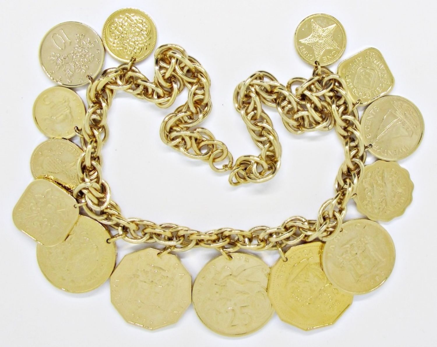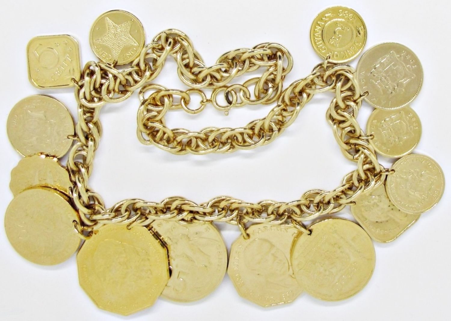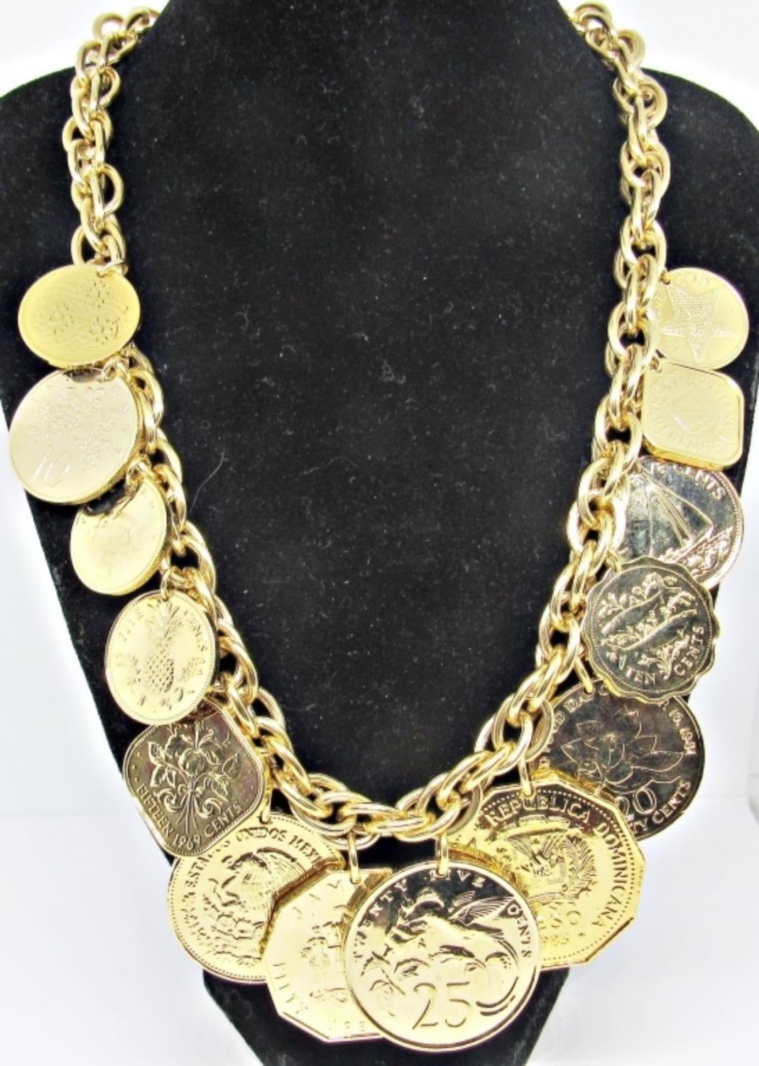 17IN LENGTH, ADJUSTABLE, GOLD TONE, SOME COINS REPRESENT JAMAICA, MEXICO, GUYANA, REPUBLICA DOMINICANA, BAHAMAS