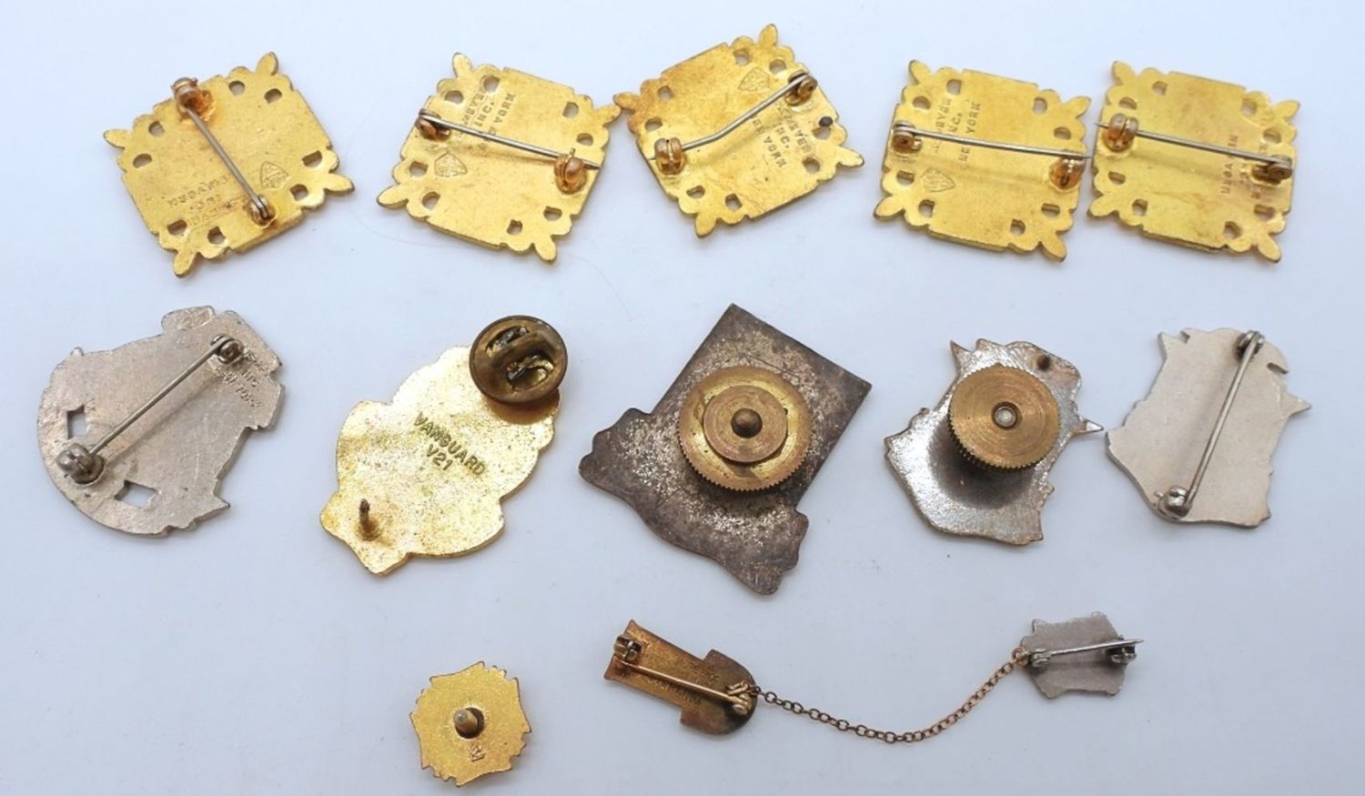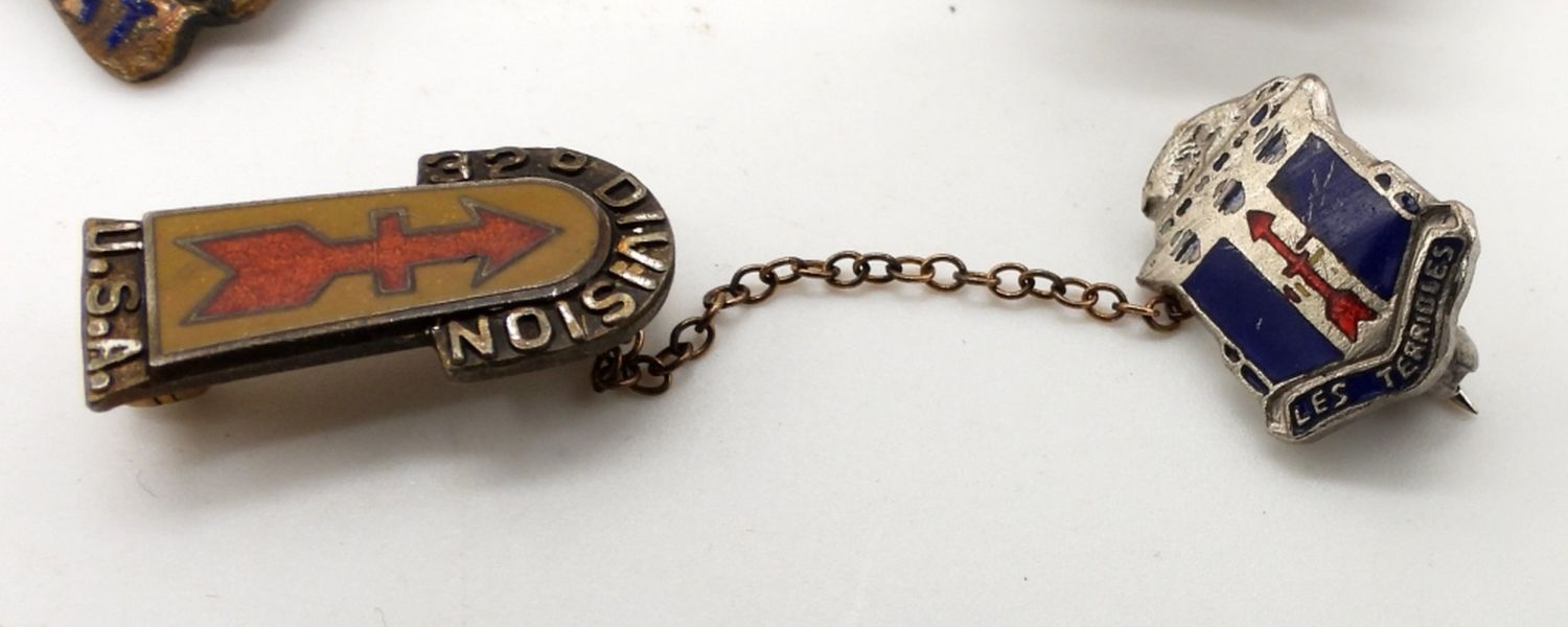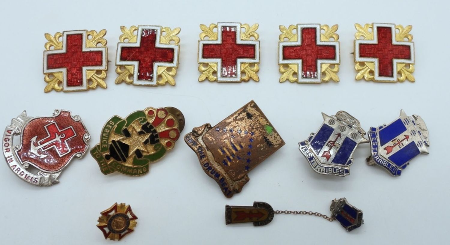 (2) ARMY 127th INFANTRY PINS(1) 32nd DIV, (1) LET THE DRUMS BEAT, (1) VIGOR IN ARDUIS, (1) SERVICE COMMAND & (5) RED CROSS PINS