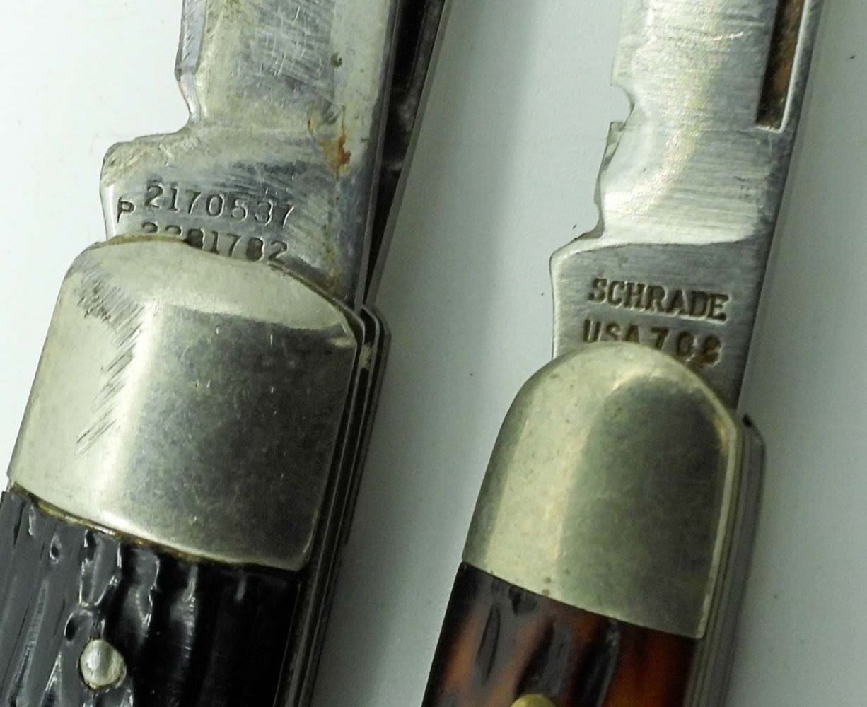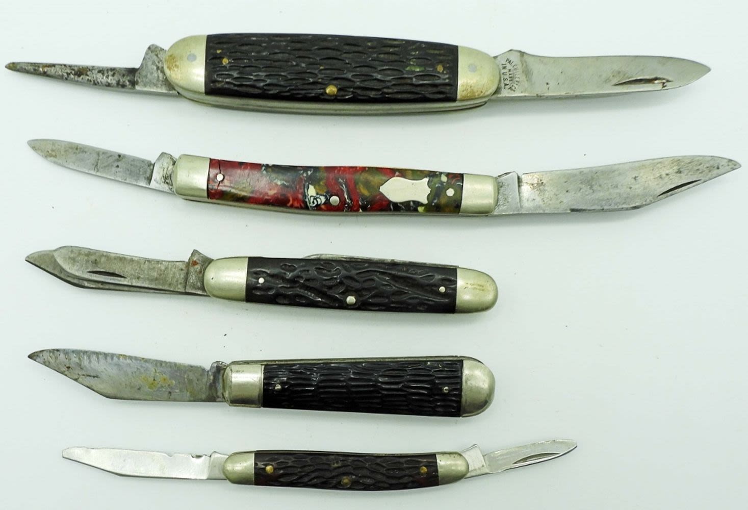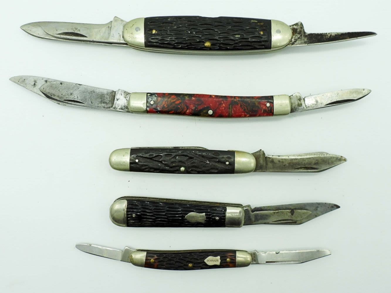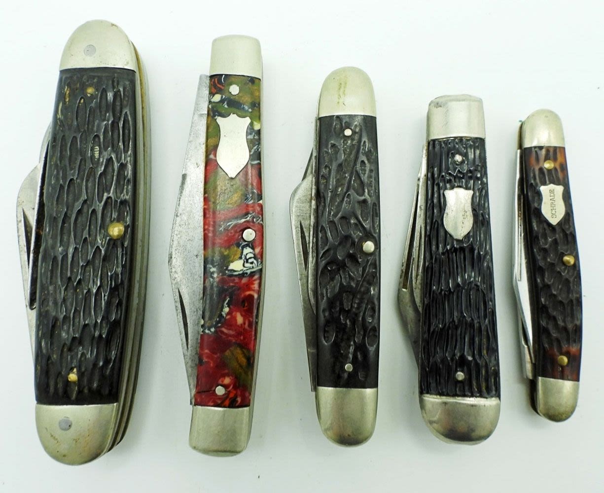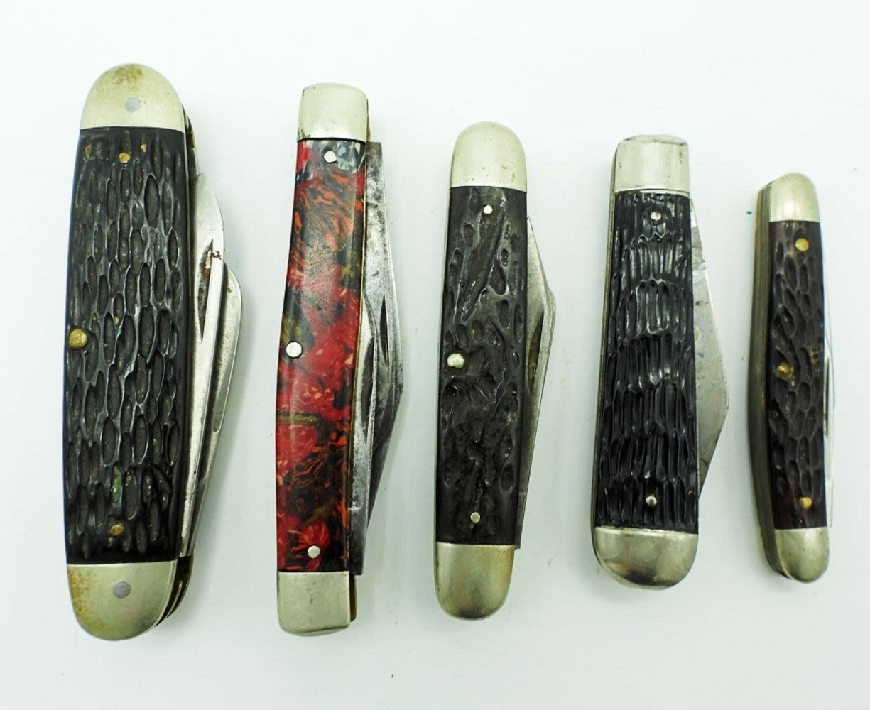 3 Blade 3 3/4″, Seneca Cutlery Co. Utica NY 3 Blade 3 5/8″, Robeson Schuredge 633865 3 Blade 3 1/4″, Imperial 2 Blade 3″, Schrade USA 708 2 Blade 2 3/4″; All Used Conditions.