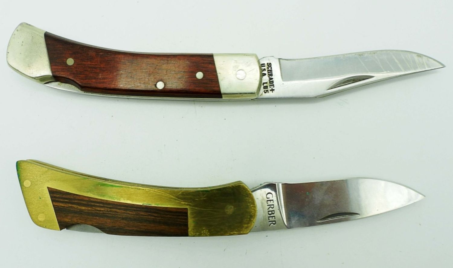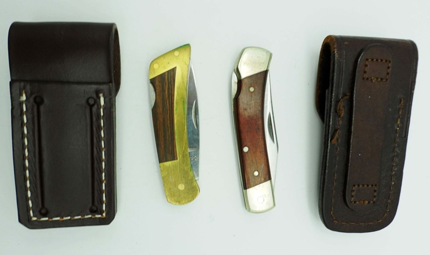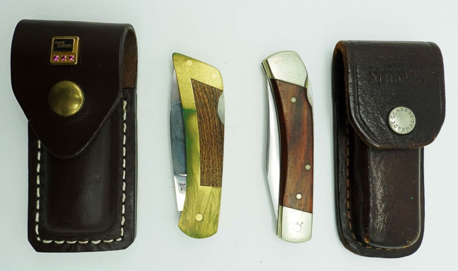 Schrade USA LB5 in Schrade Leather Holder, Gerber Portland OR 97223 USA in Leather Holder “Detroit Edison” Emblem On Holder.