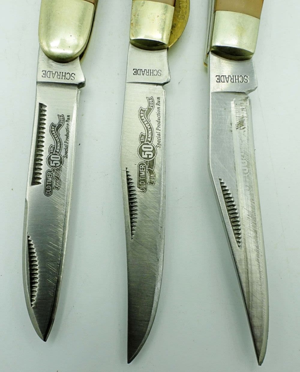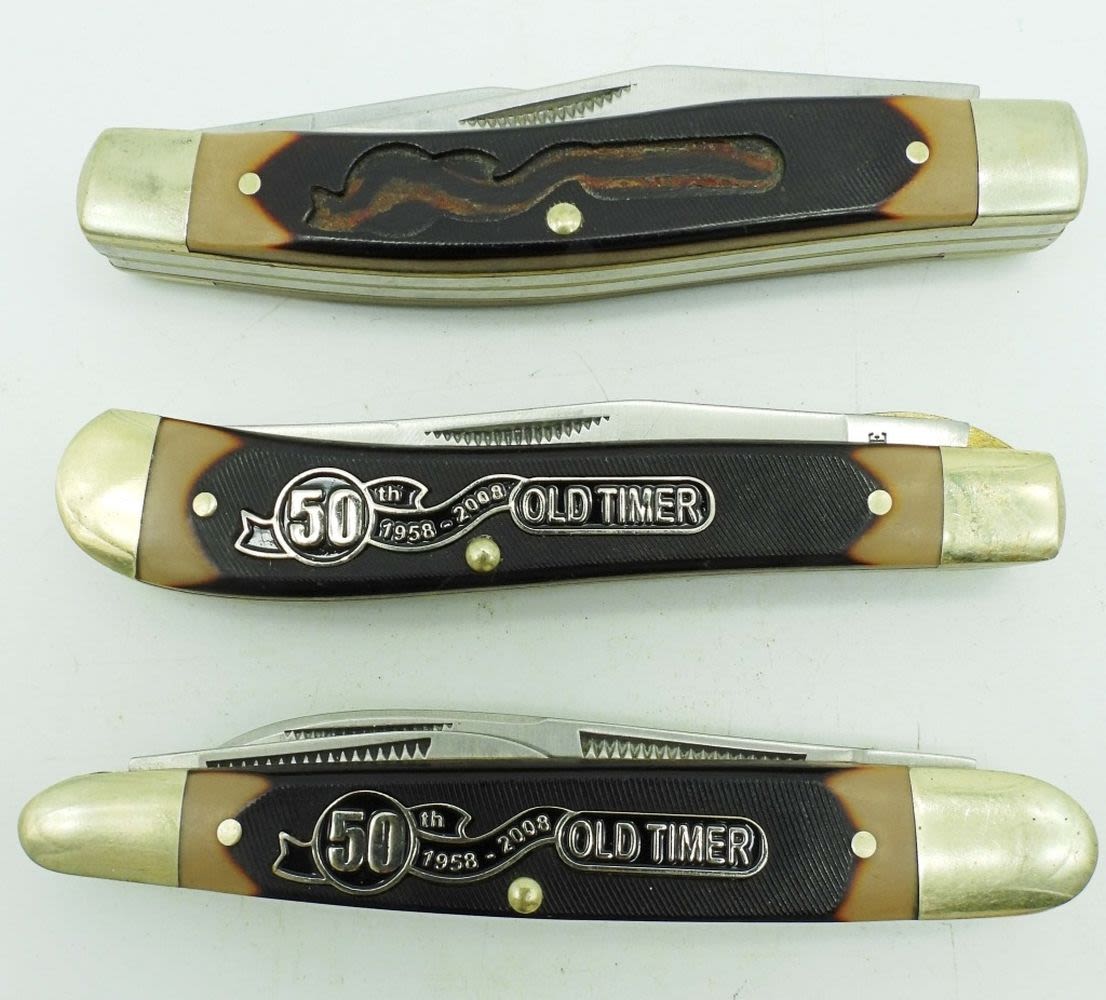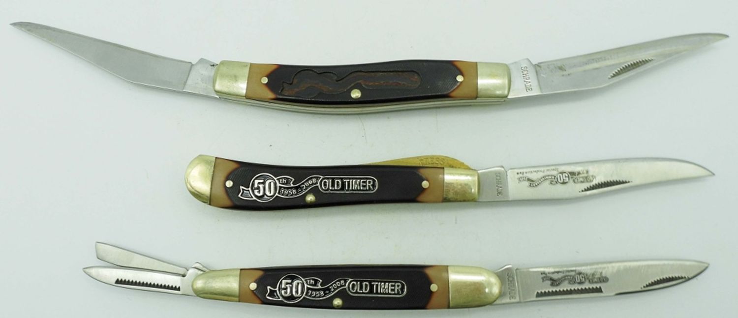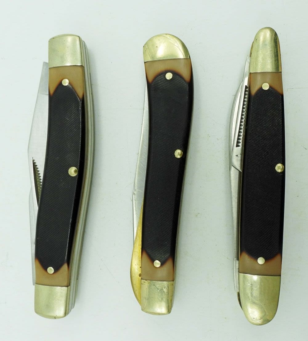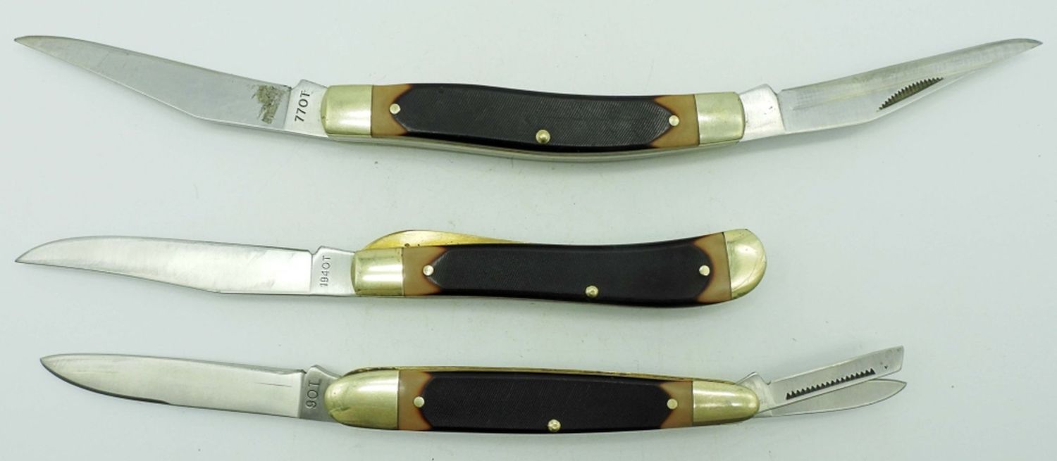 3 Blade 9OT, 2 Blade 77OT (Missing Front Emblem), Single Blade 194OT; Lightly Used Folding Pocket Knives.