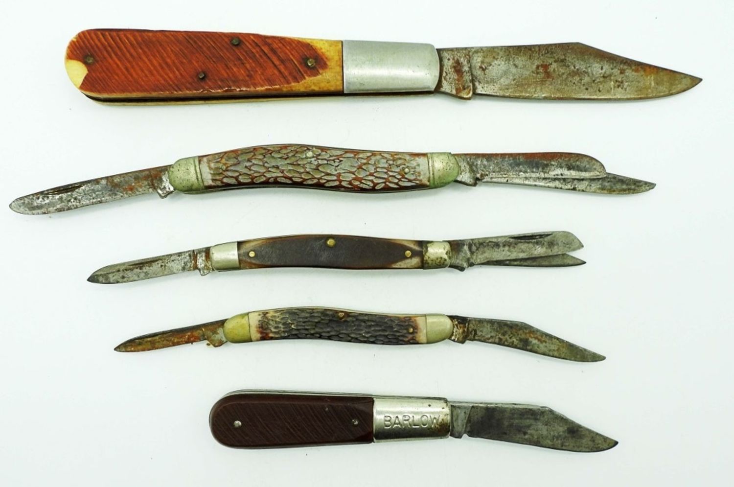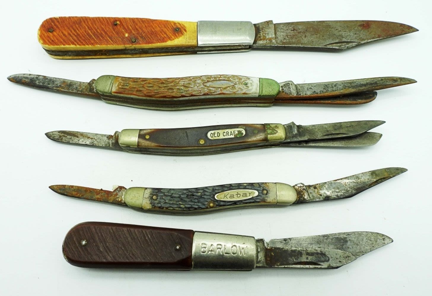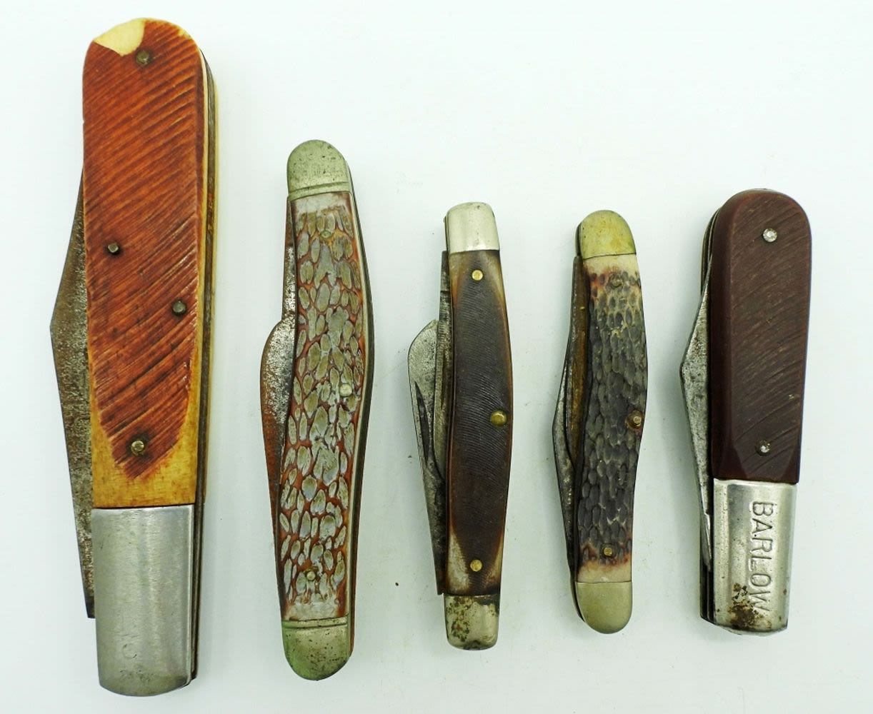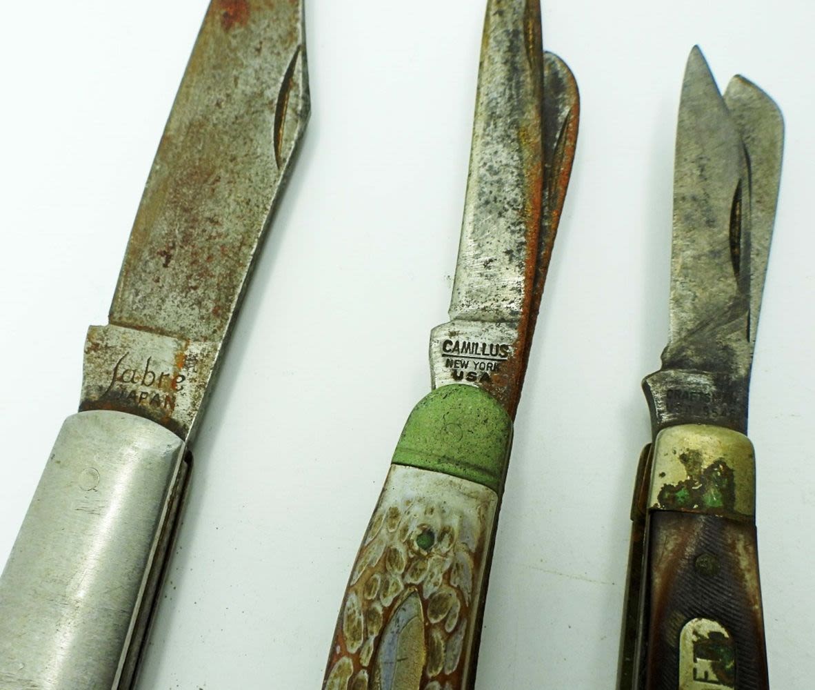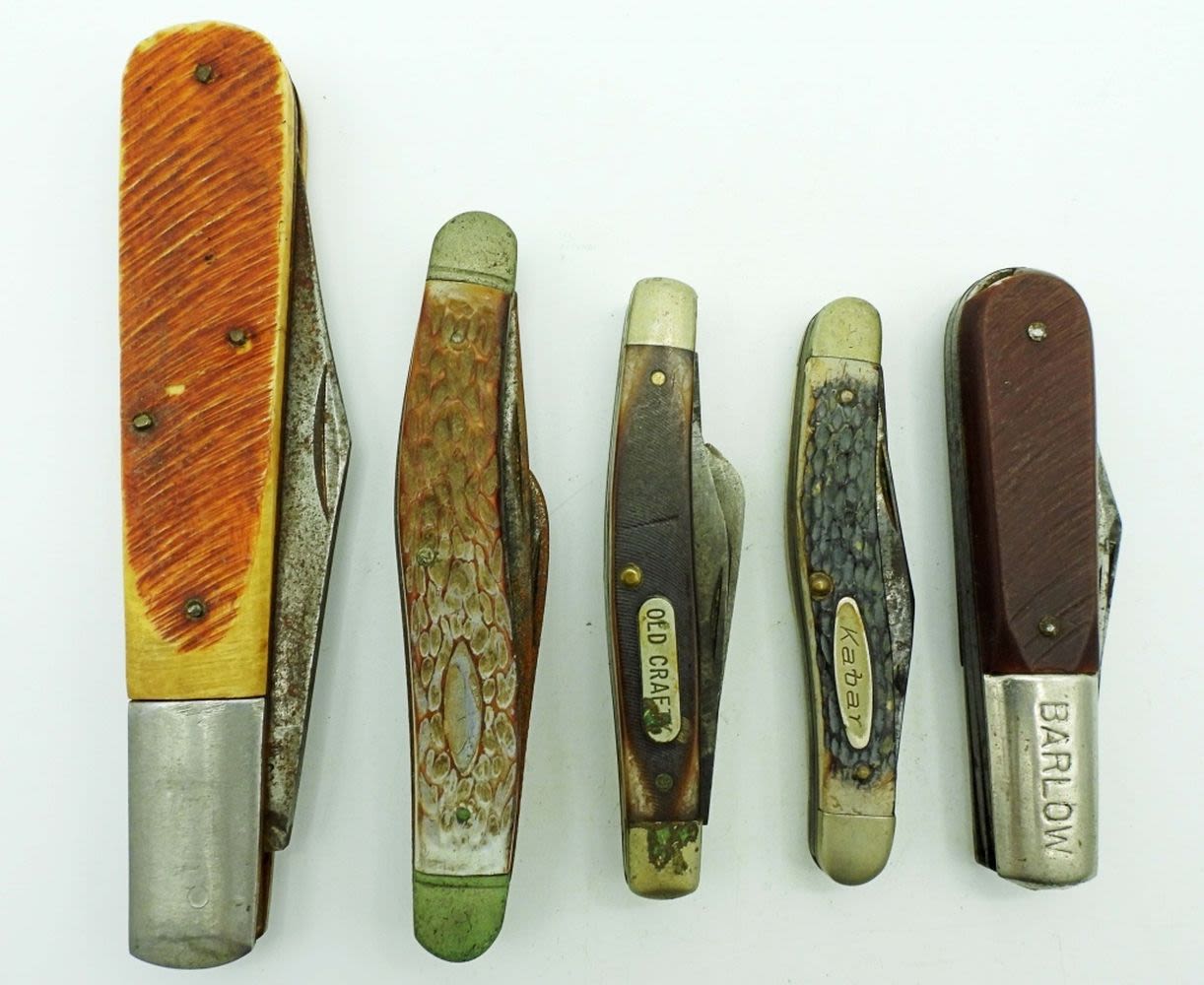 Single Blade Sabre 5″, 3 Blade Camillus New York USA 4″, 2 Blade Imperial USA Barlow 3 1/2″, 3 Blade Craftsman USA 9546 3 1/4″, 2 Blade Kabar 3 1/4″; All Used Conditions.