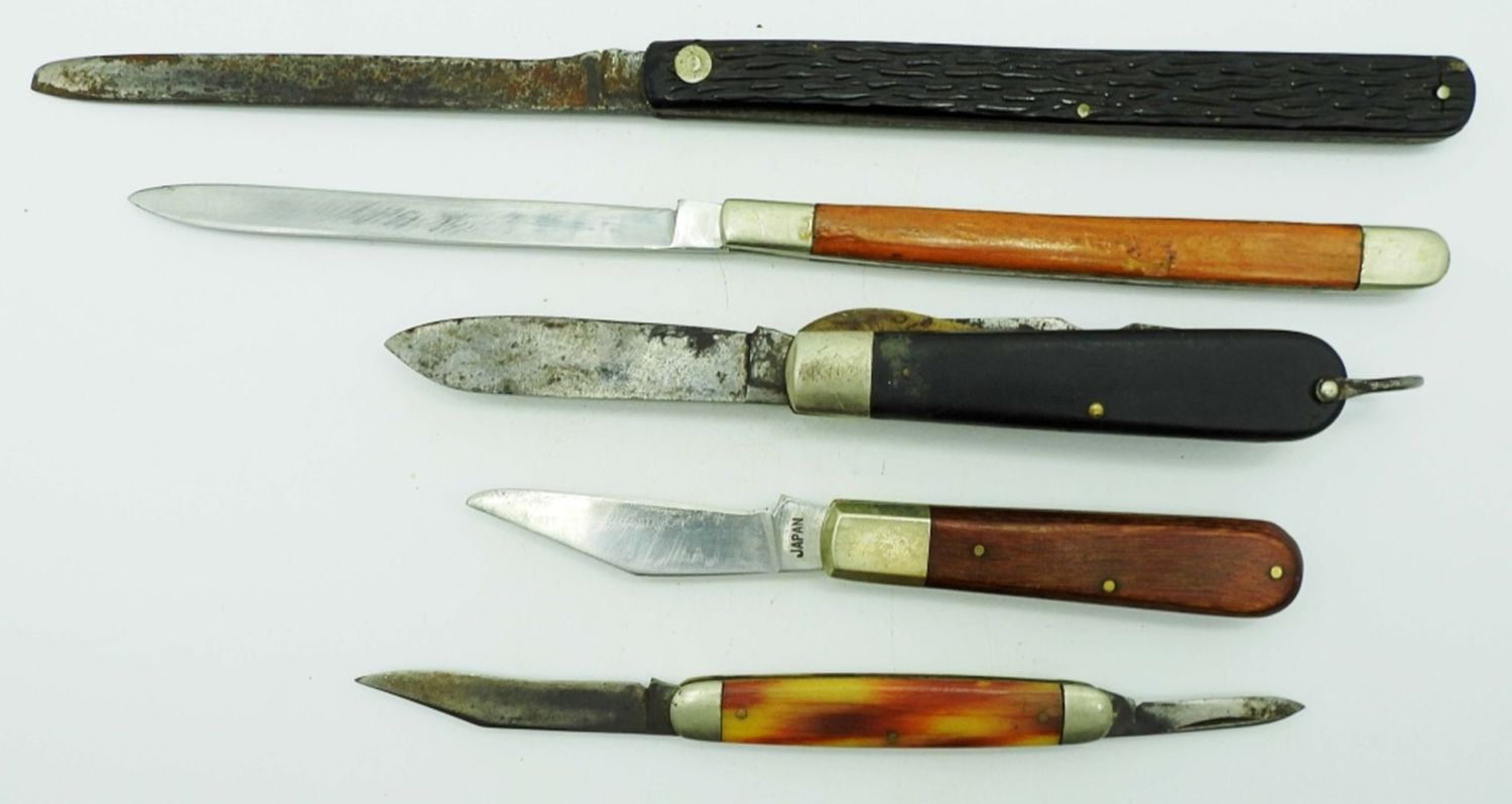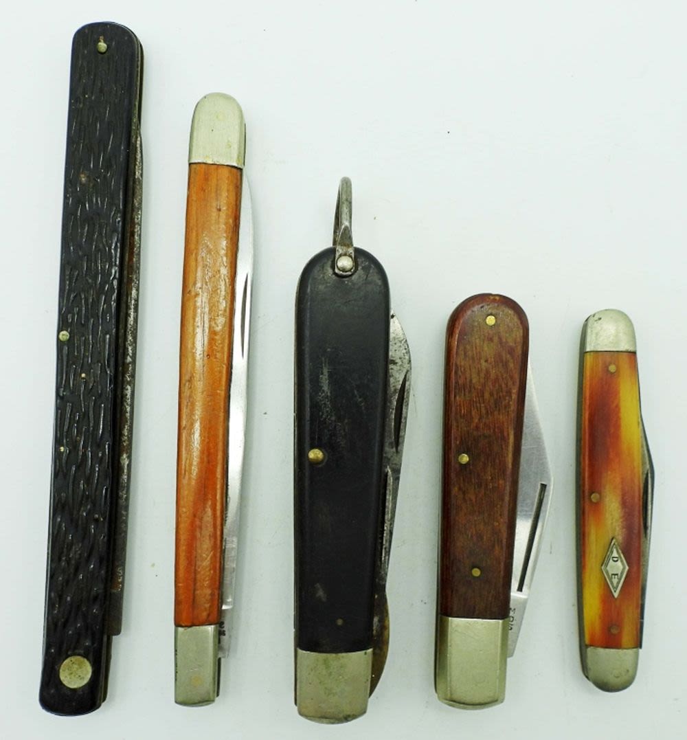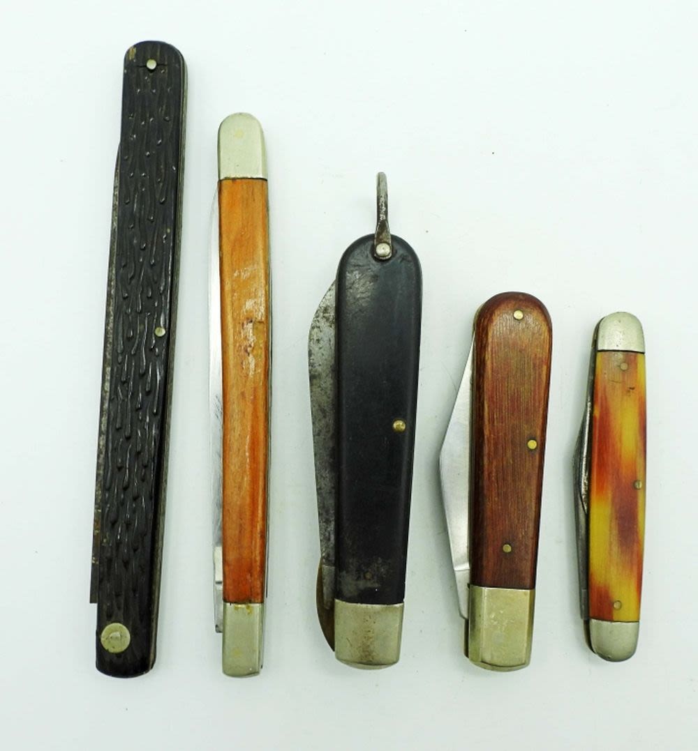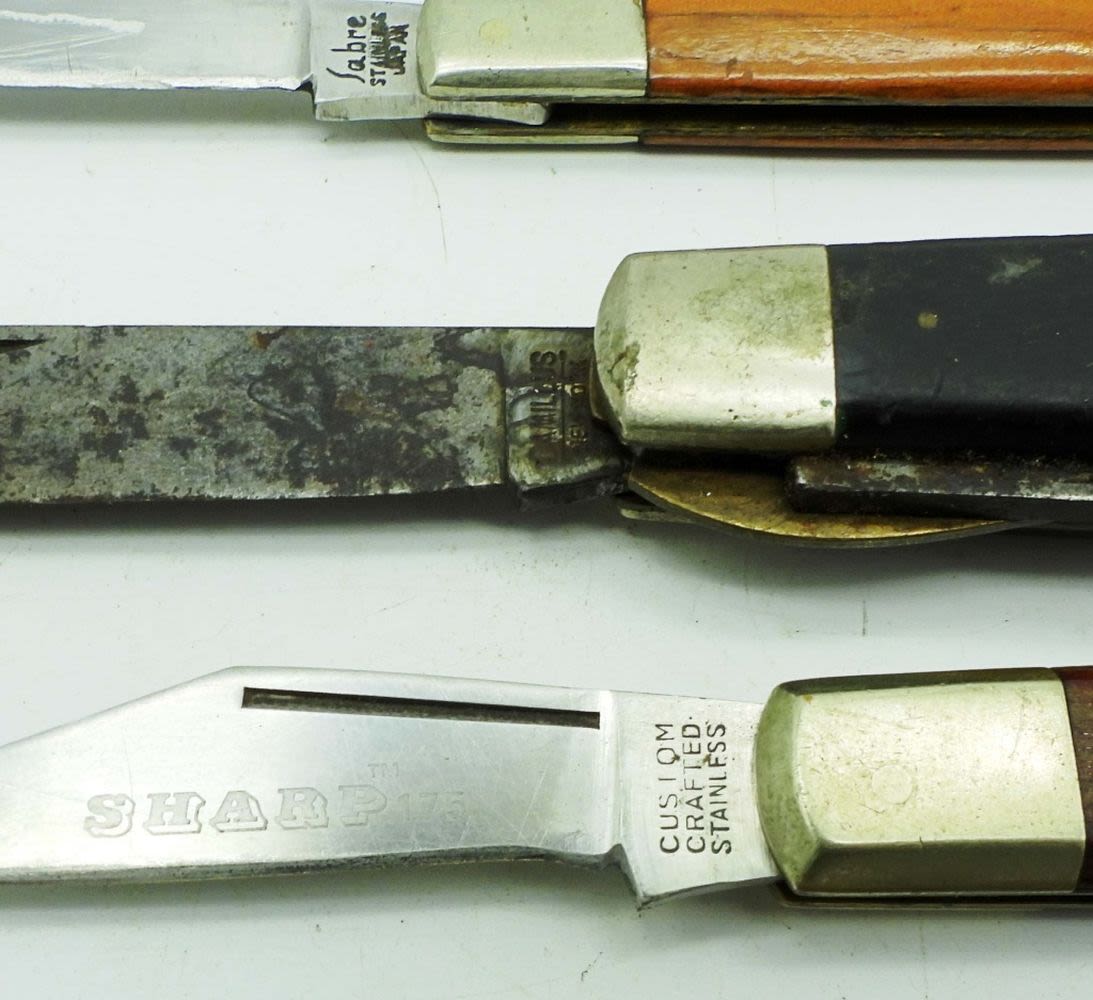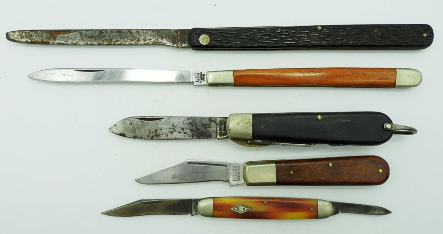 2 Blade Camillus New York, Single Blade Sharp 175, 2 Blade ShapLeigh D&E HDW. CO., Single Blade Schrade Cut Co., Single Blade Sabre; All Used Conditions.