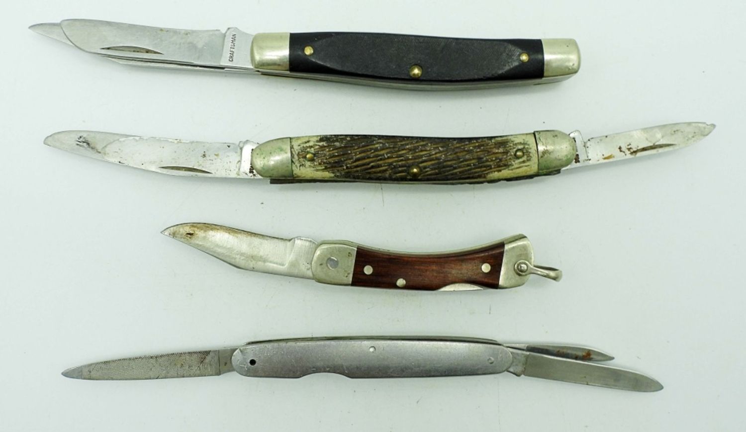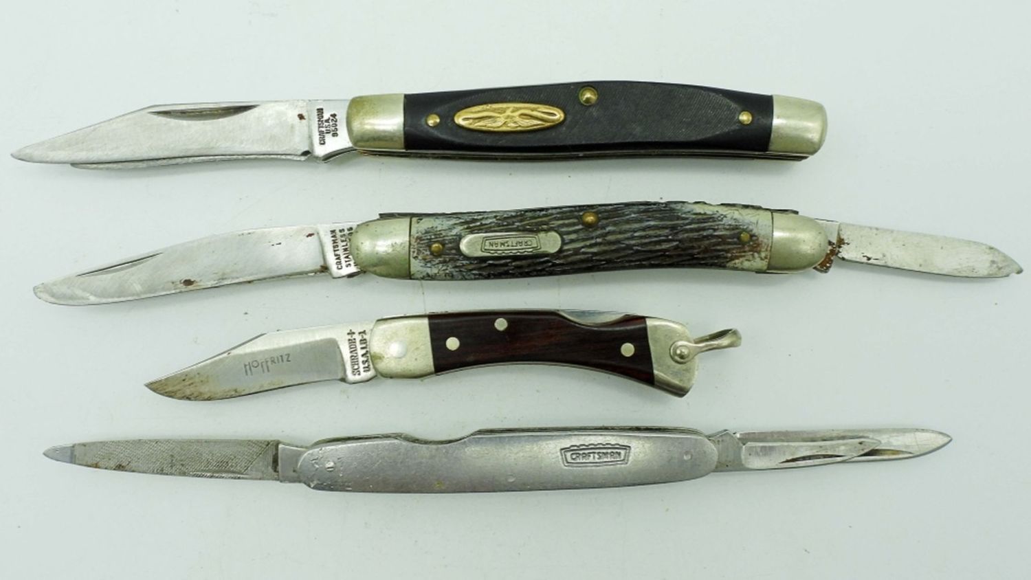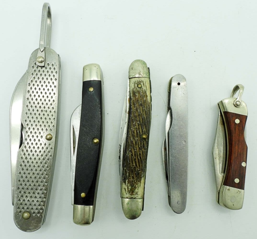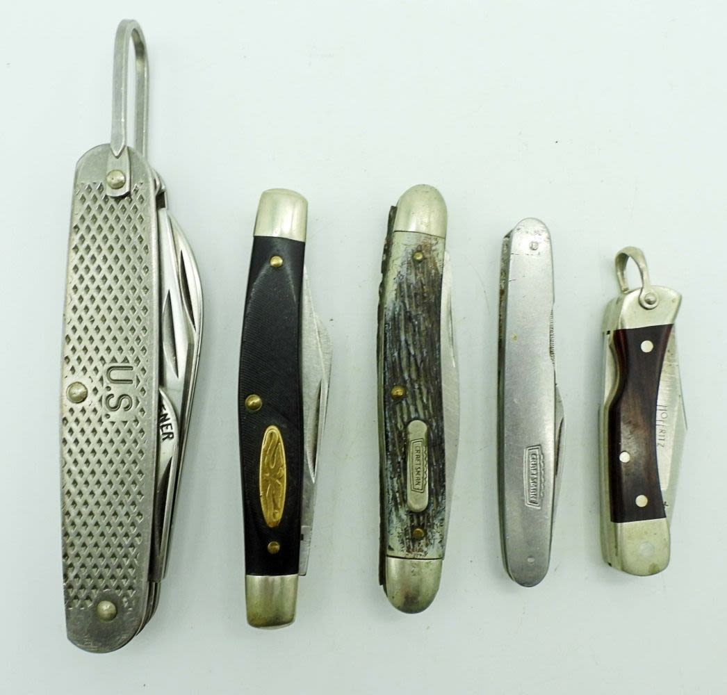 4 Blade US Camillus 1979, 2 Blade Craftsman USA 95024, 3 Blade Craftsman USA 9505, 3 Blade Craftsman USA 9558, Single Blade Schrade Hoffritz USA LB-1; All Used Conditions.