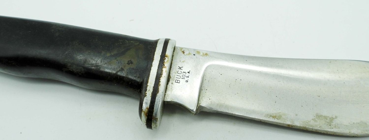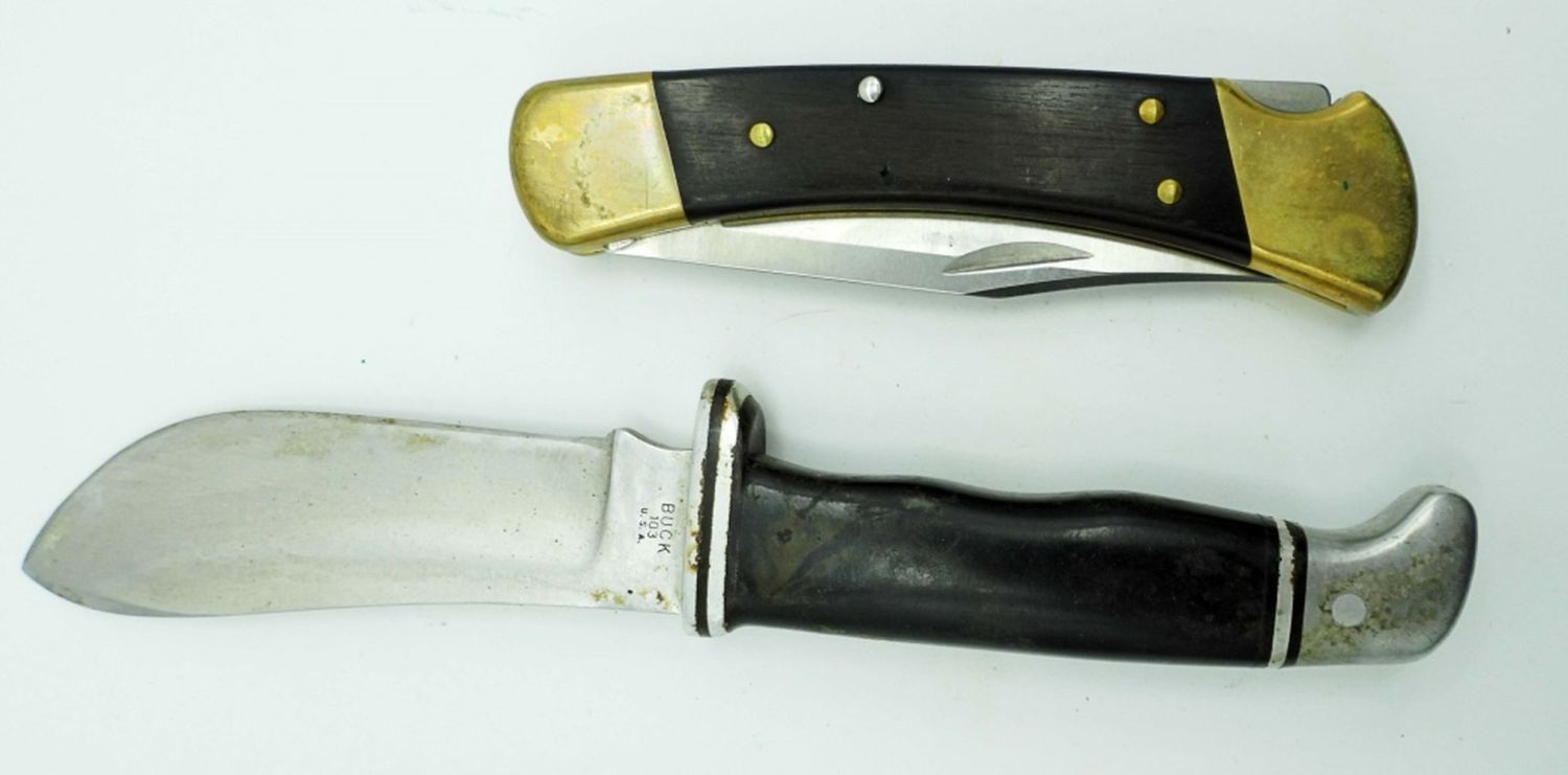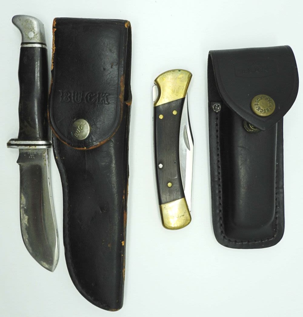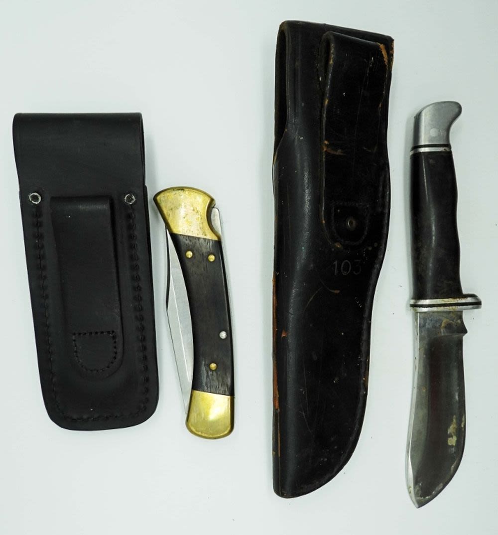 1972-86 Buck 103 USA Fixed Blade Knife & Leather Holder, 2020 110 Buck Folding Knife with Leather Holder (Like New Condition).